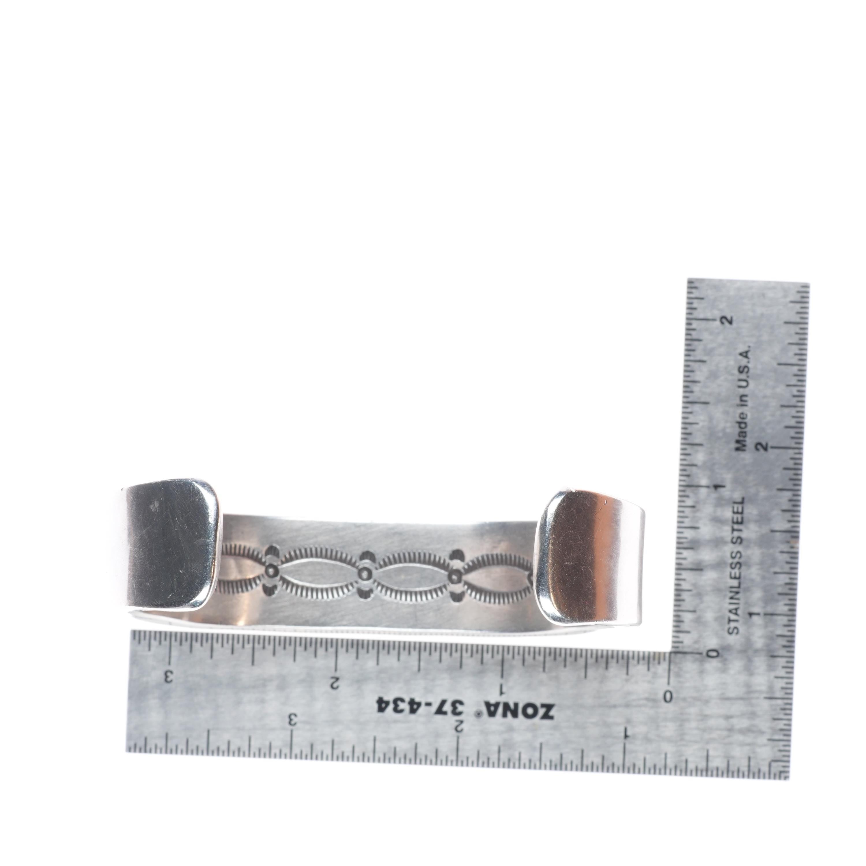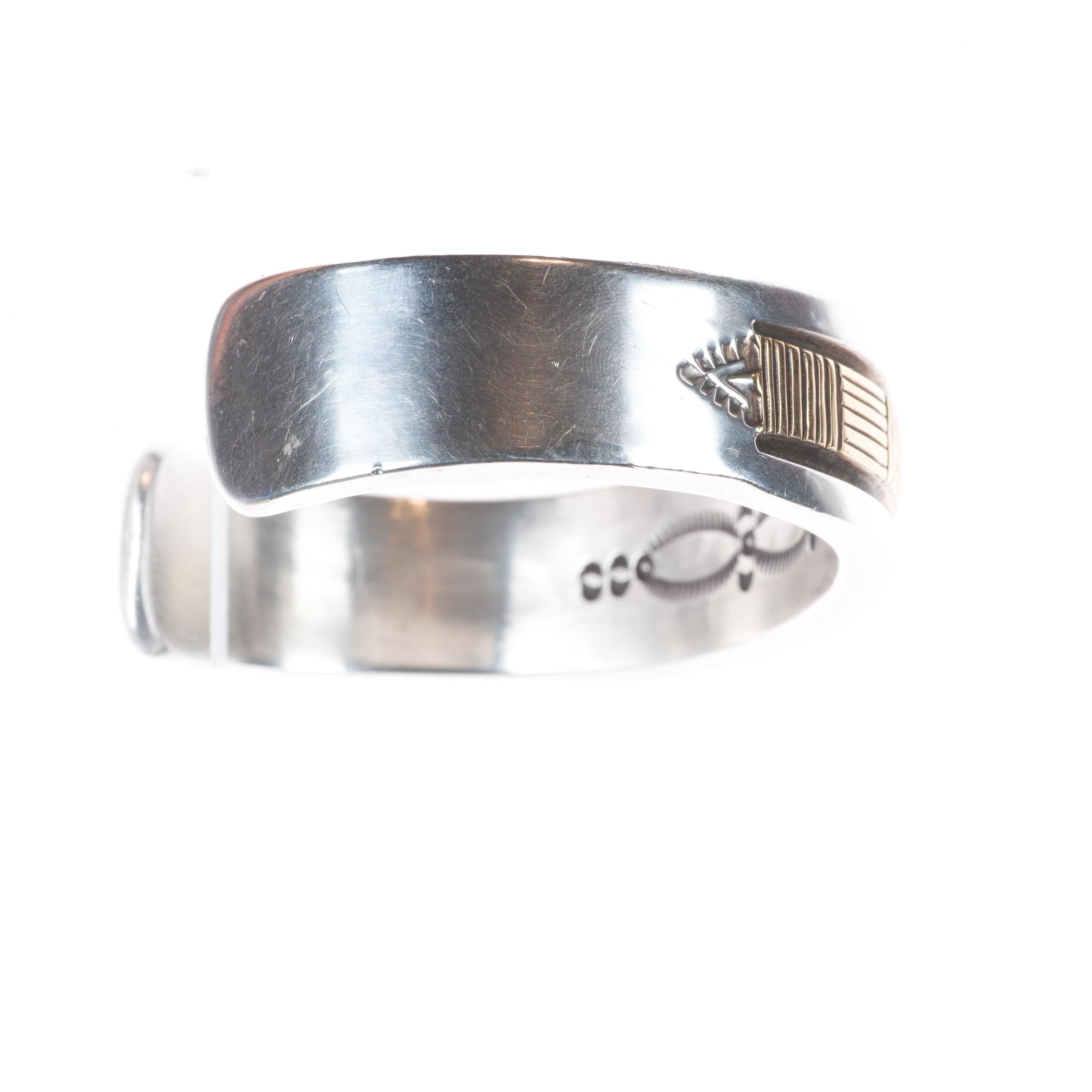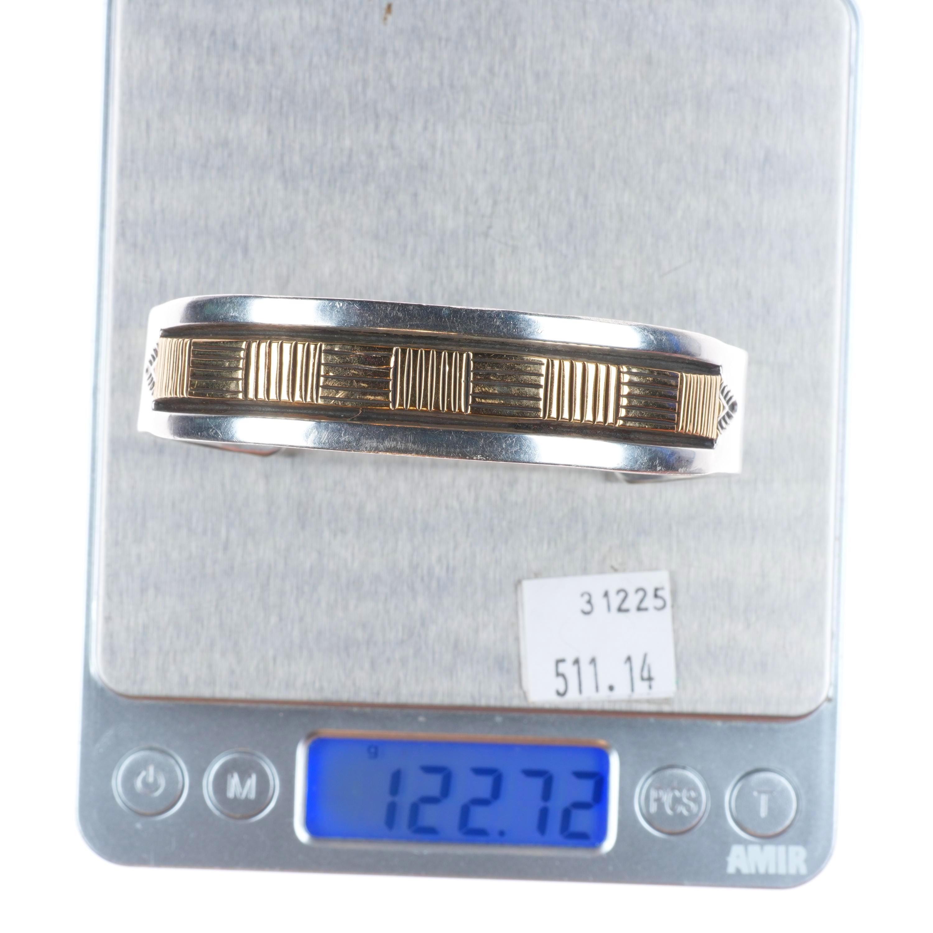7.5" Heavy Bruce Morgan Navajo 14k gold/sterling silver cuff bracelet. Tested and guaranteed solid sterling silver with weight and measurements in pictures. Circa last quarter of the 20th century with age appropriate wear.. 7.5"