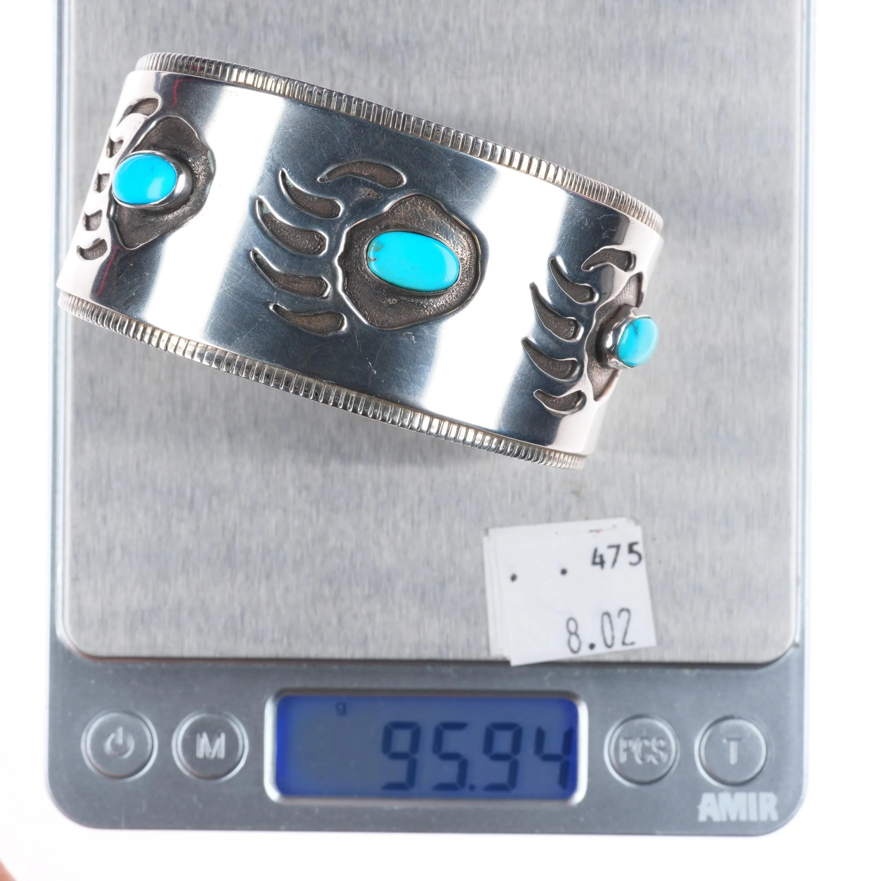 7.6" Big Vintage Navajo Overlay bear paw sterling silver turquoise cuff bracelet