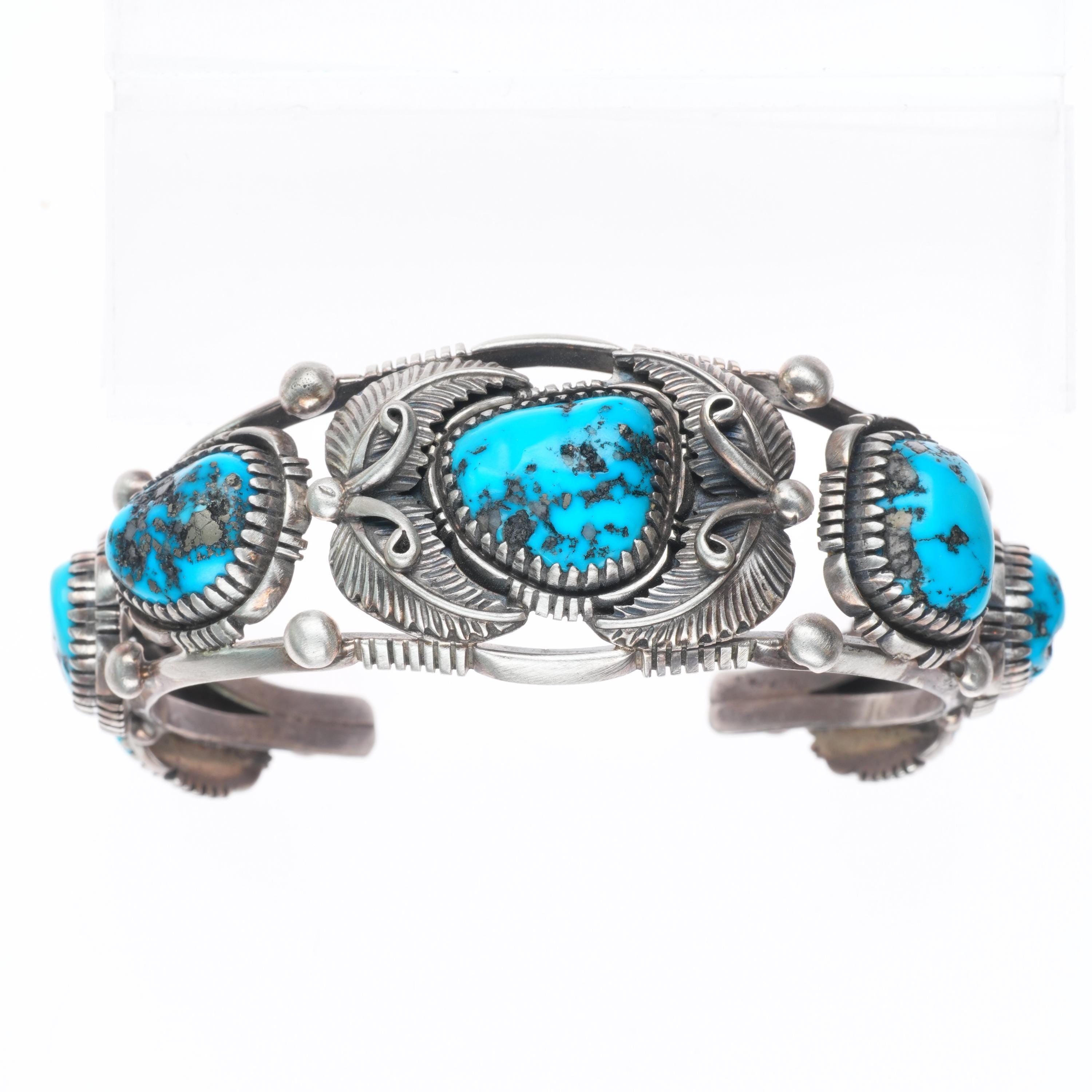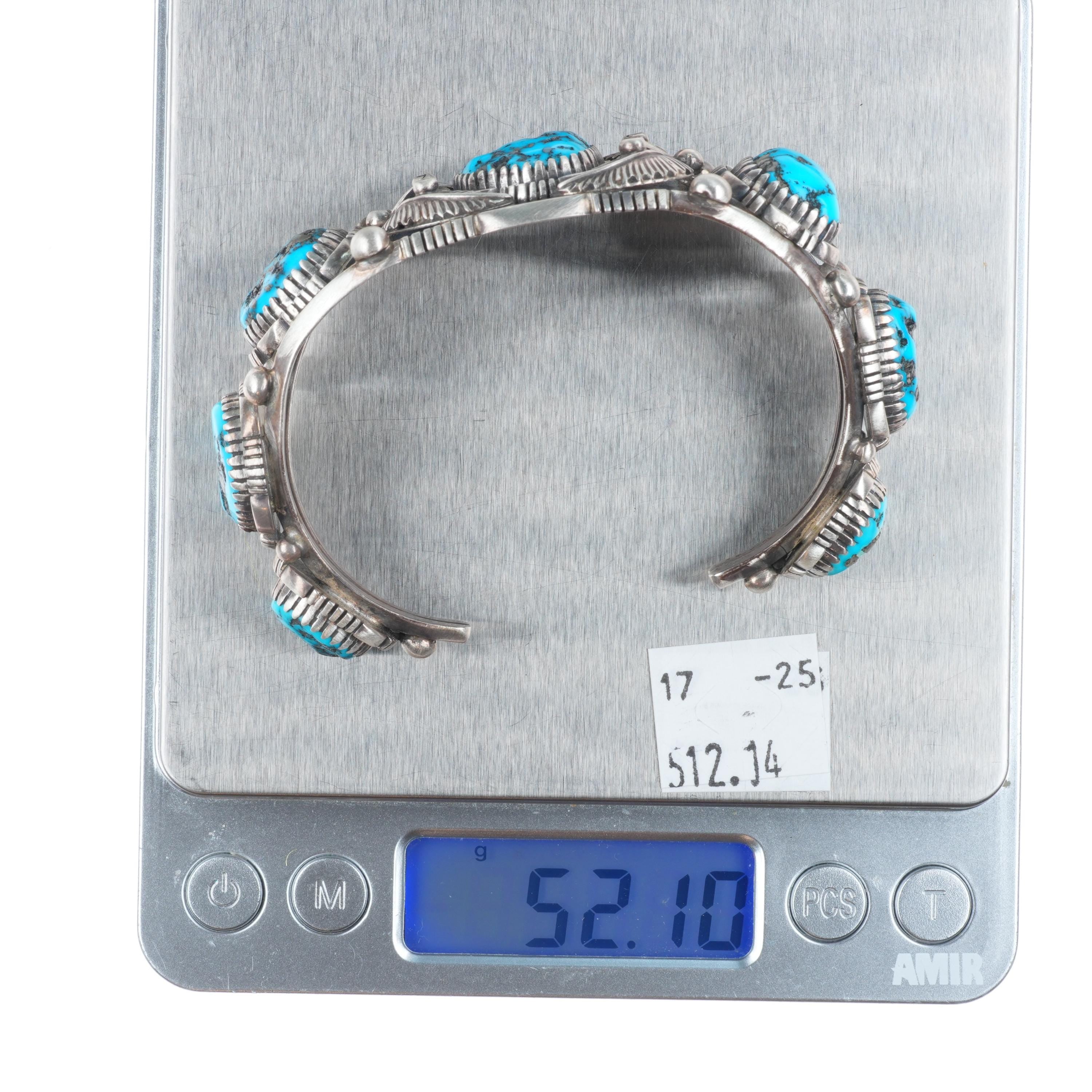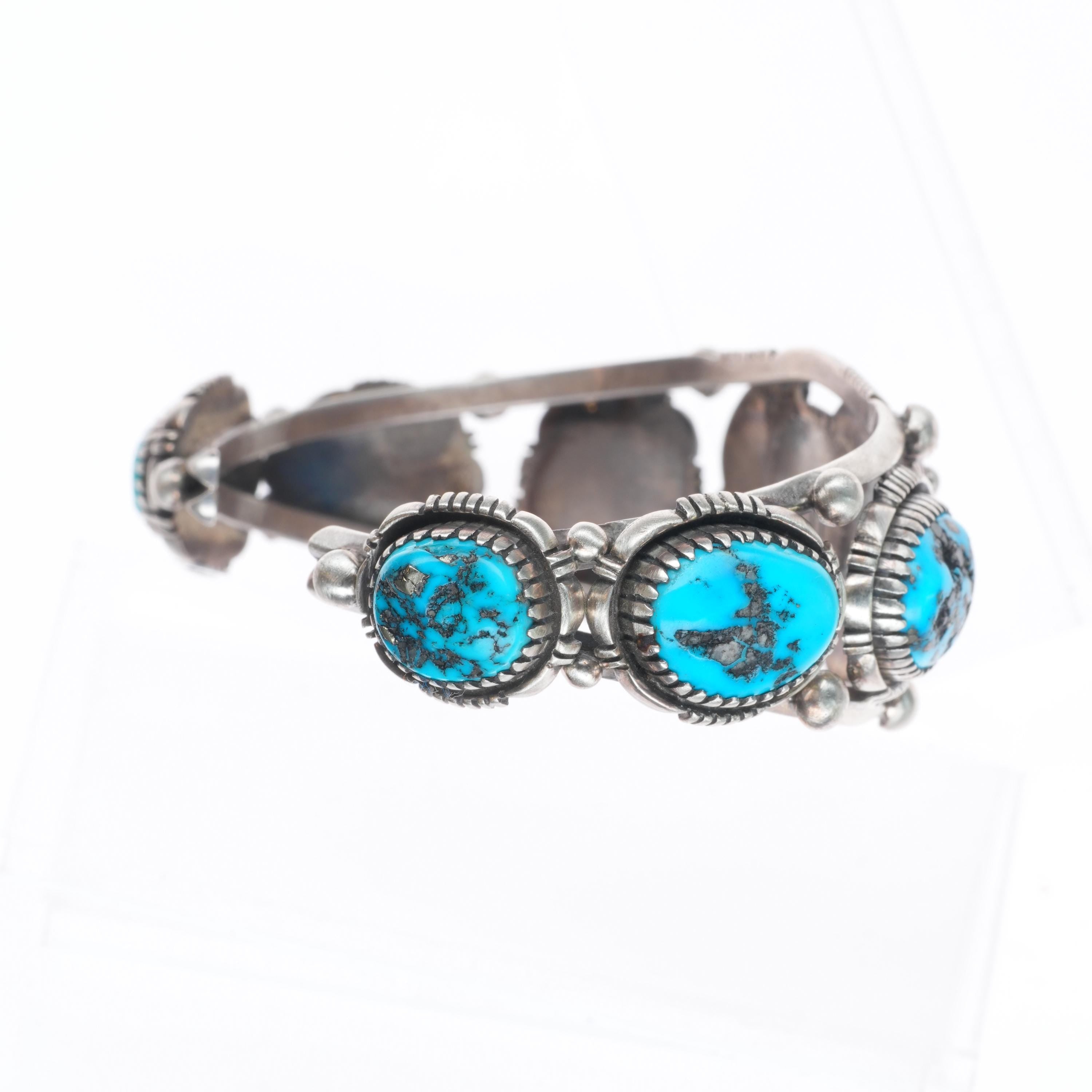 7" Vintage LF Navajo sterling silver featherwork turquoise row cuff bracelet. Tested and guaranteed solid sterling silver with weight and measurements in pictures. Great condition with age appropriate wear, circa last quarter of the 20th century.