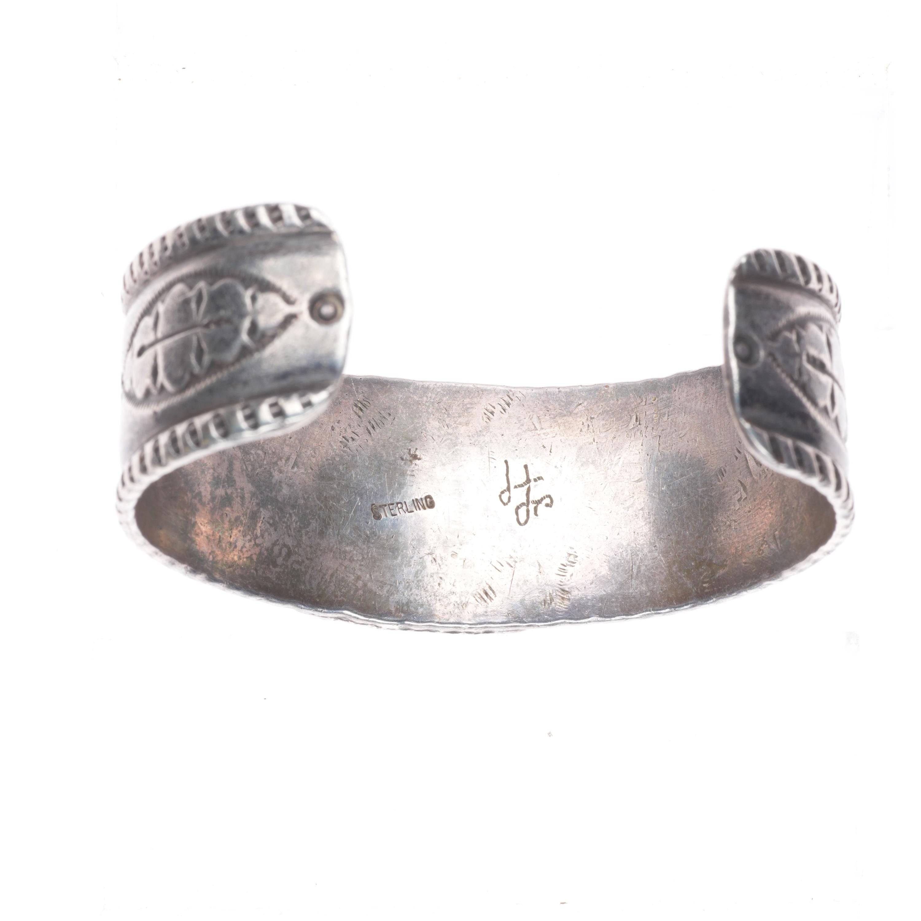 7" Vintage Navajo Revival stamped sterling silver turquoise cuff bracelet. Tested and guaranteed solid sterling silver with weight and measurements in pictures. Overall expected wear circa third quarter of the 20th century. Secure fractures in stone, marked as shown.