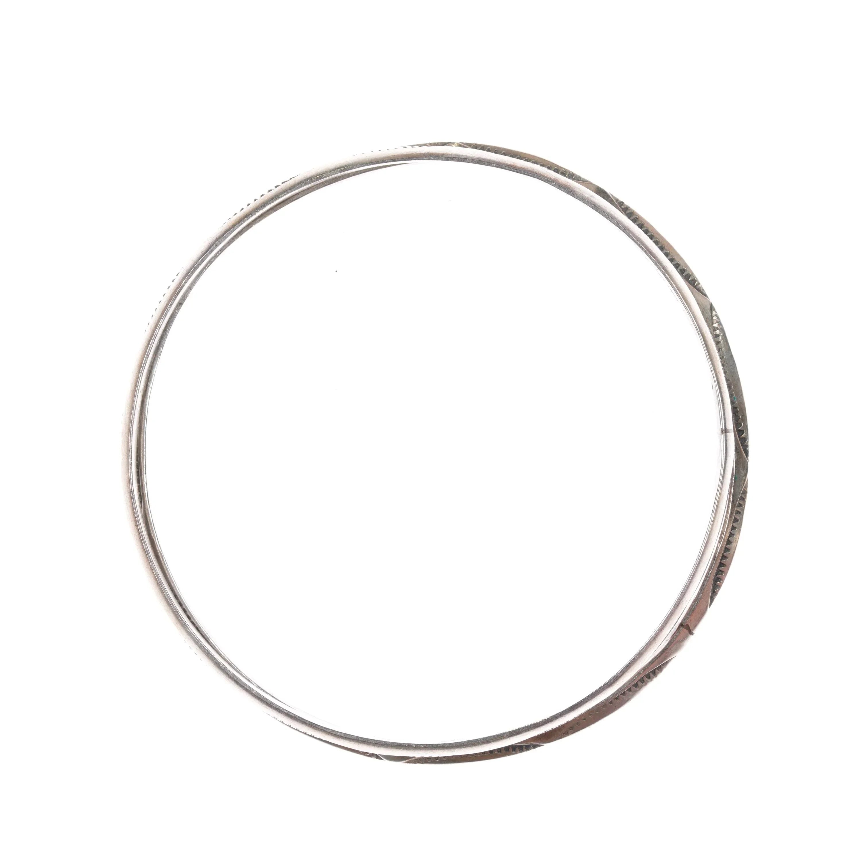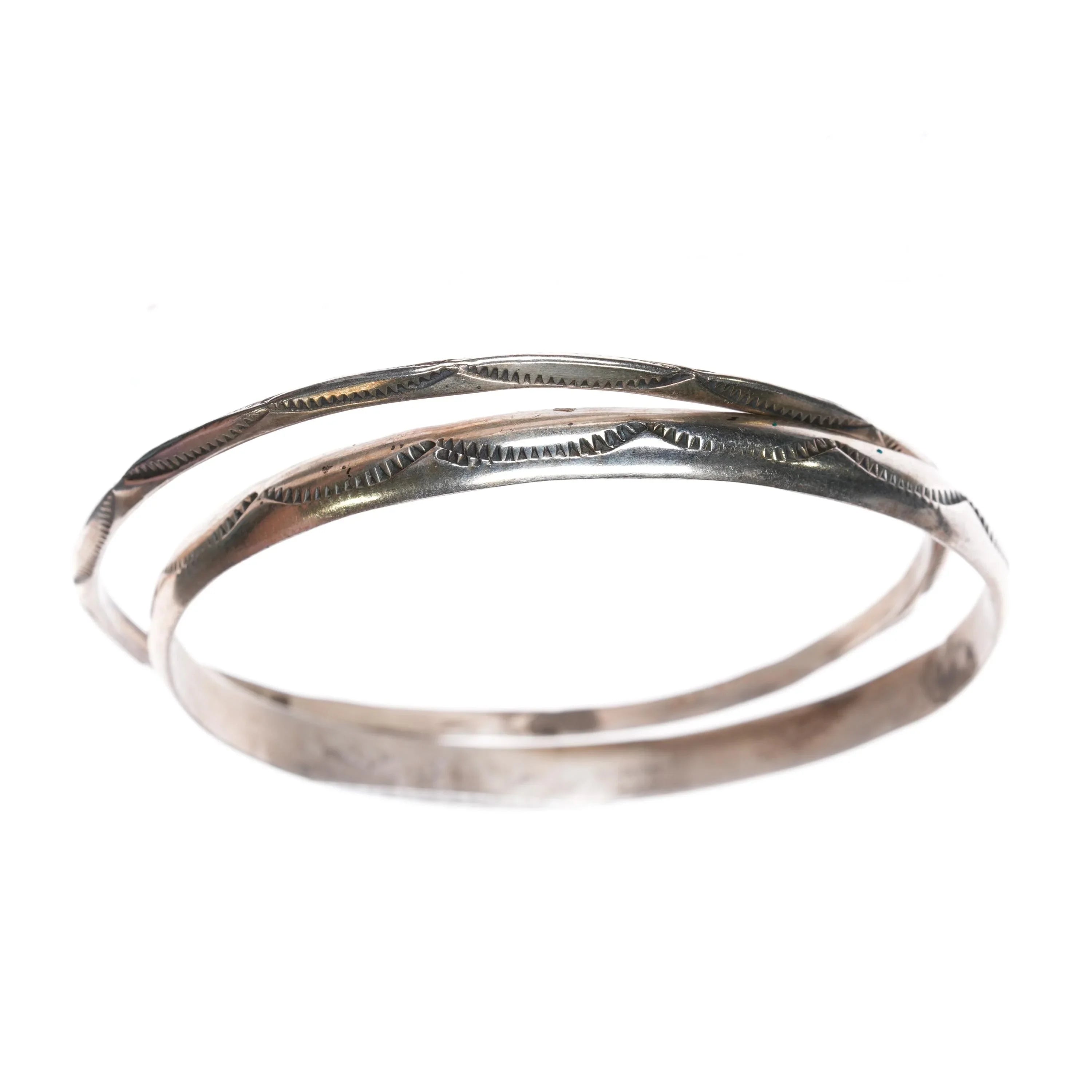 8" 2 Vintage Navajo sterling bangle bracelets. No issues, solid sterling, weight and measurements in pictures. Marked sterling with no other markings.