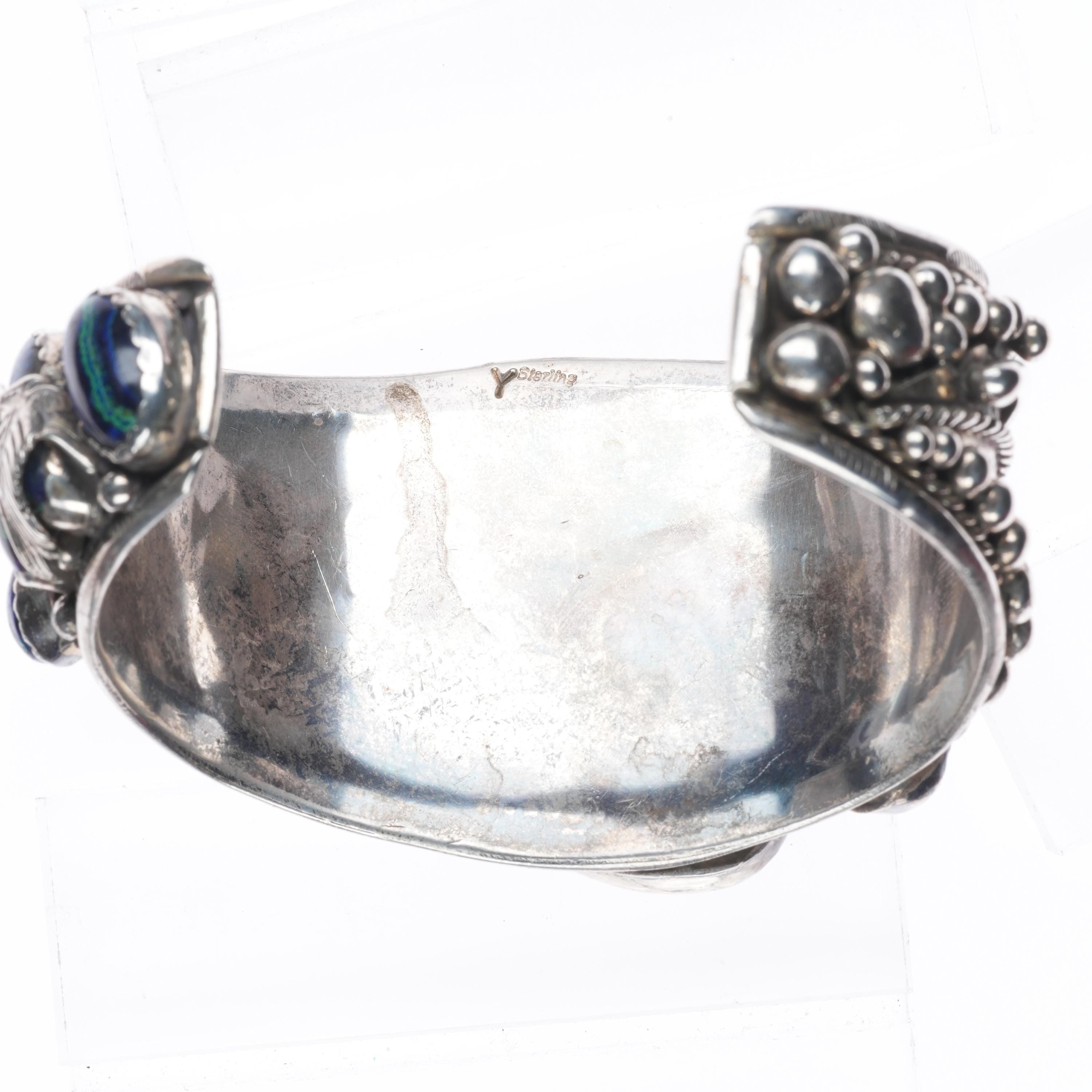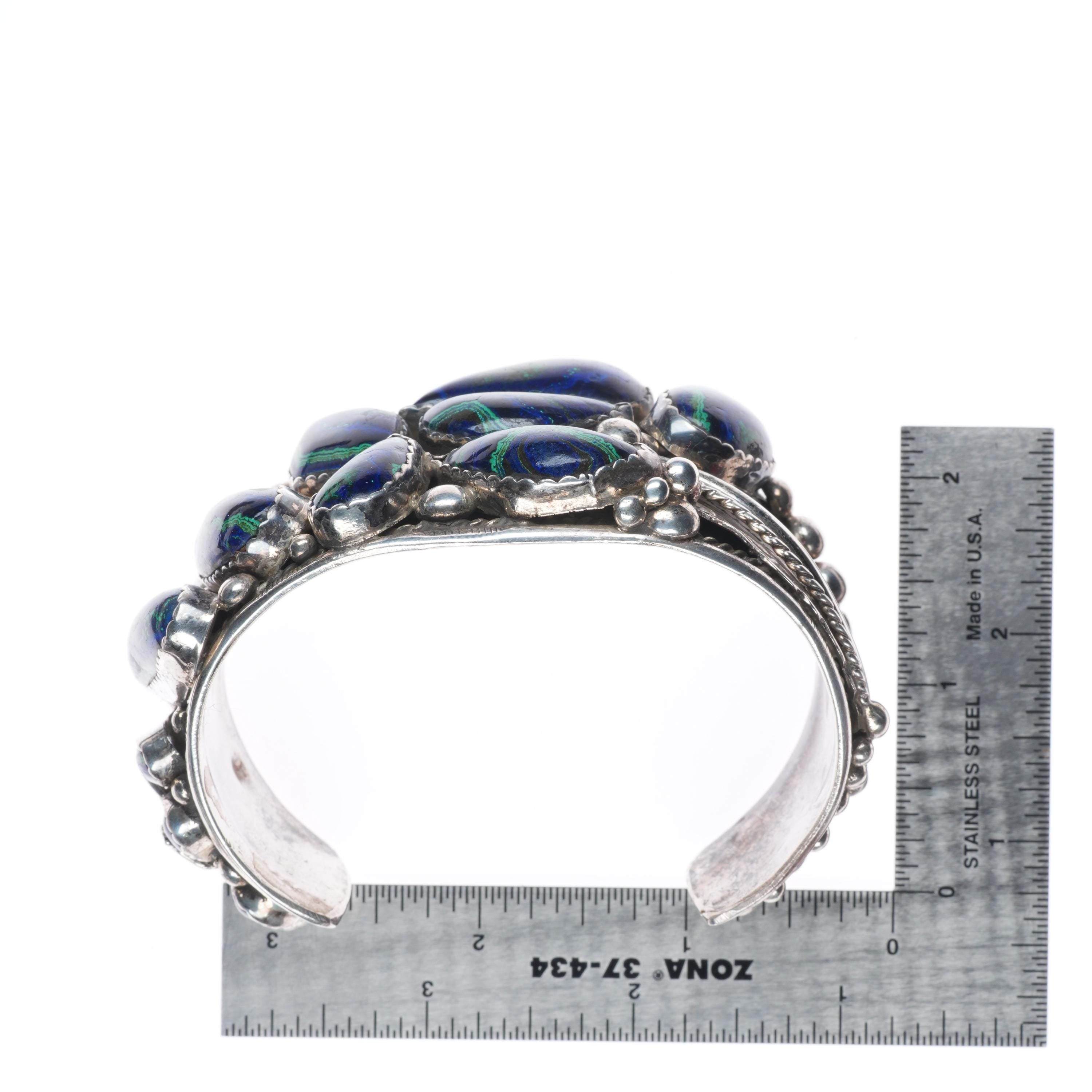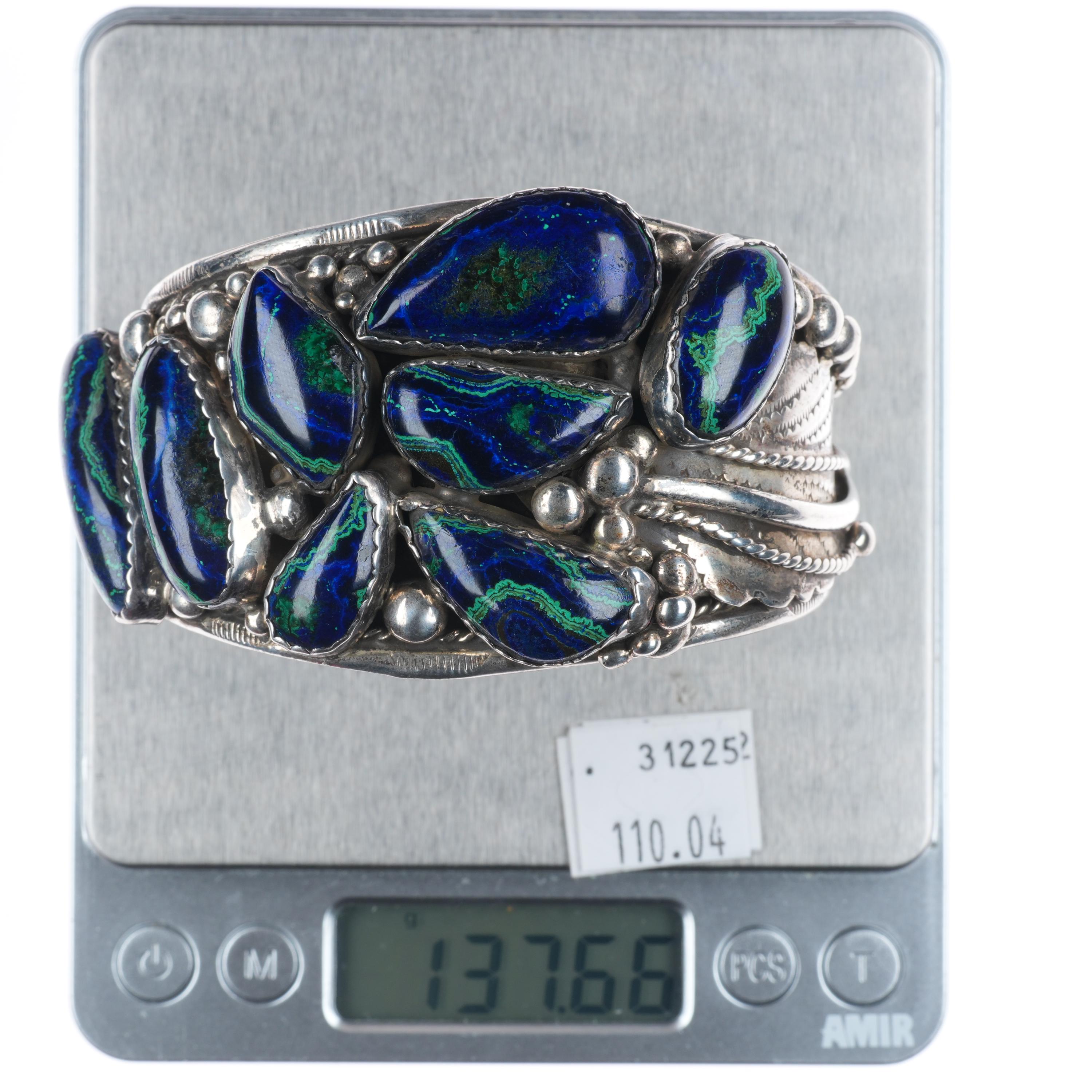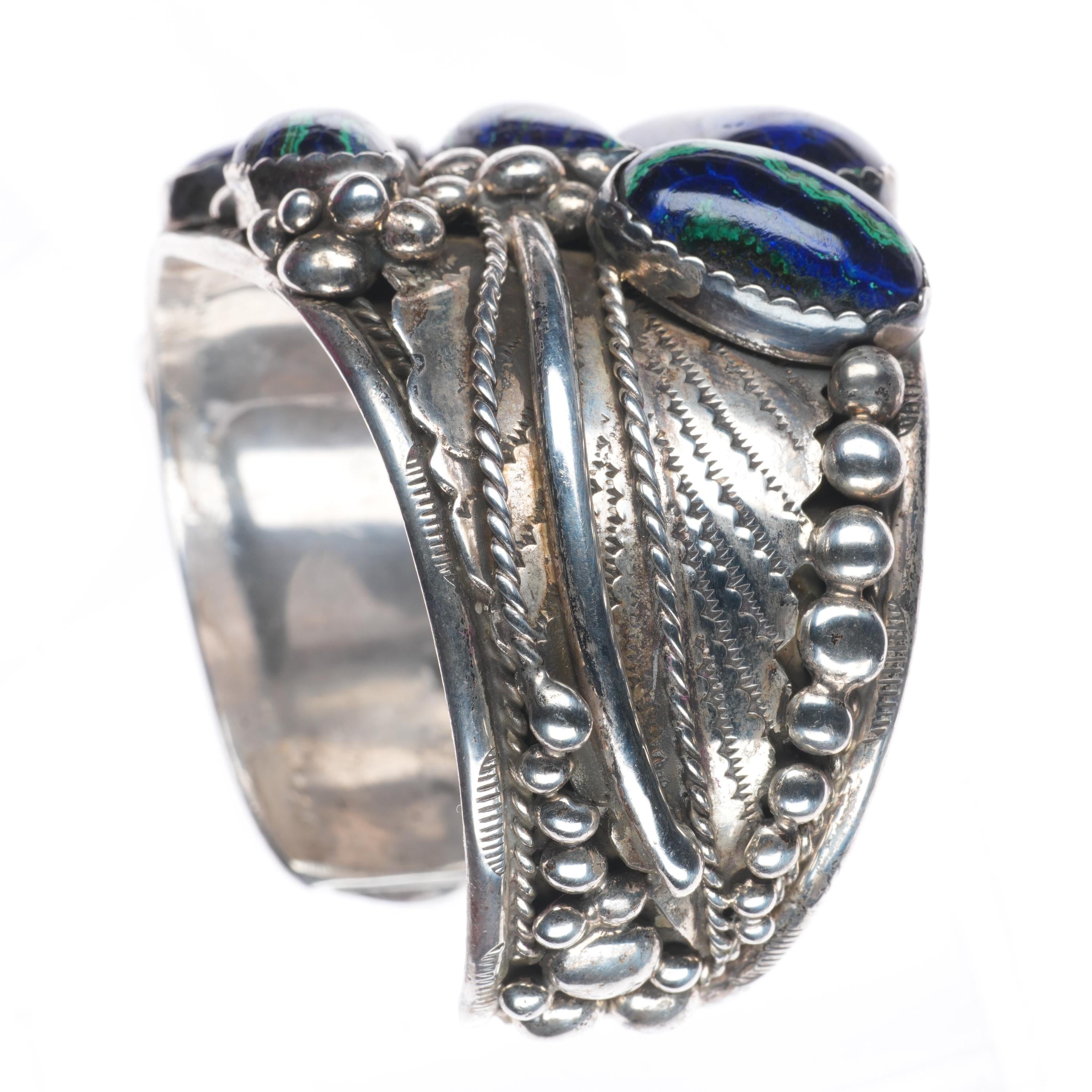 8" Tom Yazzie Navajo Vintage Azurite Huge sterling silver heavy cuff bracelet. Tested and guaranteed solid sterling silver with weight and measurements in pictures. Circa last quarter of the 20th century. Fits up to a 8" wrist without adjustment, though .25" or more of careful adjustment is typically very simple. Any adjustment will change the gap size of course which is shown in the pictures. This bracelet could easily be taken down to a 7.75" or so, I would be happy to do it before shipping.