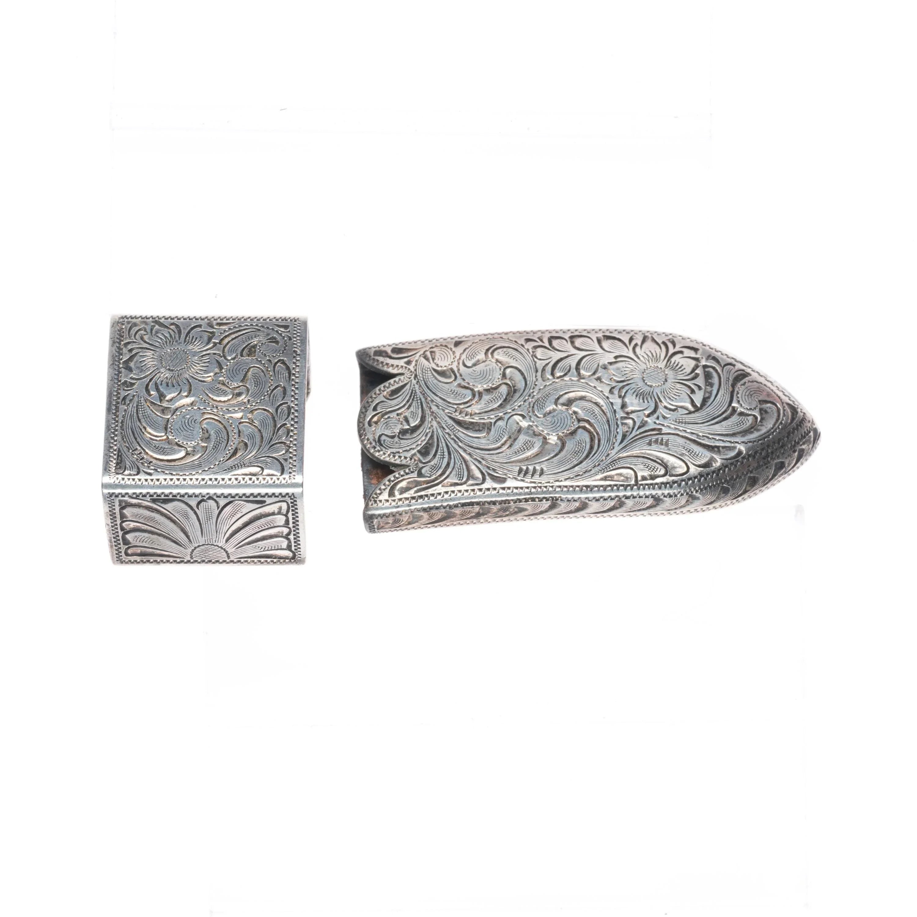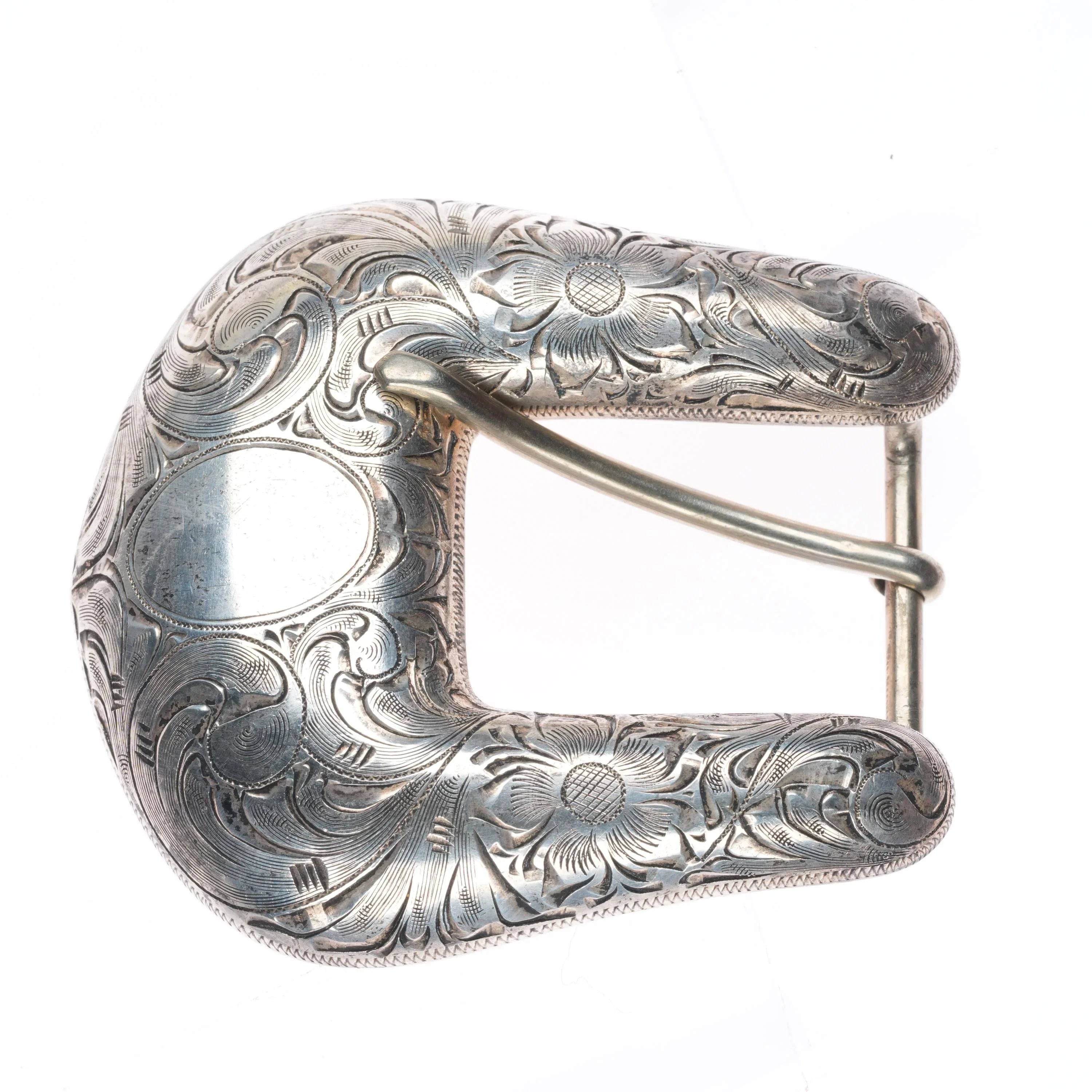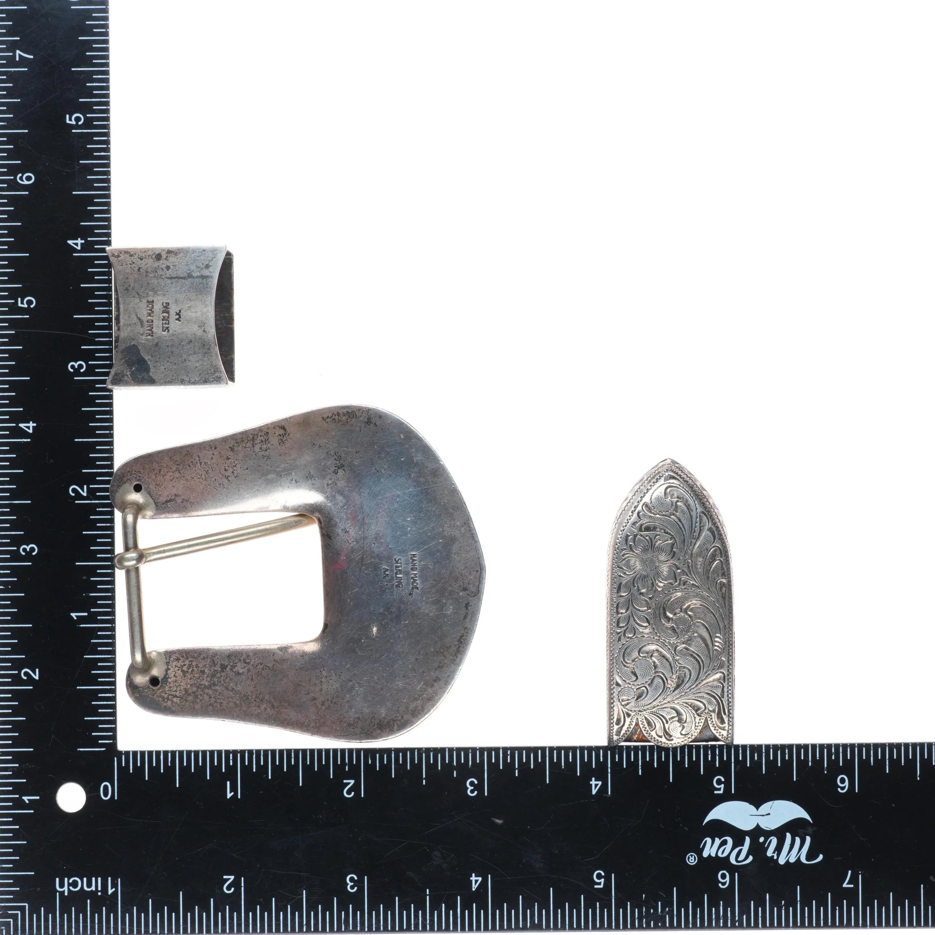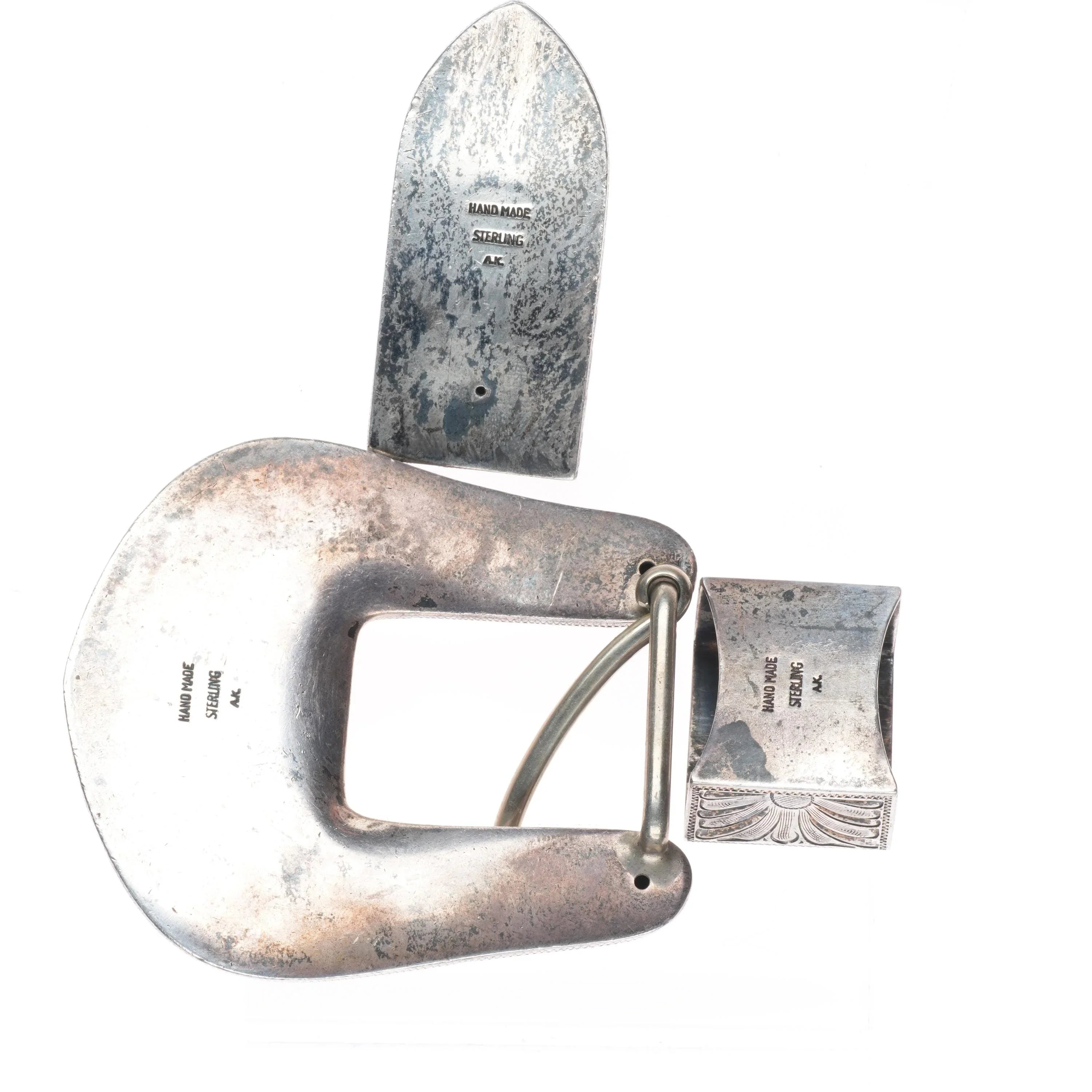 Ahmad Khan 1" Hand Engraved sterling silver ranger belt buckle set. Solid sterling silver (tested) with weight and measurements in pictures.. Fits a 1" belt. No issues, some expected wear. Ranger belts are typically wider and taper down to 3/4" where the buckle and tip go on.