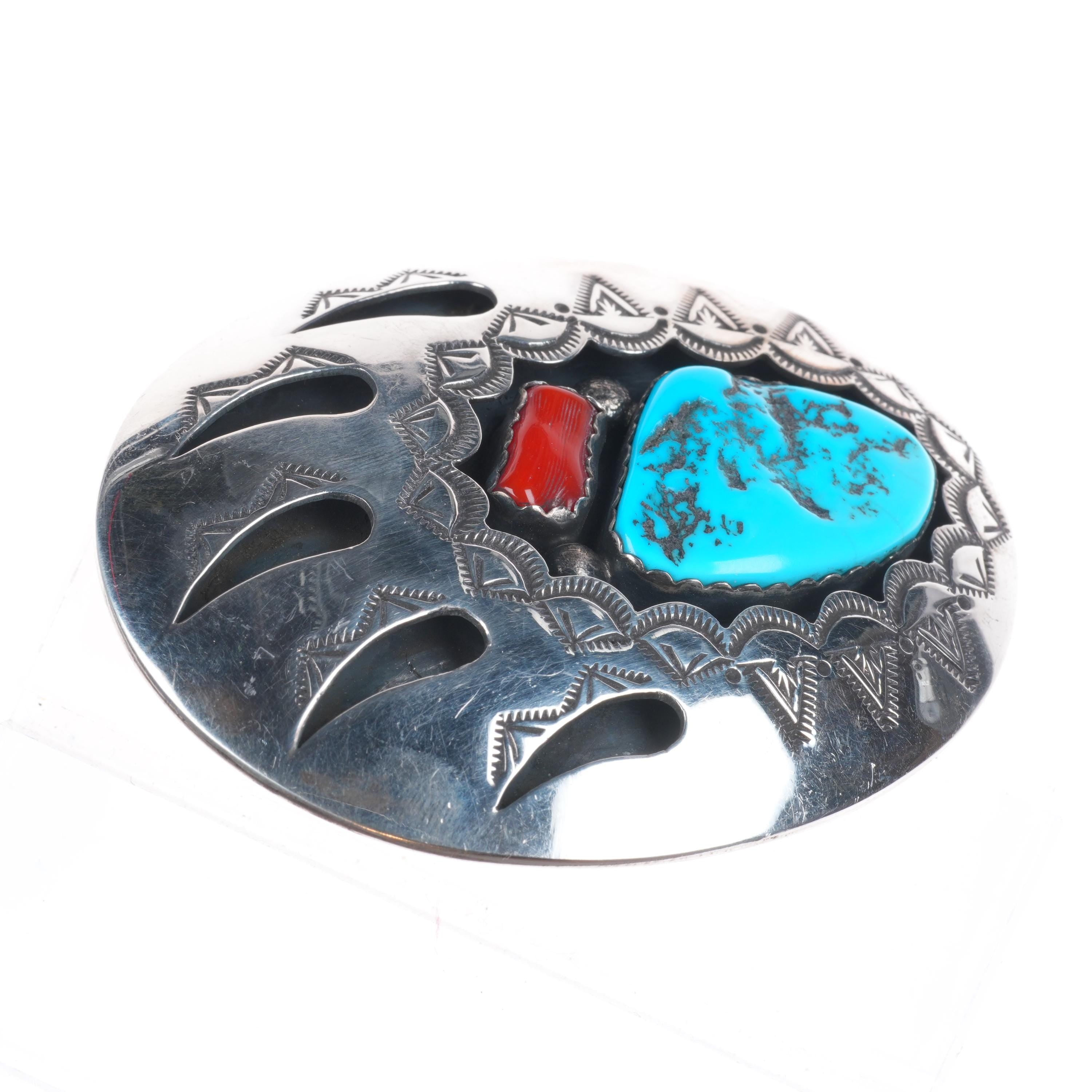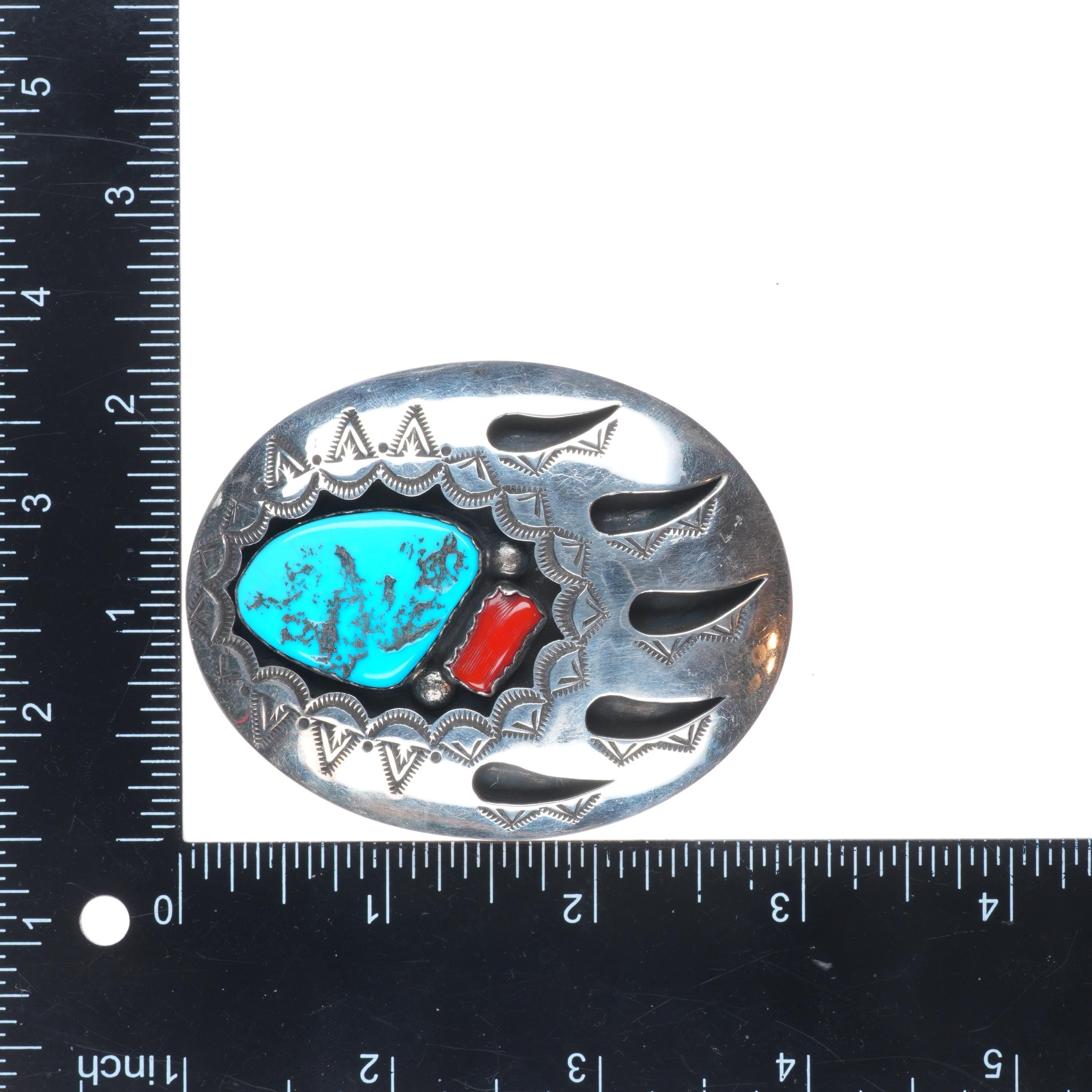 Arnold Goodluck Navajo sterling silver bear paw turquoise/coral belt buckle Tested and guaranteed solid sterling silver. Weight and measurements in pictures, circa third quarter of the 20th century. Fits a 1.5" belt.