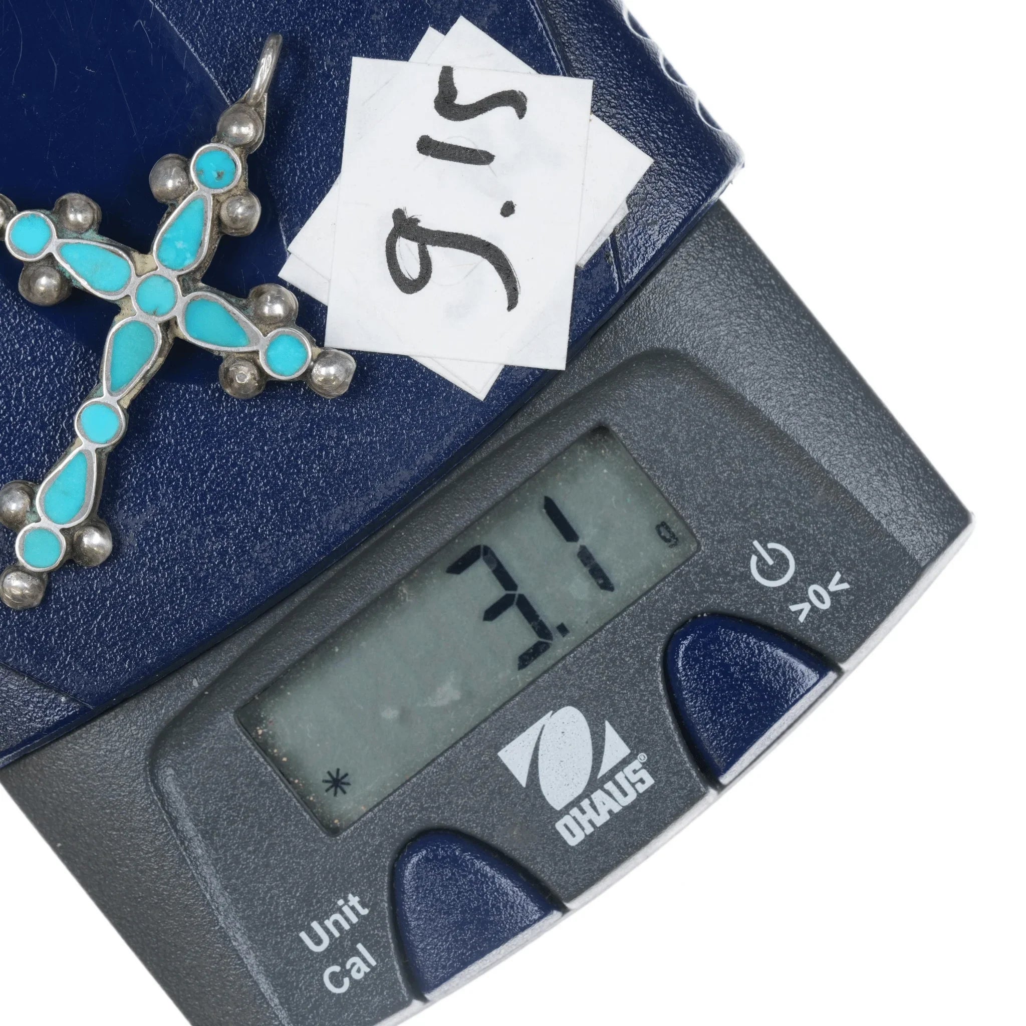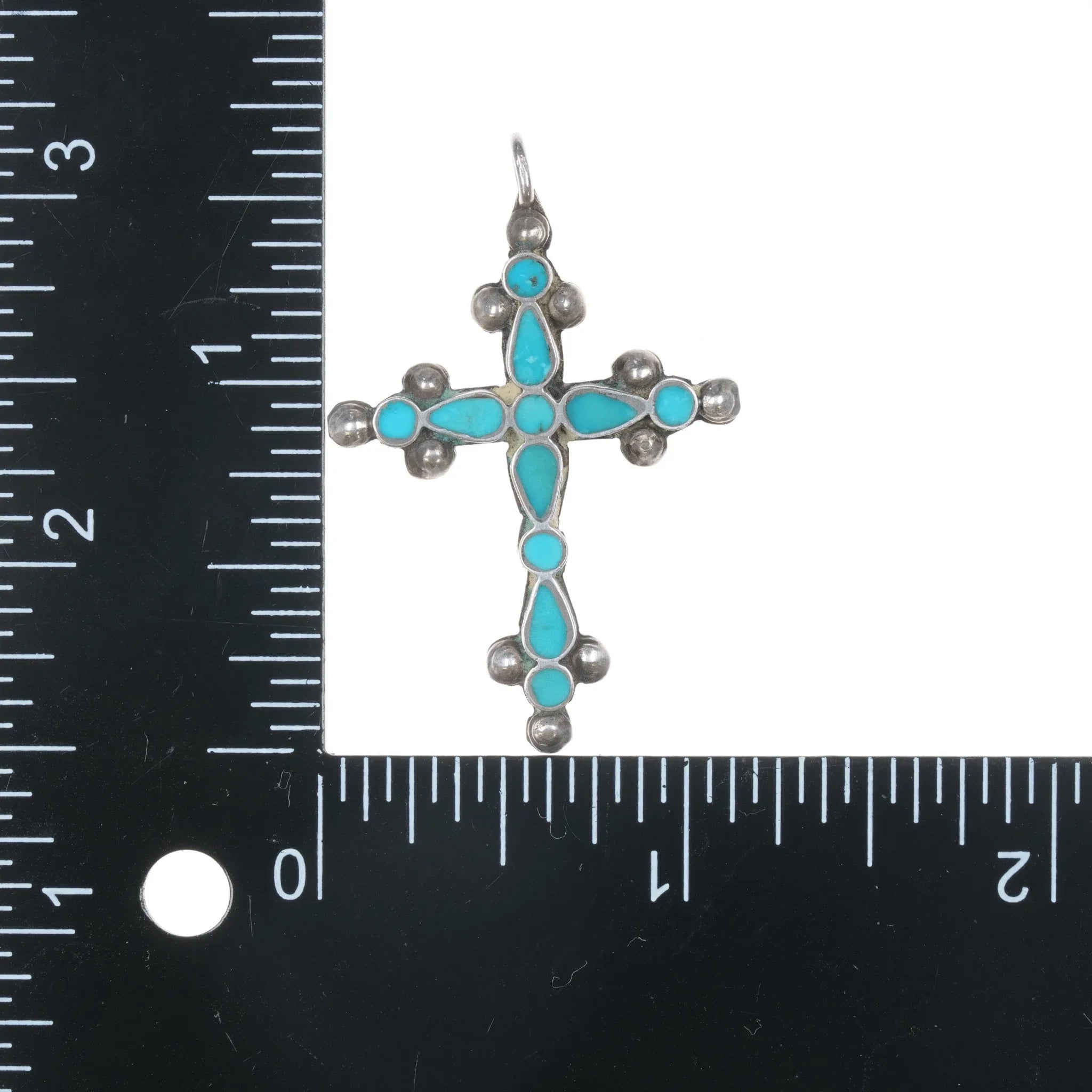 c1940's Frank Dishta Zuni silver Cross pendant flush inlay turquoise