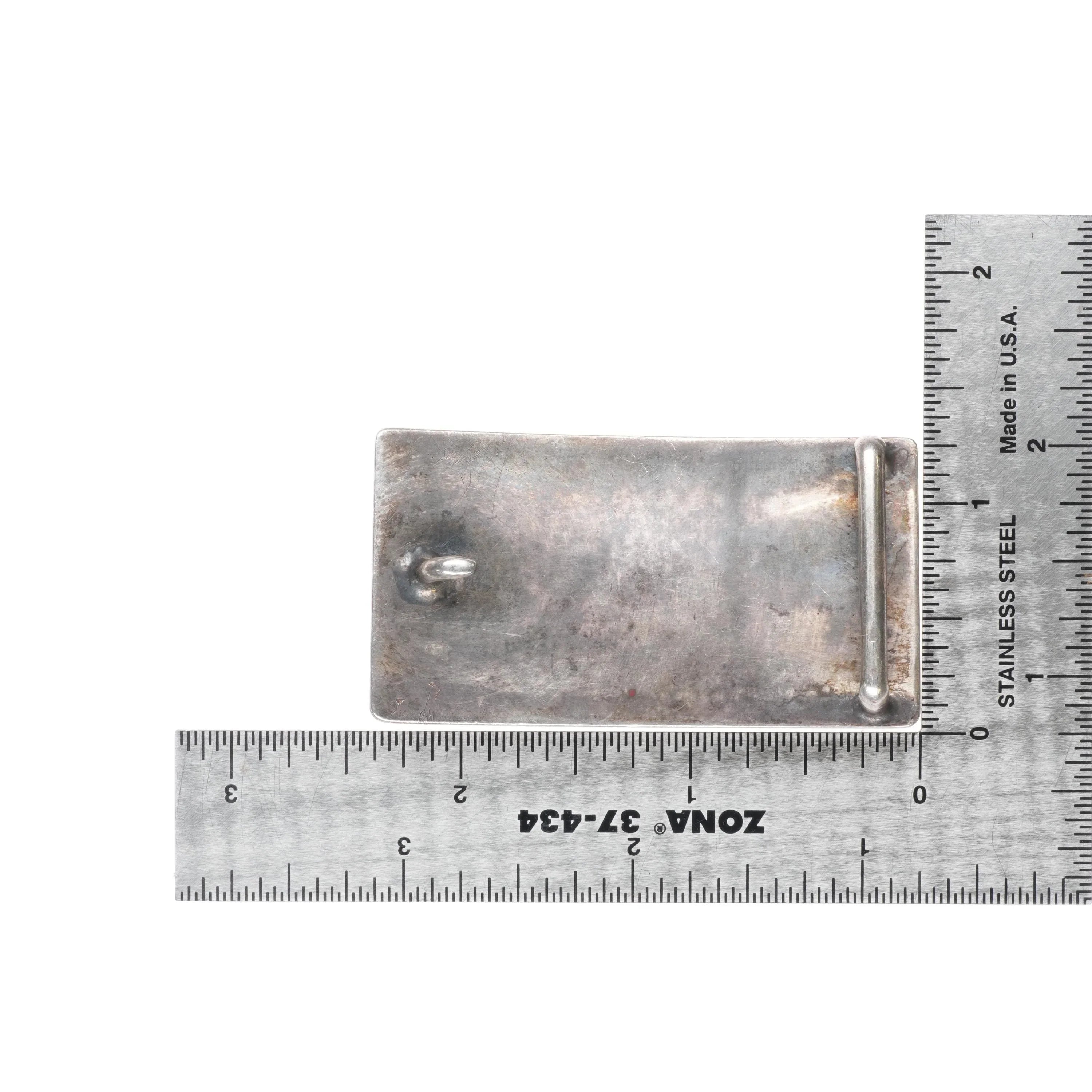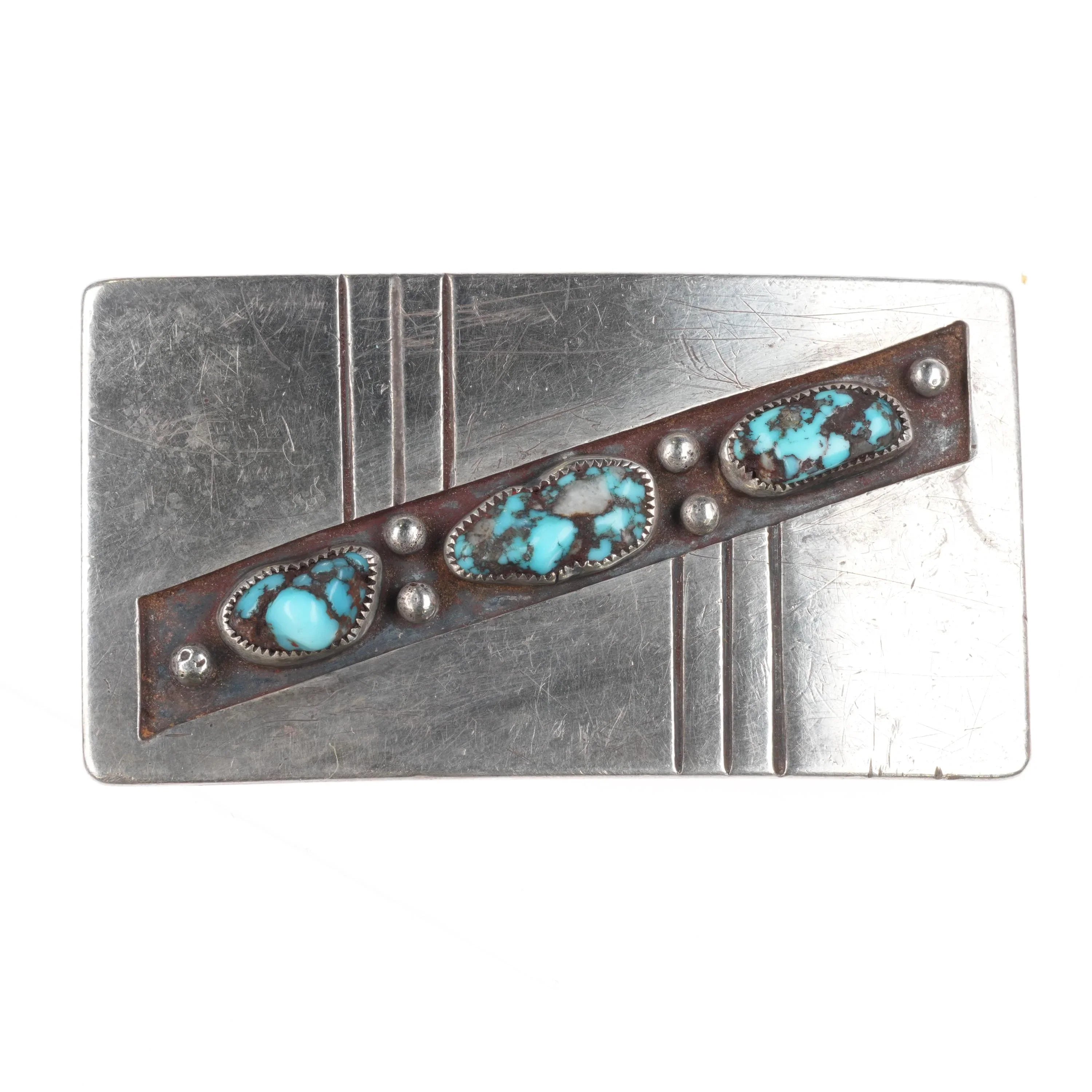 c1950‘s Southwestern Modernist sterling silver belt buckle with turquoise. Tested and guaranteed solid sterling silver, fits a 1" wide belt. No issues, some expected wear. Circa second quarter of the 20th century. Weight and measurements in pictures. Seems like it should be signed by an important Shop or maker but there are no apparent signatures.
