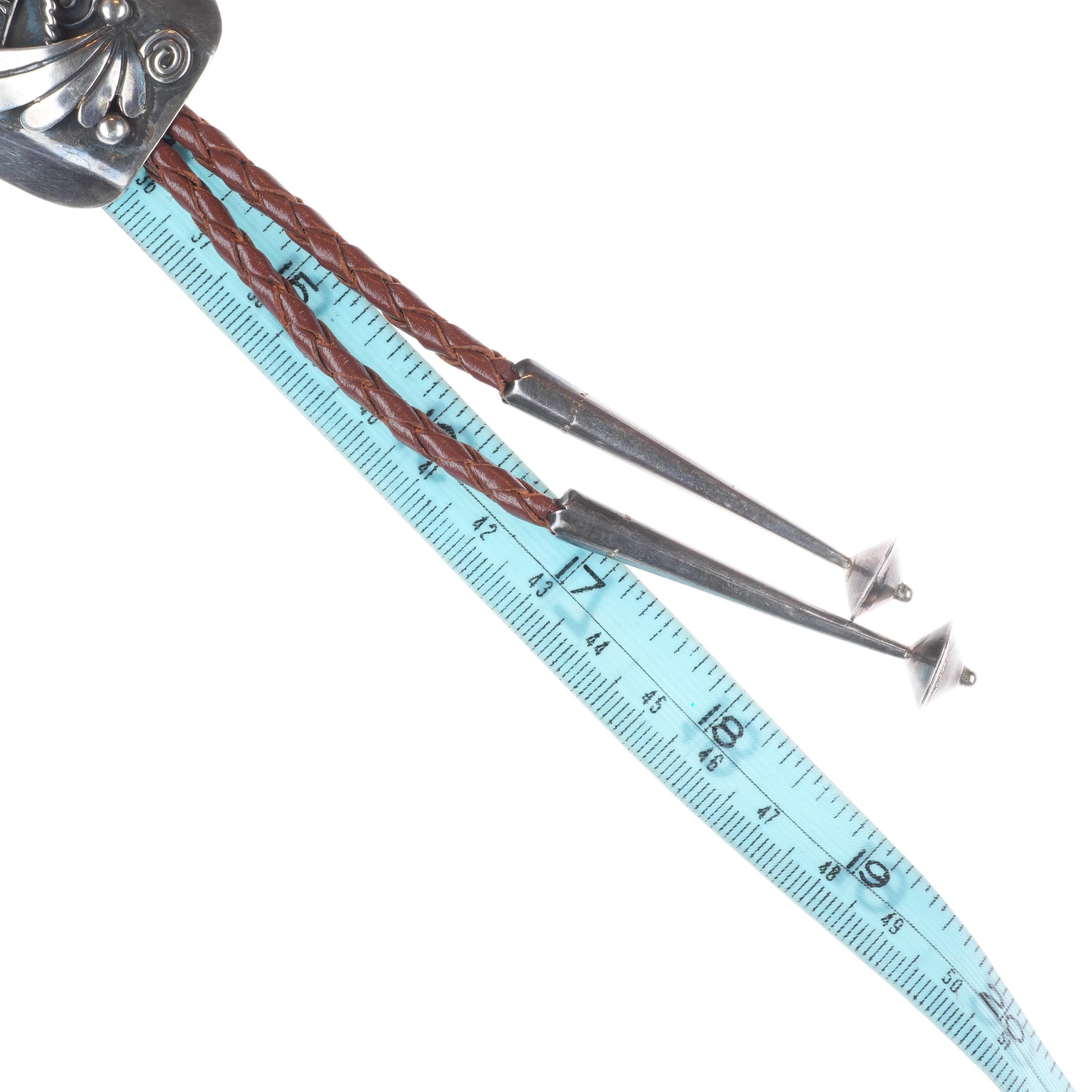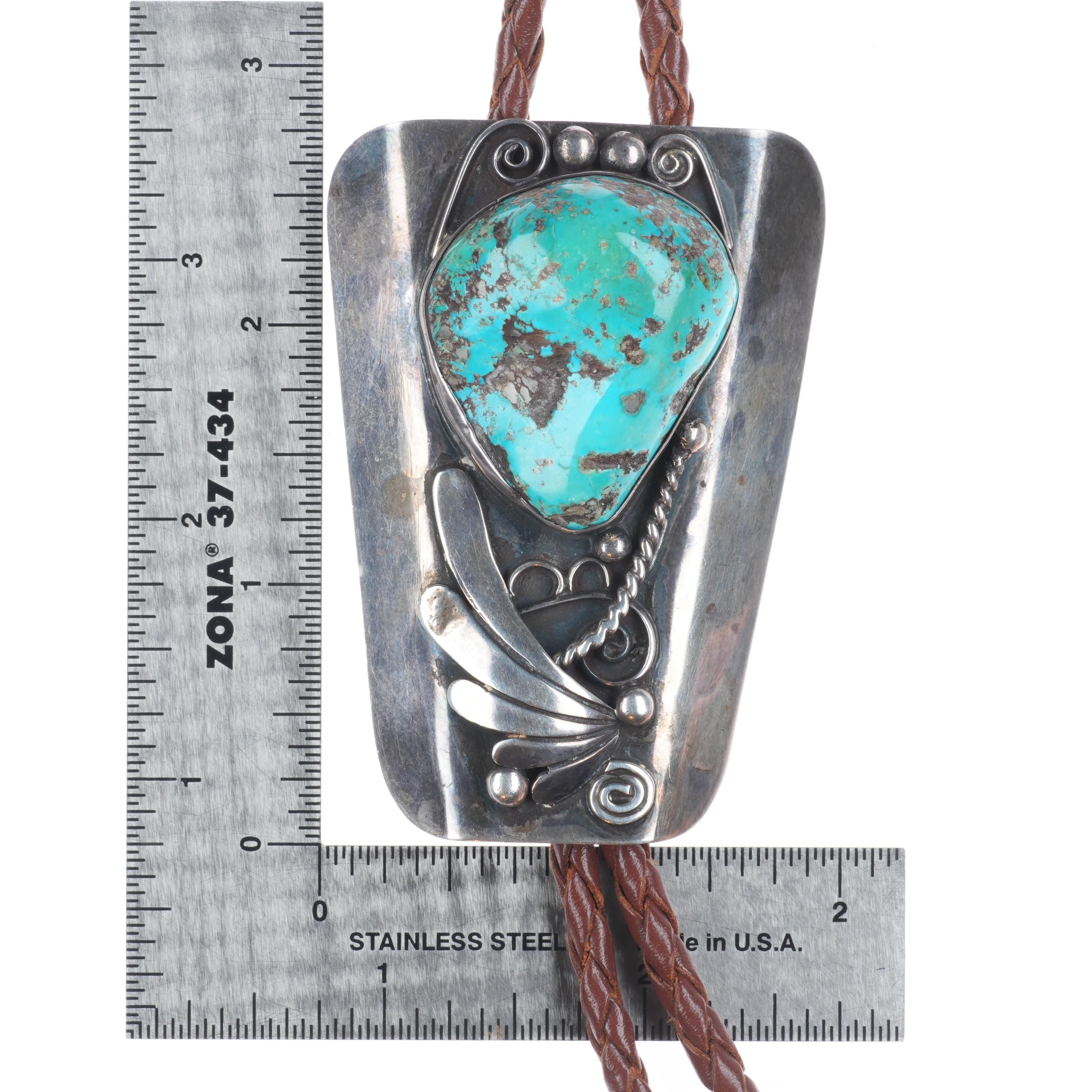 c1960 c-31 Vintage AJW Navajo sterling silver bolo tie with turquoise Tested and guaranteed solid sterling silver slide and tips. Weight and measurements in pictures. 38" long. Circa third quarter of the 20th century.