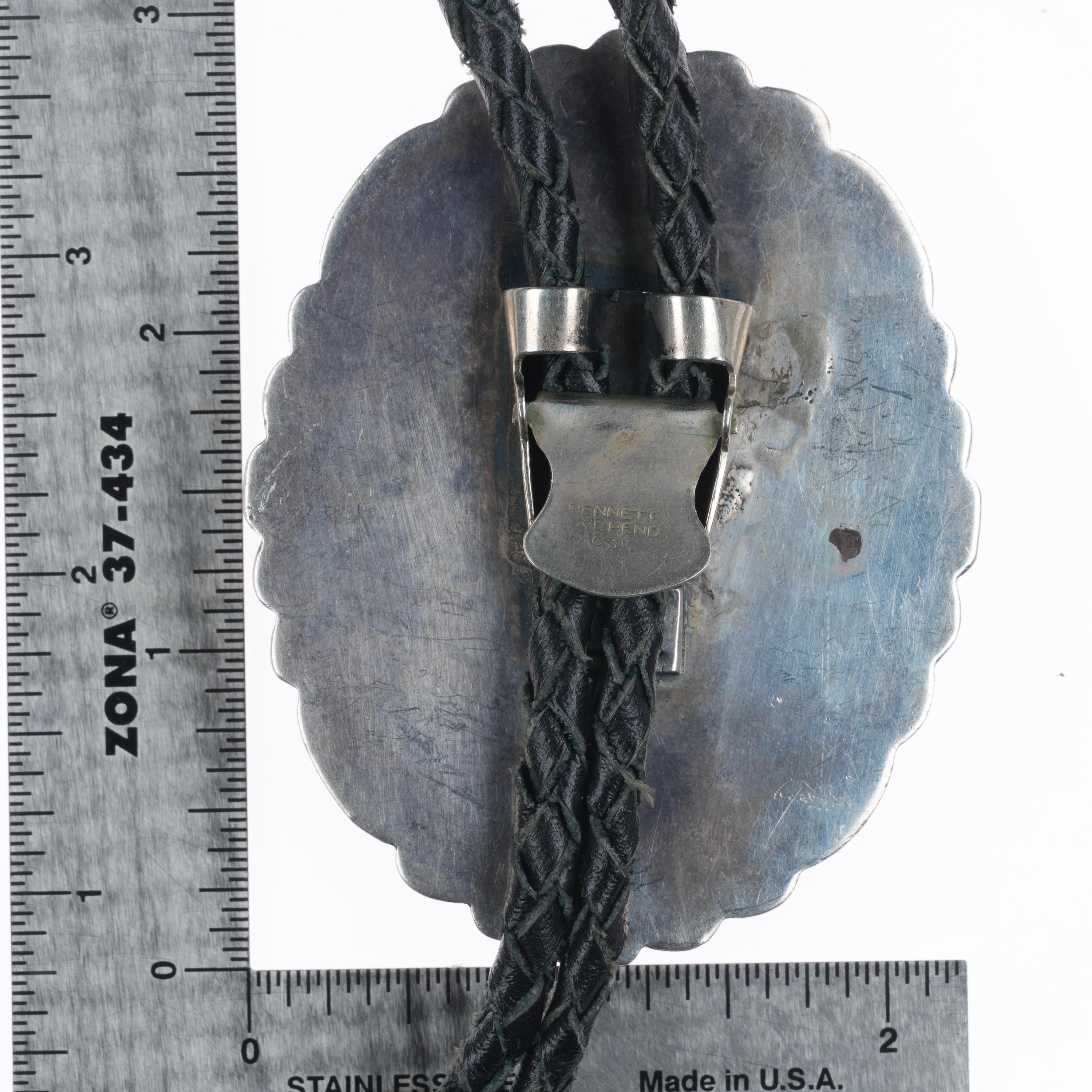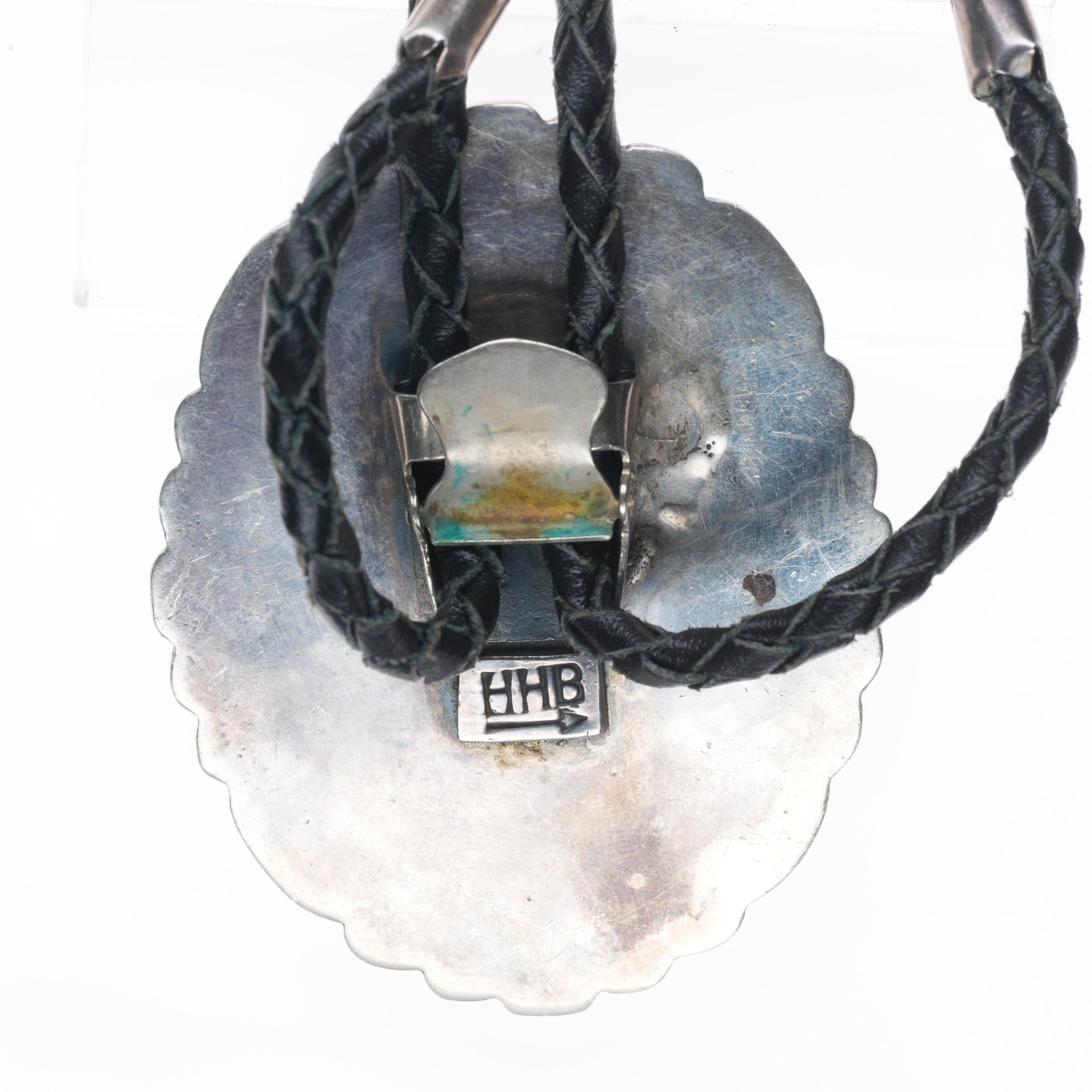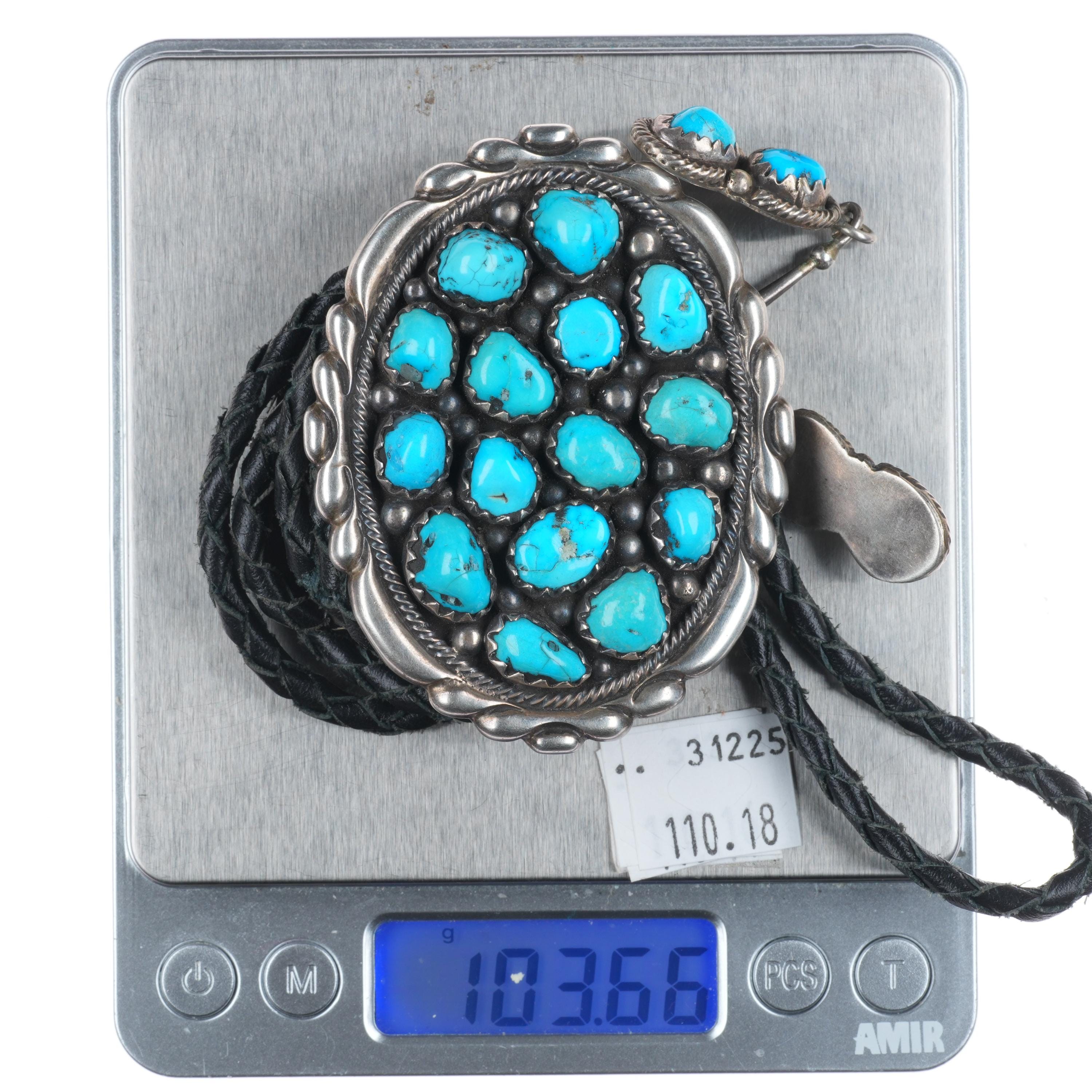 c1960‘s c-31 Harry Begay? Sterling silver turquoise cluster bolo tie fancy tips. Tested and guaranteed solid sterling silver slide and tips. Weight and measurements in pictures. 43" long. Circa third quarter of the 20th century. Harry Begay‘s later hallmark has a different type of arrow facing the other direction. And the info I find shows him active since the early 70‘s, but c-31 bolo clips are typically thought to have been phased out prior to 1970. This is a well made bolo, could easily be an early work by Harry Begay from the late 60‘s if he was active then. Or he could have donated some early clips.