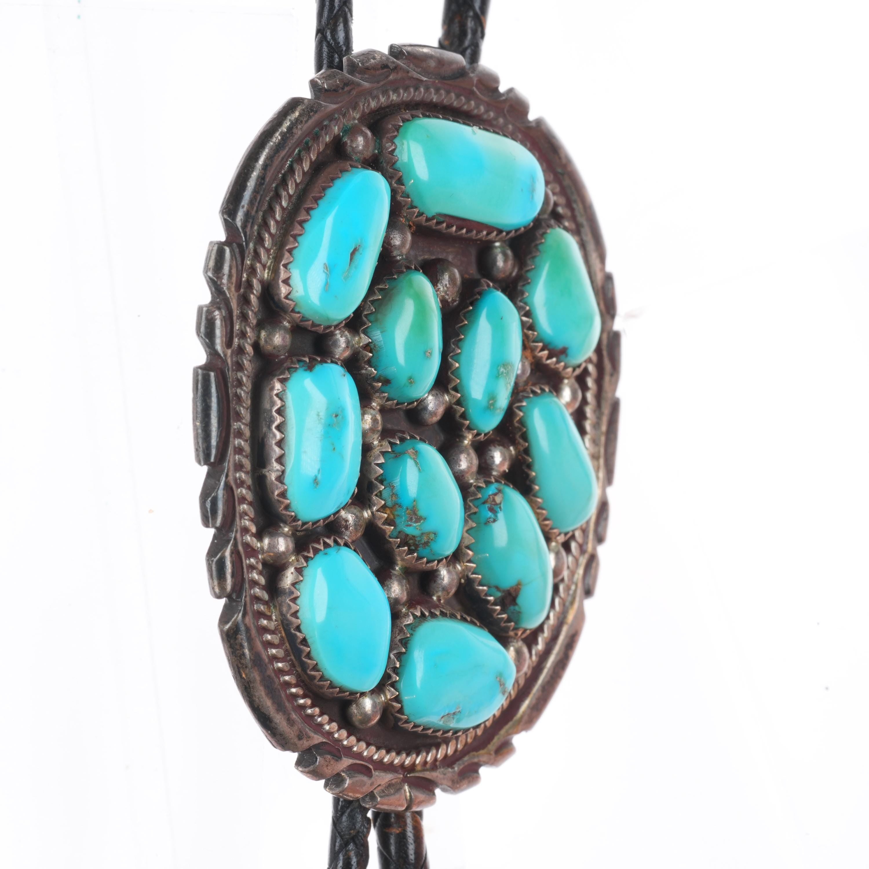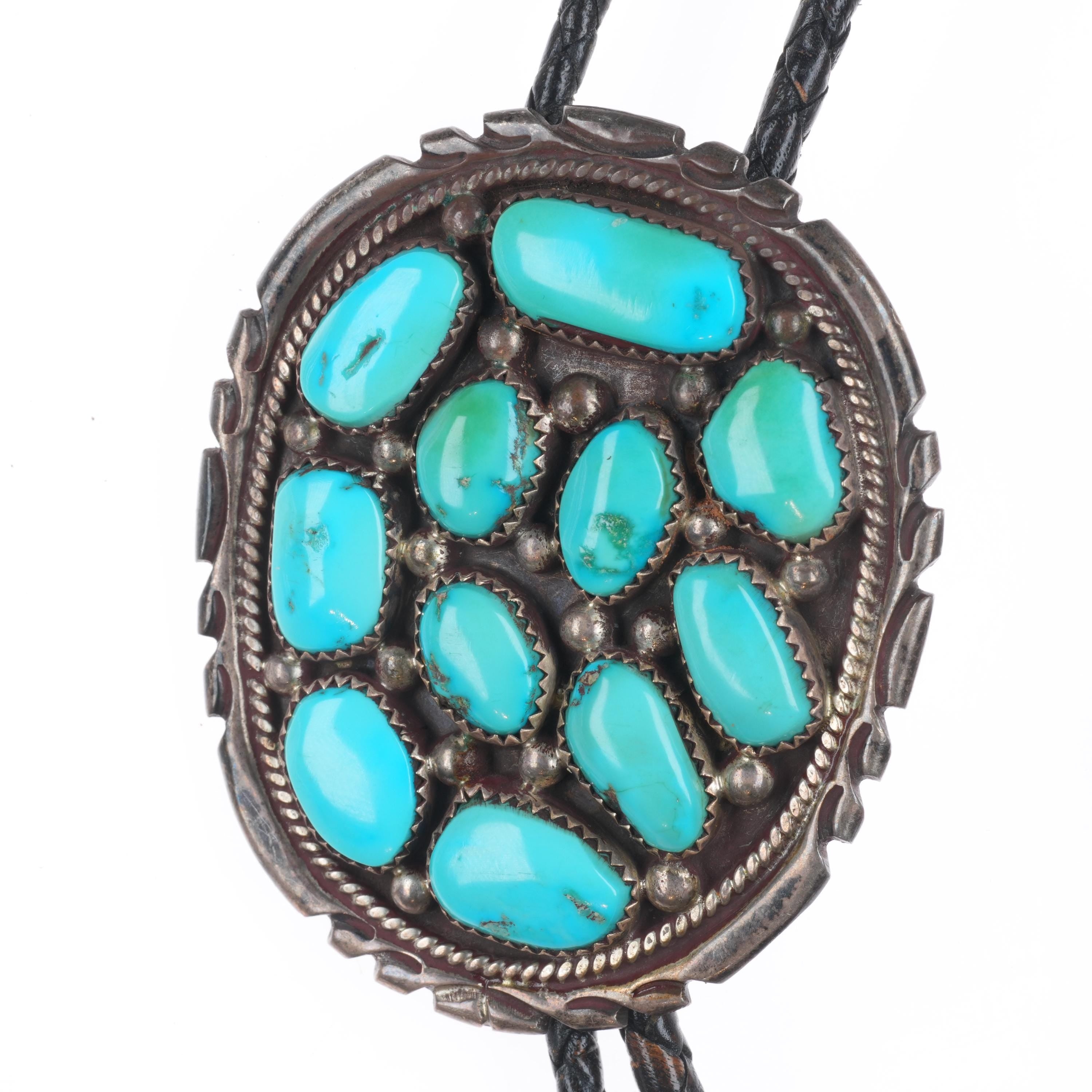 c1970 Big Moore Navajo sterling silver natural turquoise cluster bolo tie Tested and guaranteed solid sterling silver slide and tips. Weight and measurements in pictures. 39" long. Circa third quarter of the 20th century. I think this might be Tommy Moore‘s dad. I think there is an initial before Moore, illegible. The quality/heaviness of silverwork and quality of stones used on this is better than any Tommy Moore I‘ve had/seen.