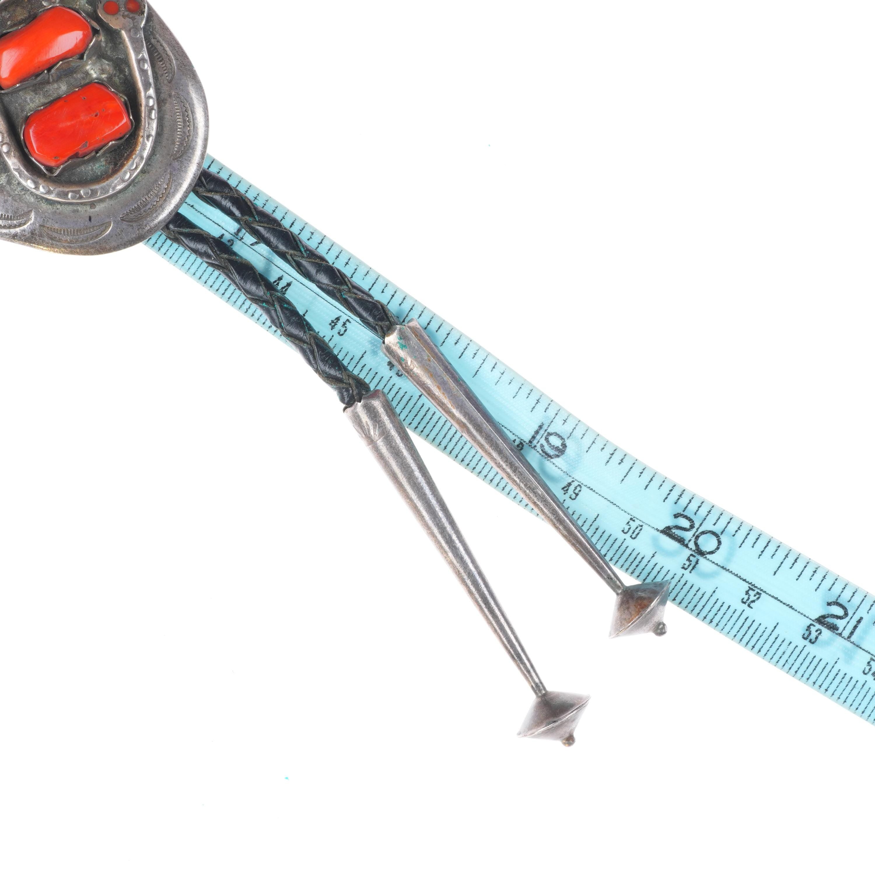 c1970 Effie Calavaza Zuni sterling silver, turquoise, coral snakes bolo tie Tested and guaranteed solid sterling silver slide and tips. Weight and measurements in pictures. 40" long. Circa third quarter of the 20th century. Original c1970 price on back.