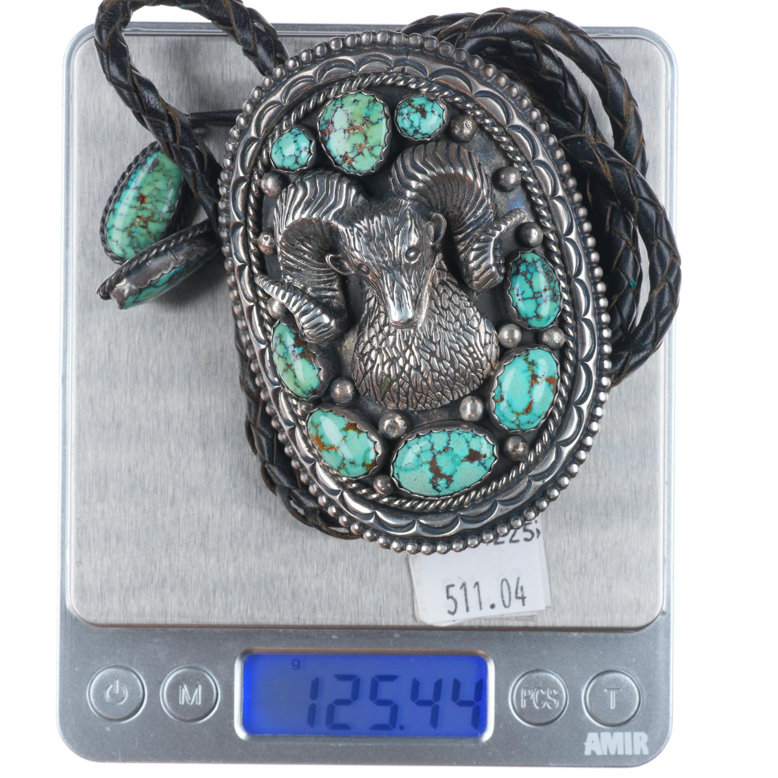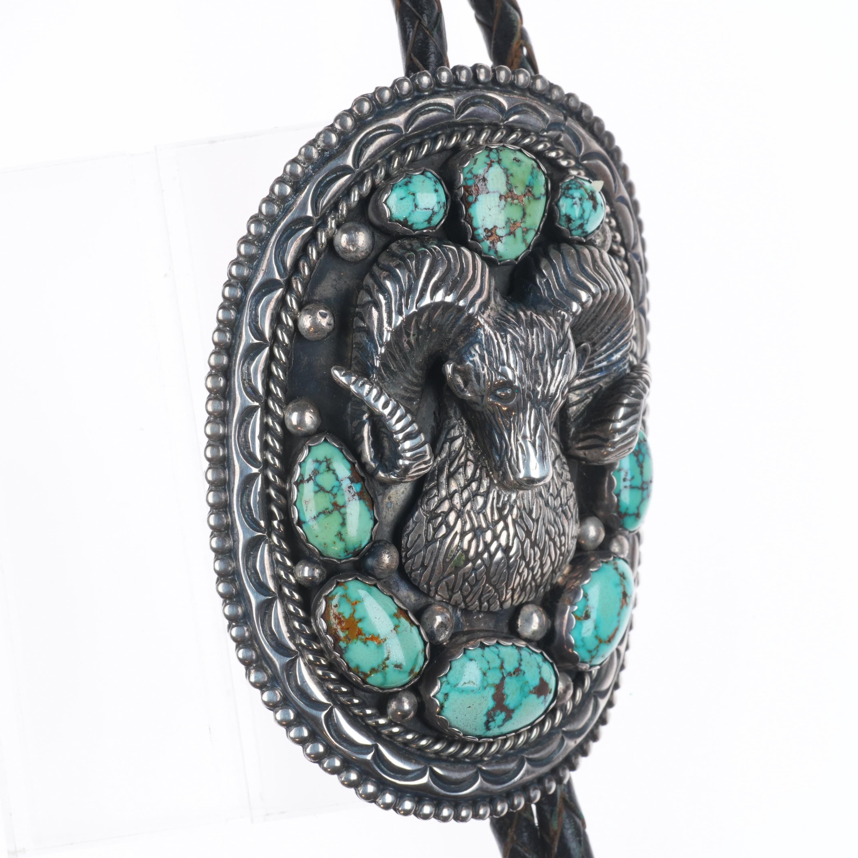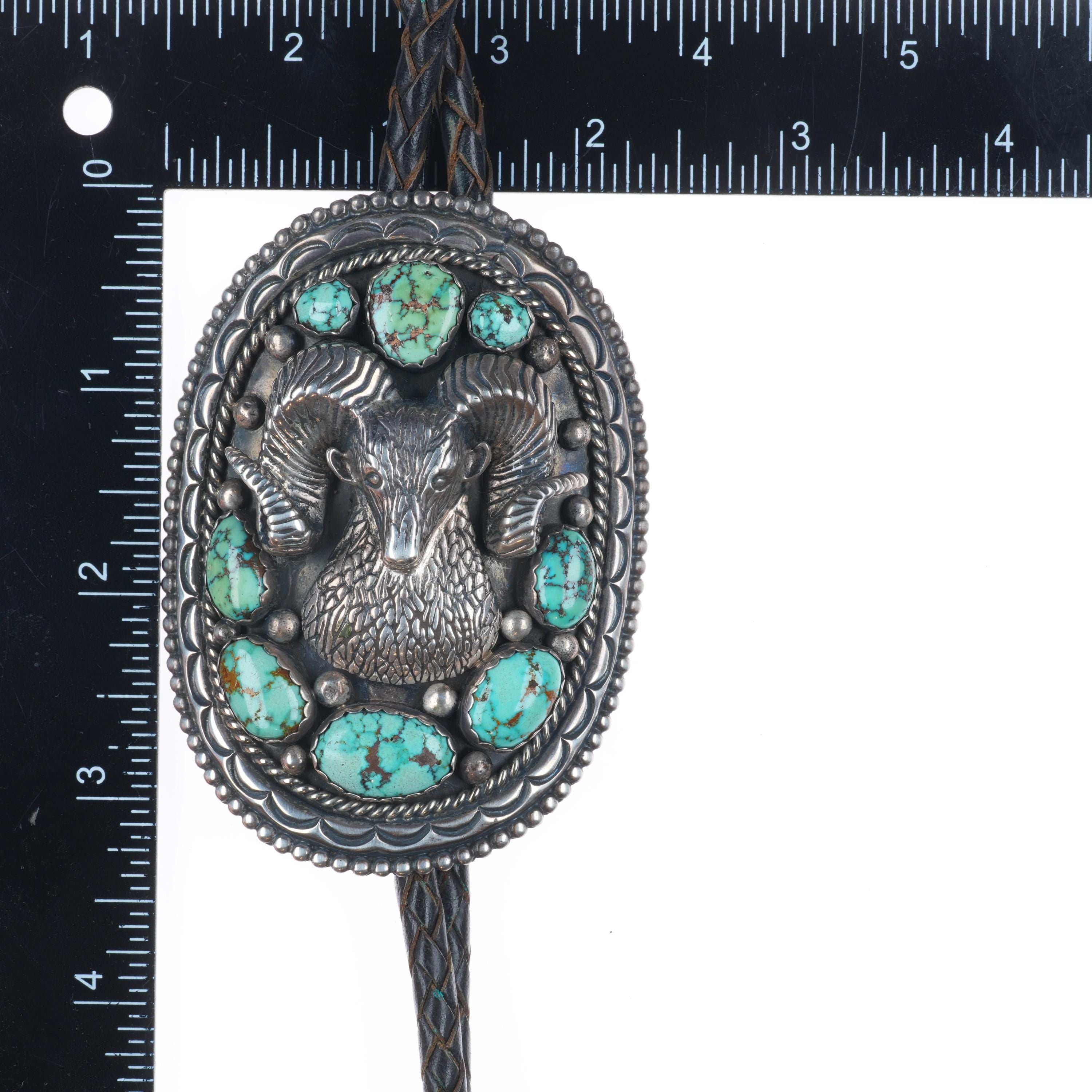 c1970 Heavy Vintage WM Navajo sterling silver ram bolo tie w/nice turquoise