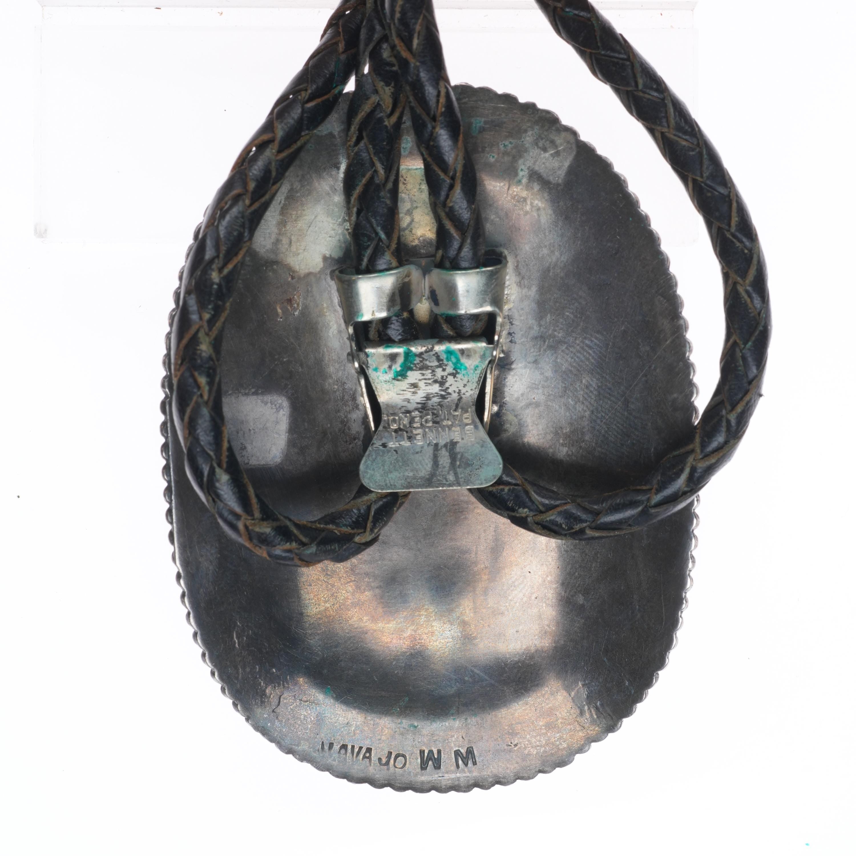 c1970 Heavy Vintage WM Navajo sterling silver ram bolo tie w/nice turquoise Tested and guaranteed solid sterling silver slide and tips. Weight and measurements in pictures. 46" long. Circa third quarter of the 20th century.
