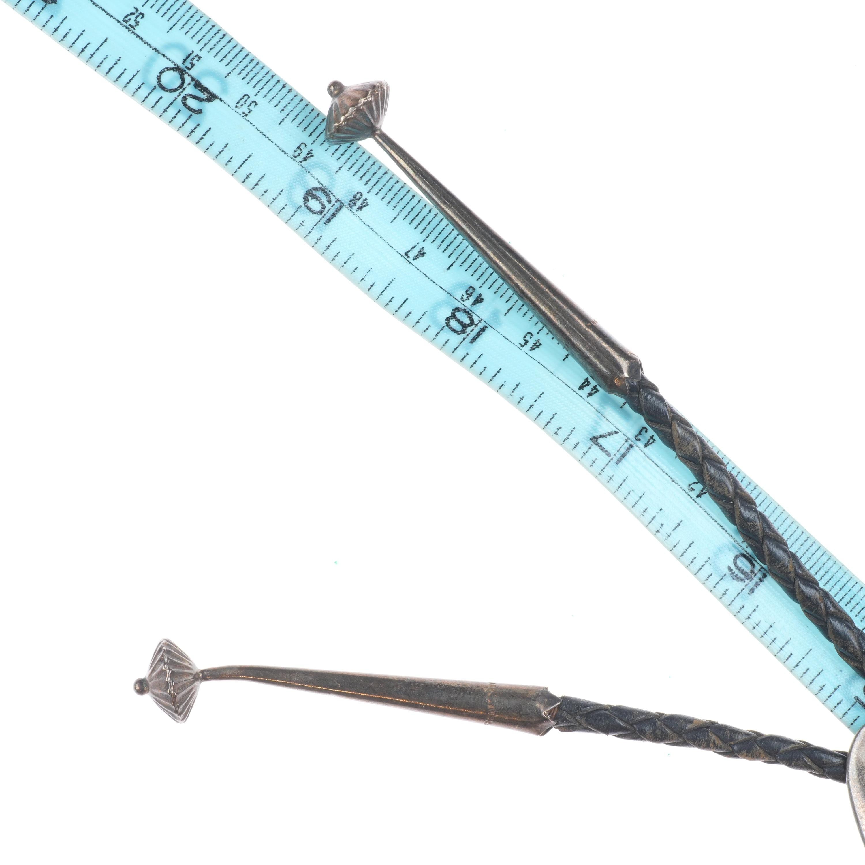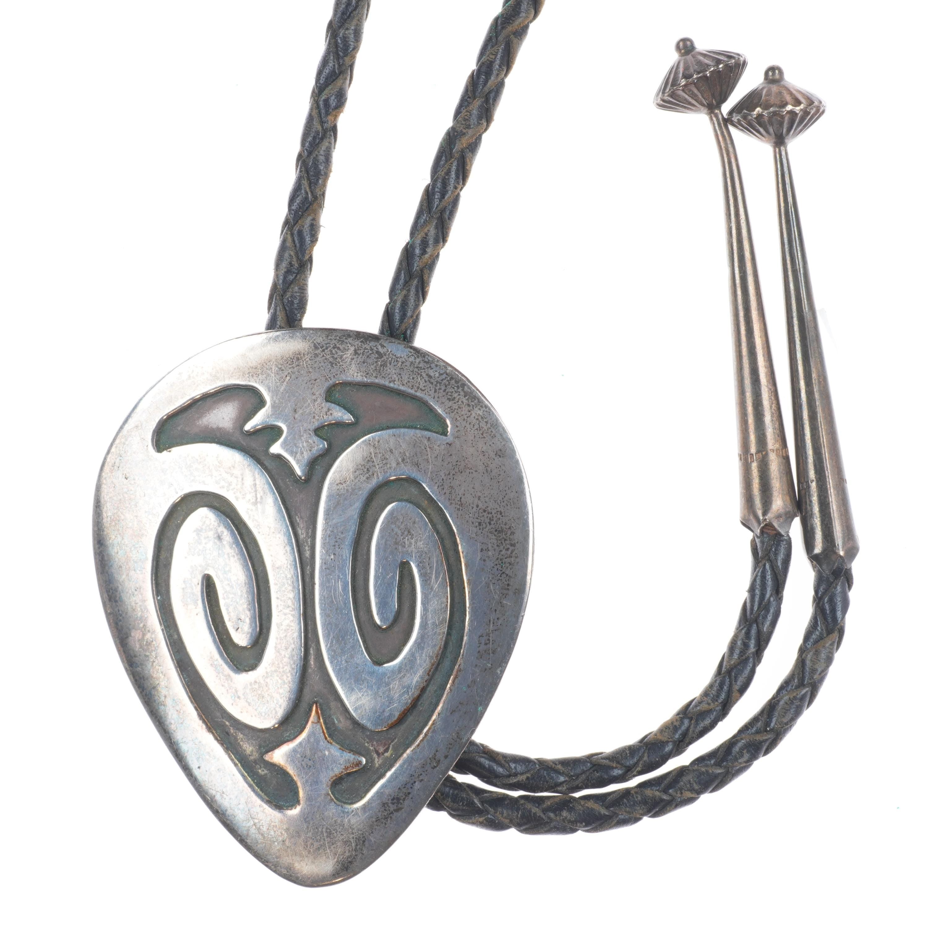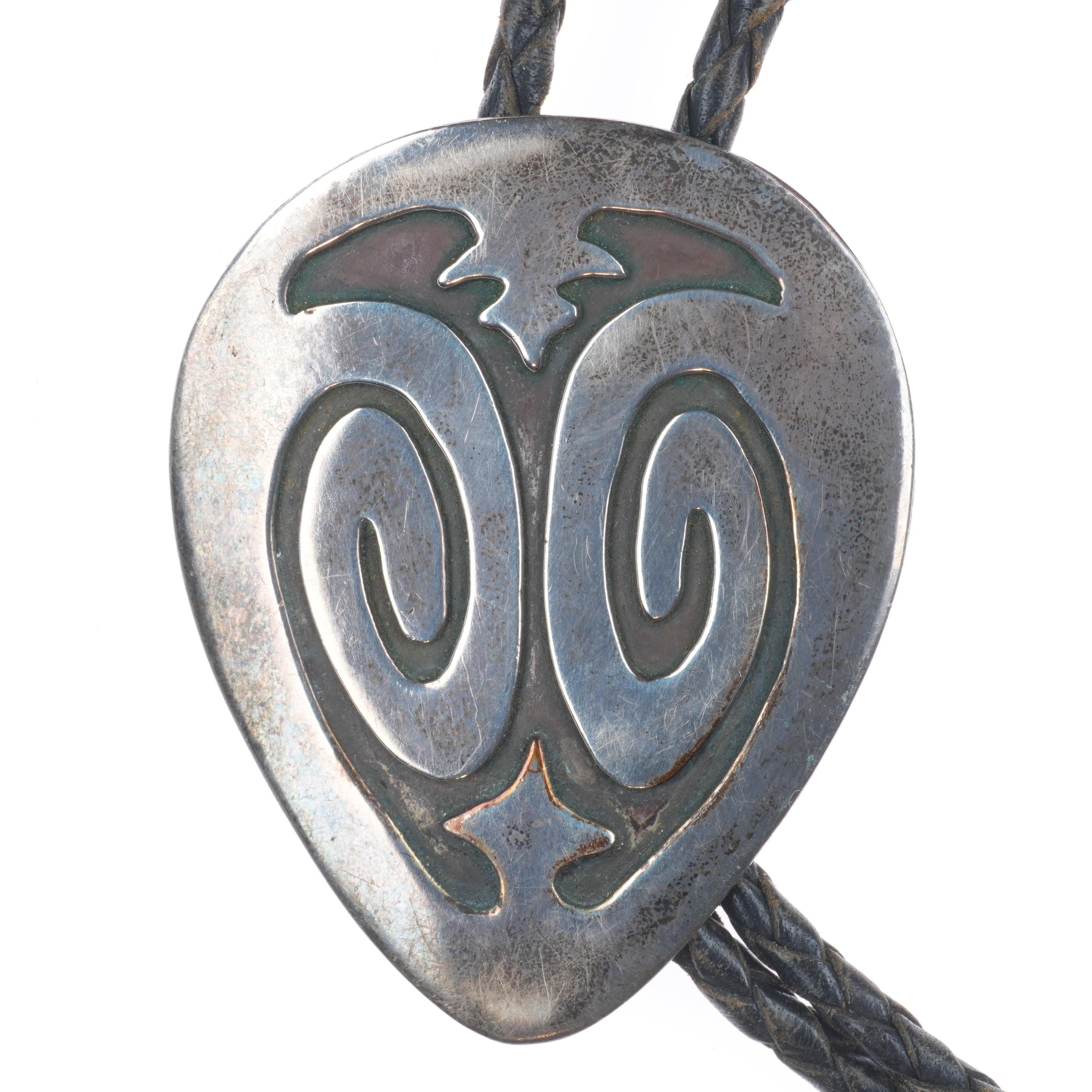 c1970 Navajo Vintage sterling silver large bolo tie in overlay style. Tested and guaranteed solid sterling silver slide and tips. Weight and measurements in pictures. Circa third quarter of the 20th century.