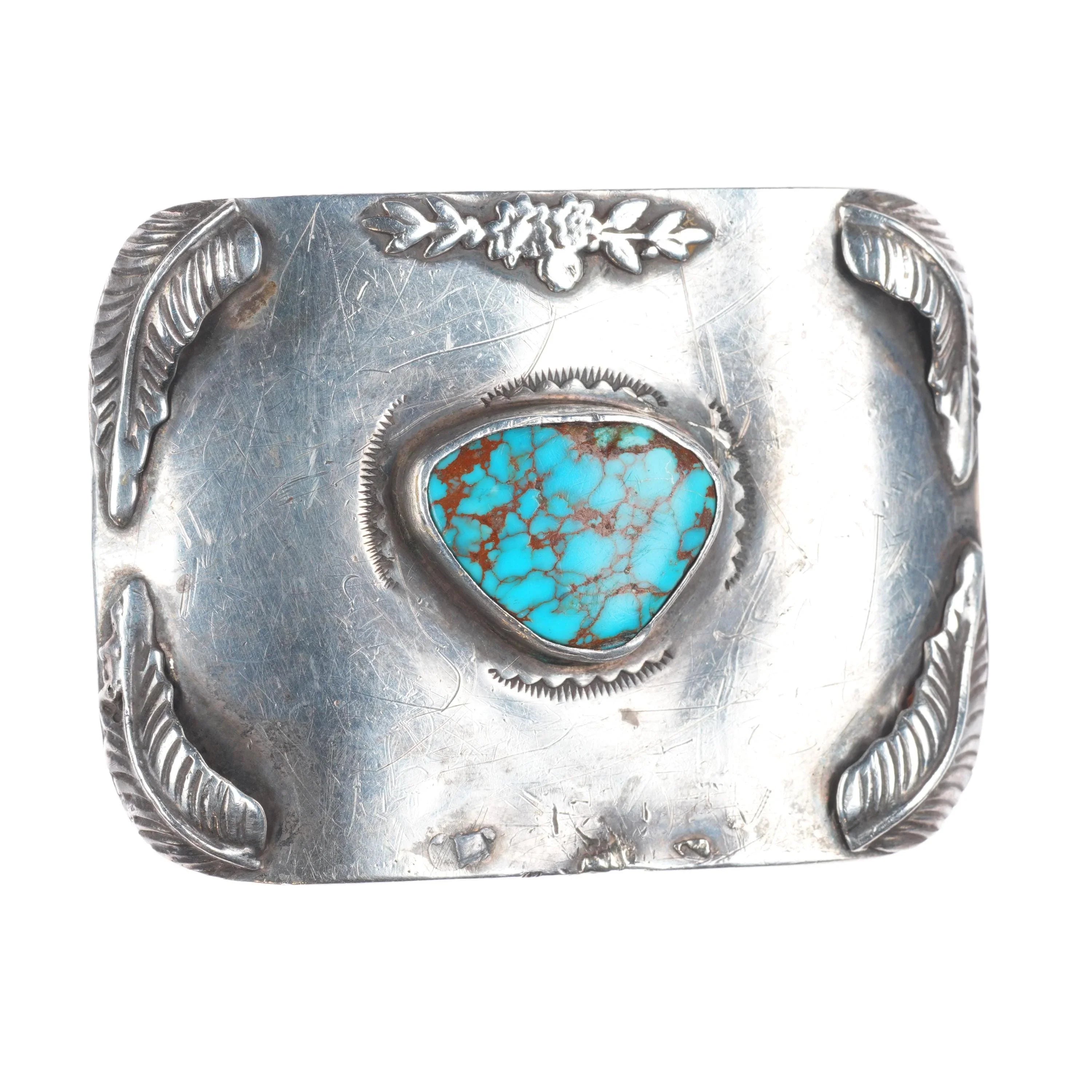 crude vintage southwestern sterling silver belt buckle awesome Nevada Turquoise. Tested and guaranteed solid sterling silver, fits up to a 1.5 wide belt. Weight and measurements in pictures, circa third quarter of the 20th century. Fully functional with overall wear, some sterling applique loss at bottom. Very awesome high grade natural turquoise, likely from Nevada. Looks to be signed JRB or RB, likely Native American made.