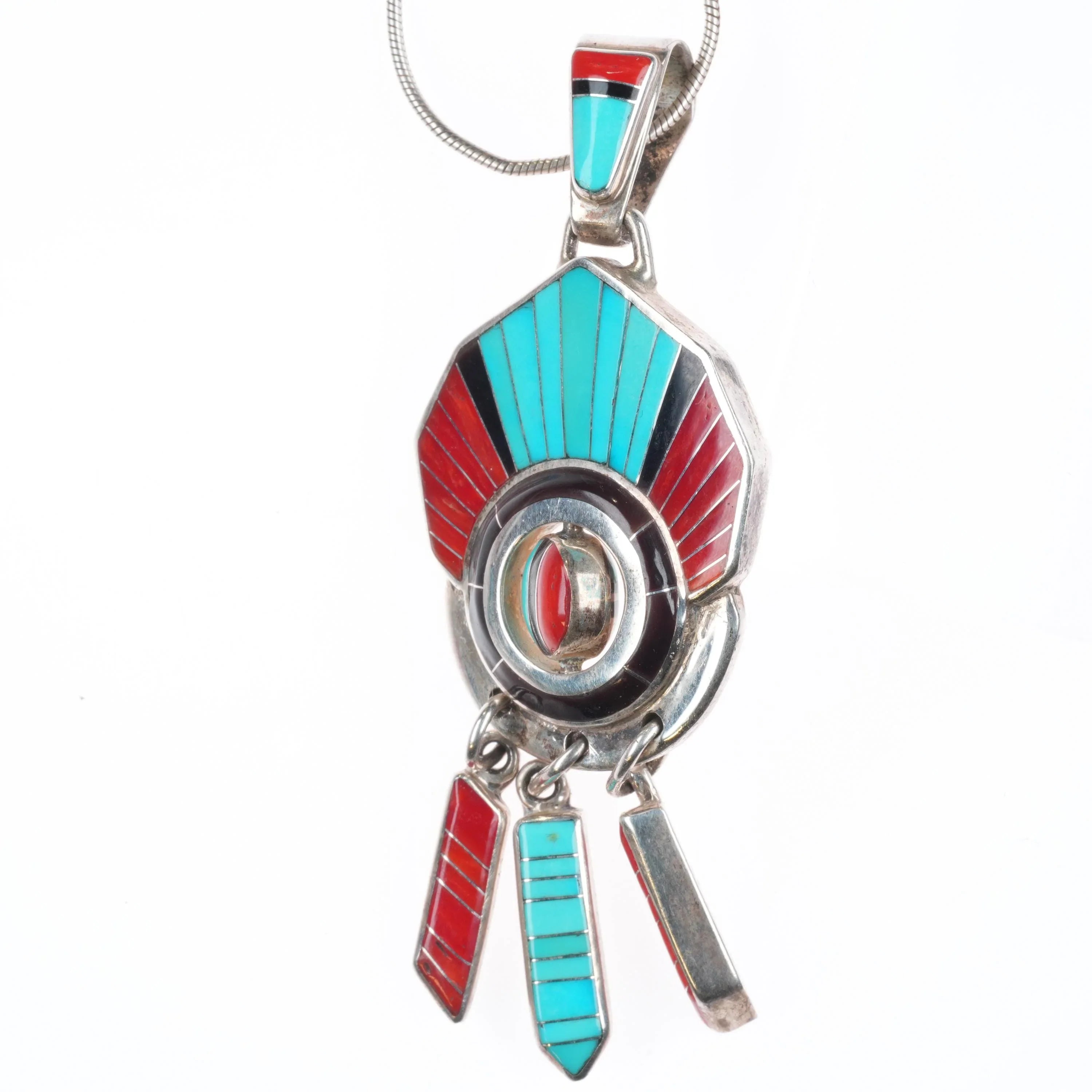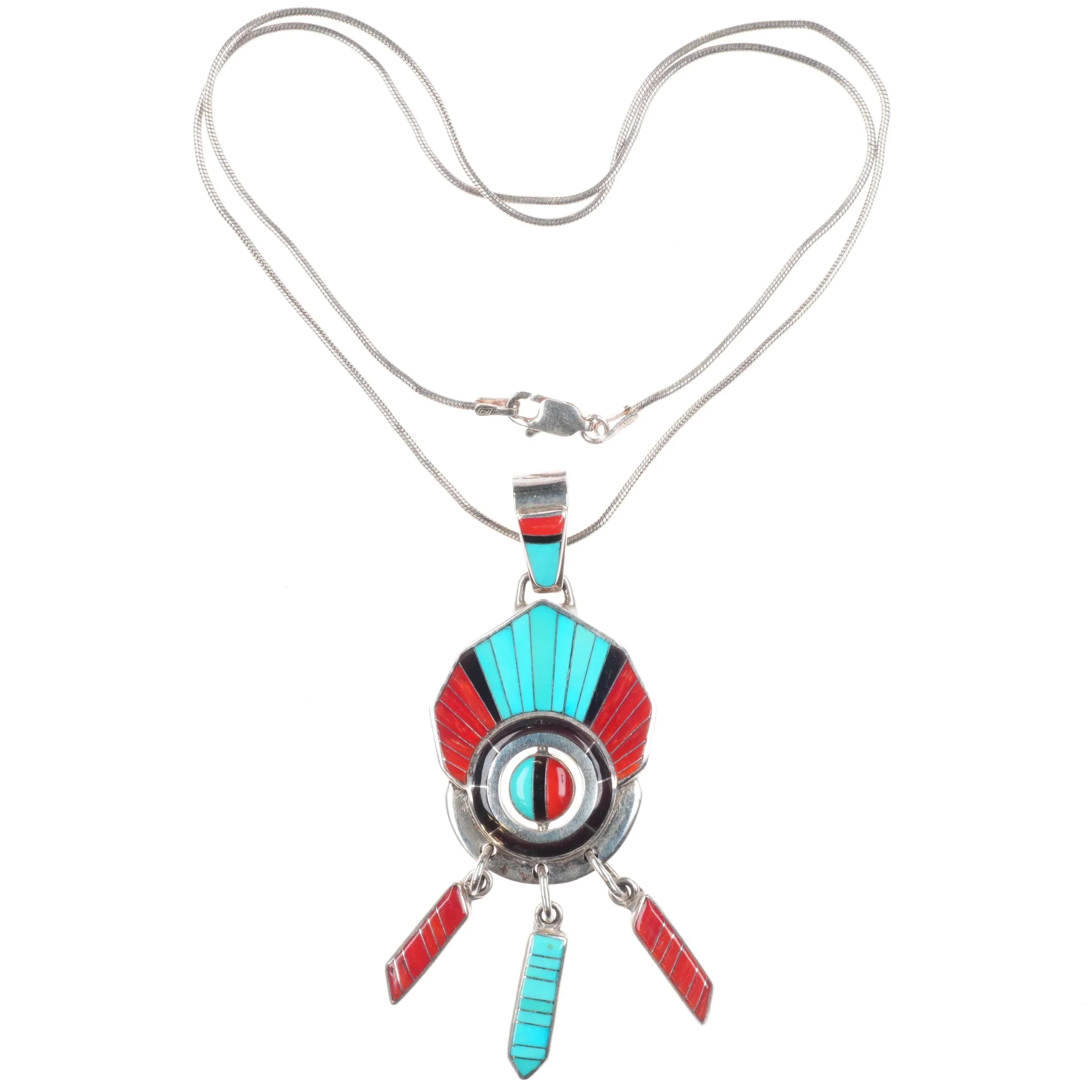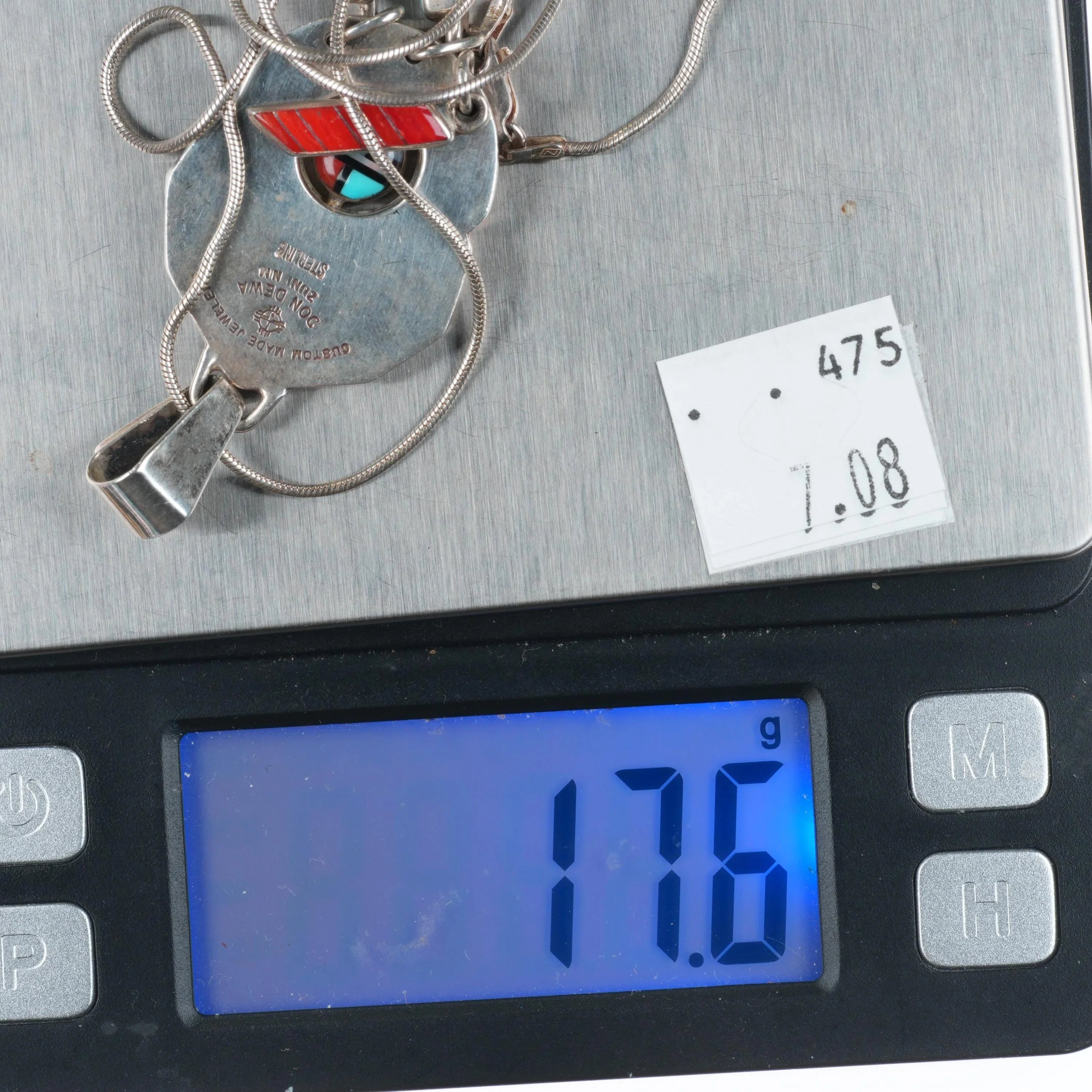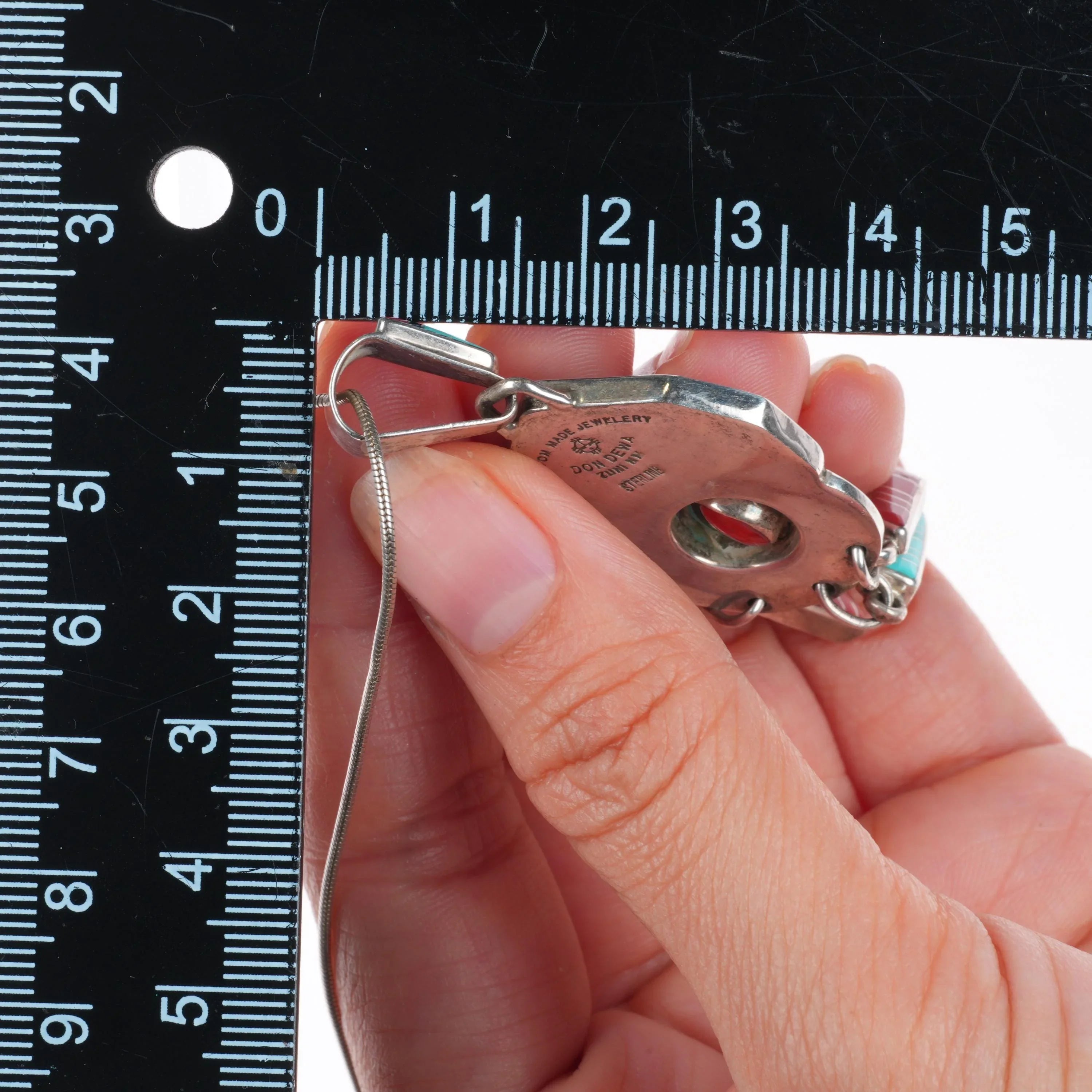 Don Dewa Zuni spinner pendant turquoise/coral/sterling silver sunface. Solid sterling silver tested and guaranteed with the markings shown, weight and measurements in the pictures. No issues, circa last quarter of the 20th century. Including the 18" sterling necklace for free.