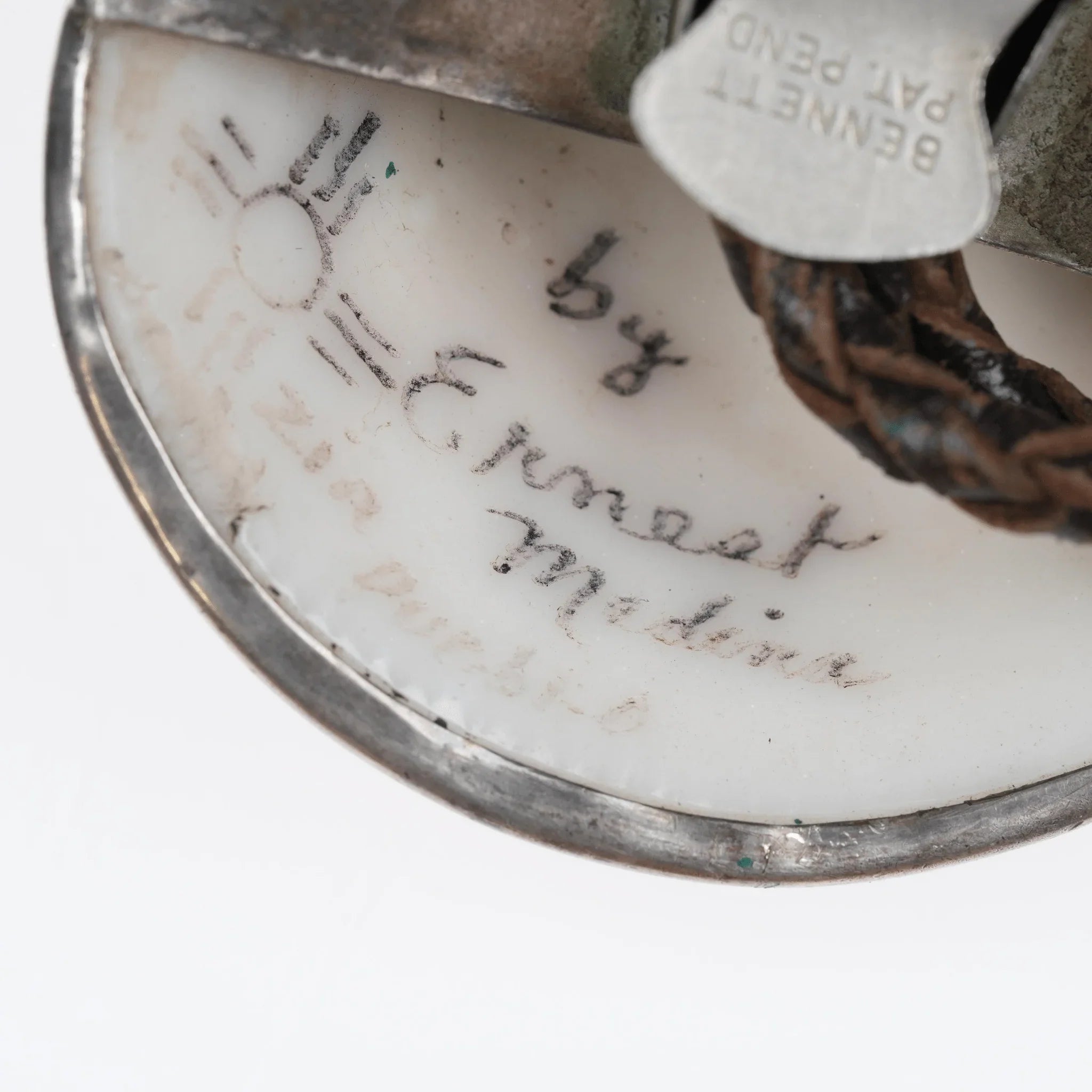 Ernest Medina Zia Sterling inlaid shell bolo tie. Extremely high quality item inlaid with turquoise, red coral, and shell. 40" long, other measurements in pics. Hand engraved on the back of the shell by Ernest Medina Zia Pueblo.<br><br> Marked or unmarked as shown in pics, weight and other measurements in pics. Sorry but my jewelry is stored in a secure location and cannot be accessed for more pictures,<br>videos, or measurements until sold. If you look at pictures/description your<br>question should be answered. Thank you so much for your time and consideration!<br><br>All precious metals are tested and guaranteed. A Native American jewelry piece referred to as "silver" or "ingot" is guaranteed to be at least 90% silver. Bracelets are photographed on a 6" women's wrist.