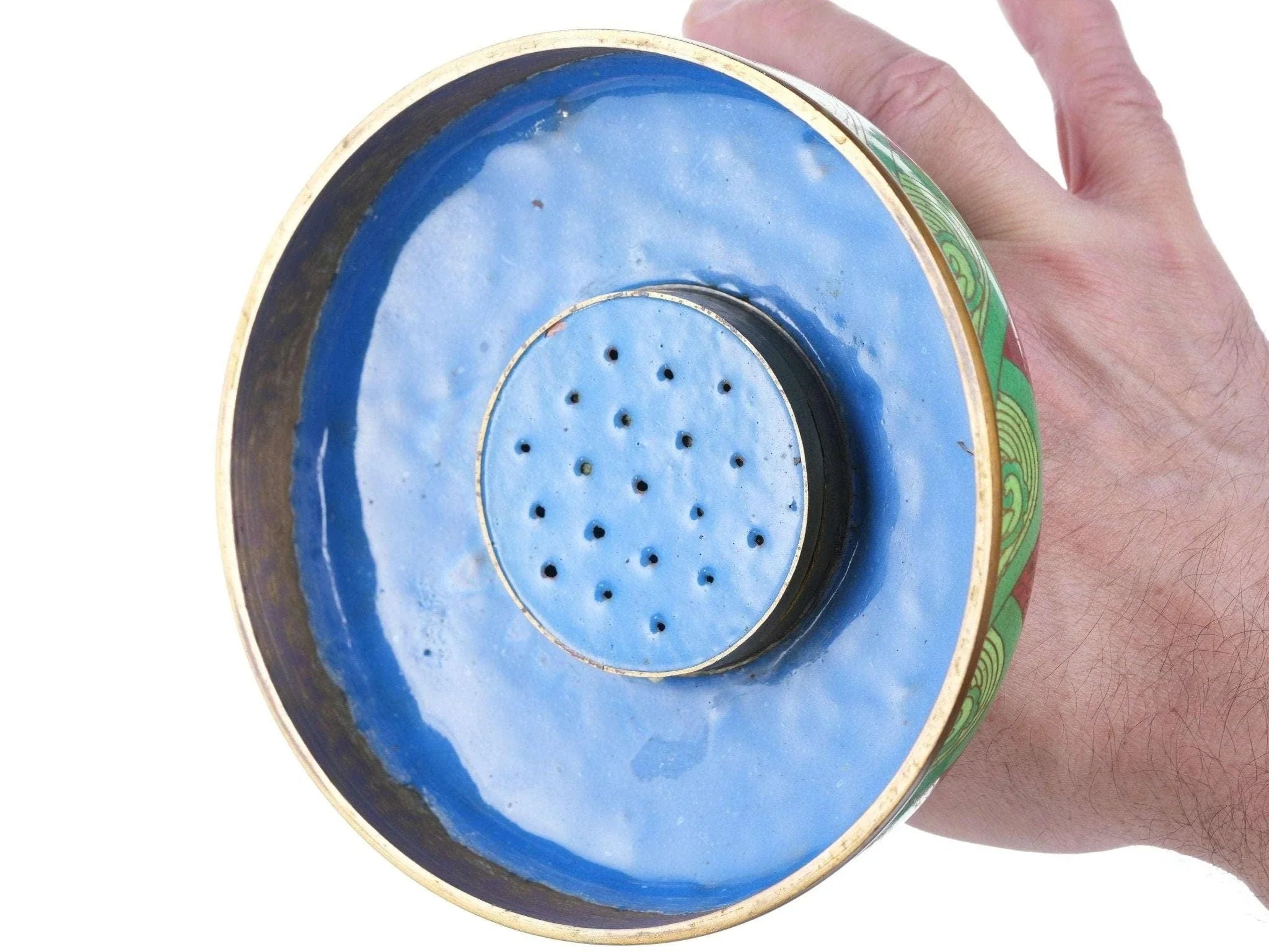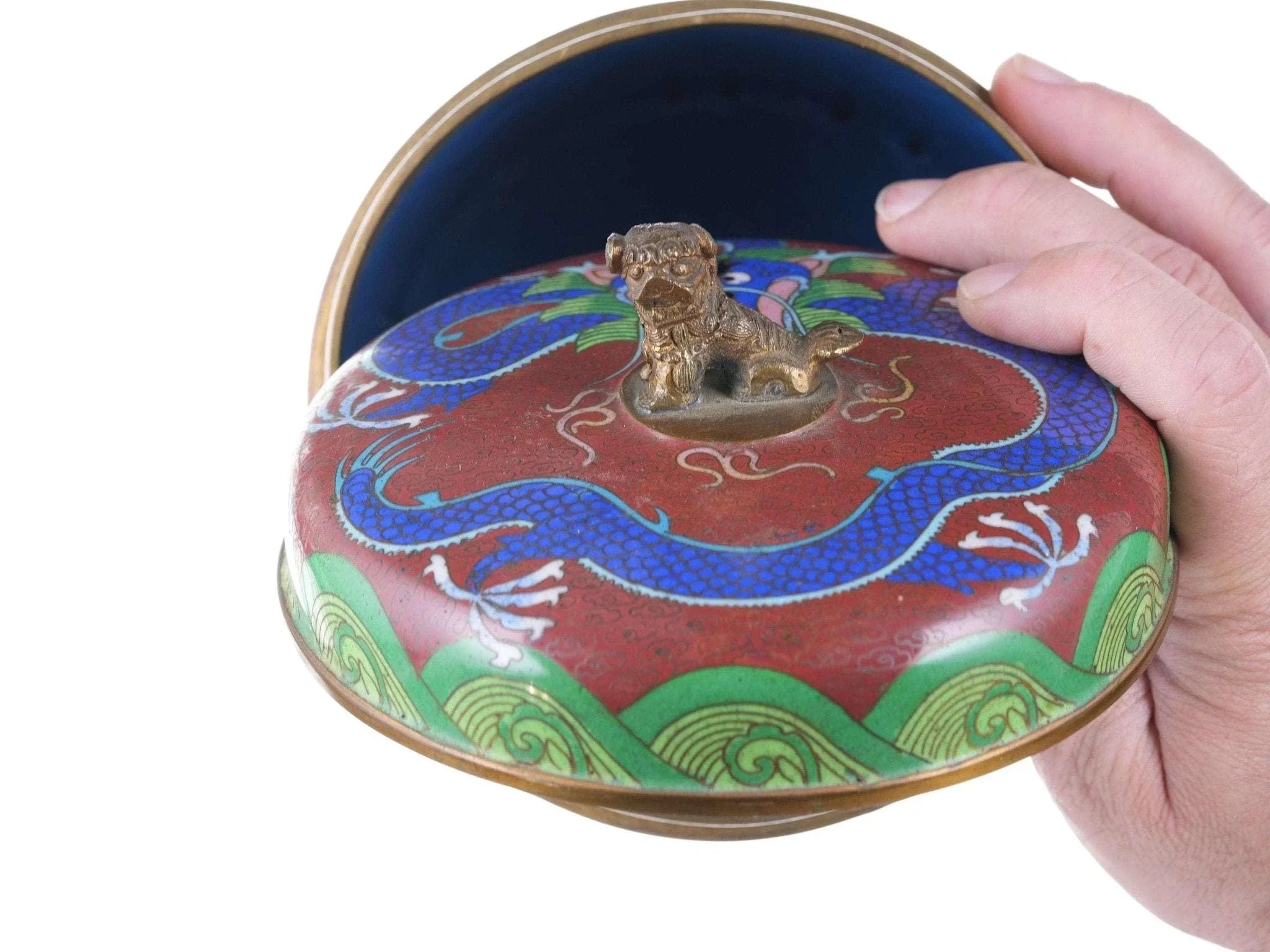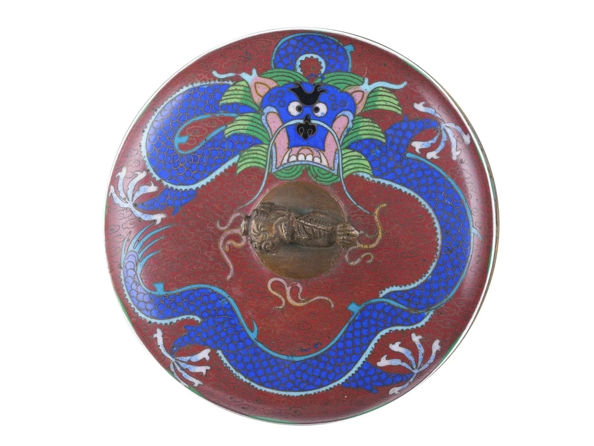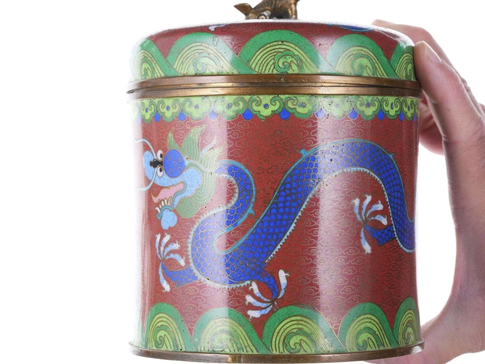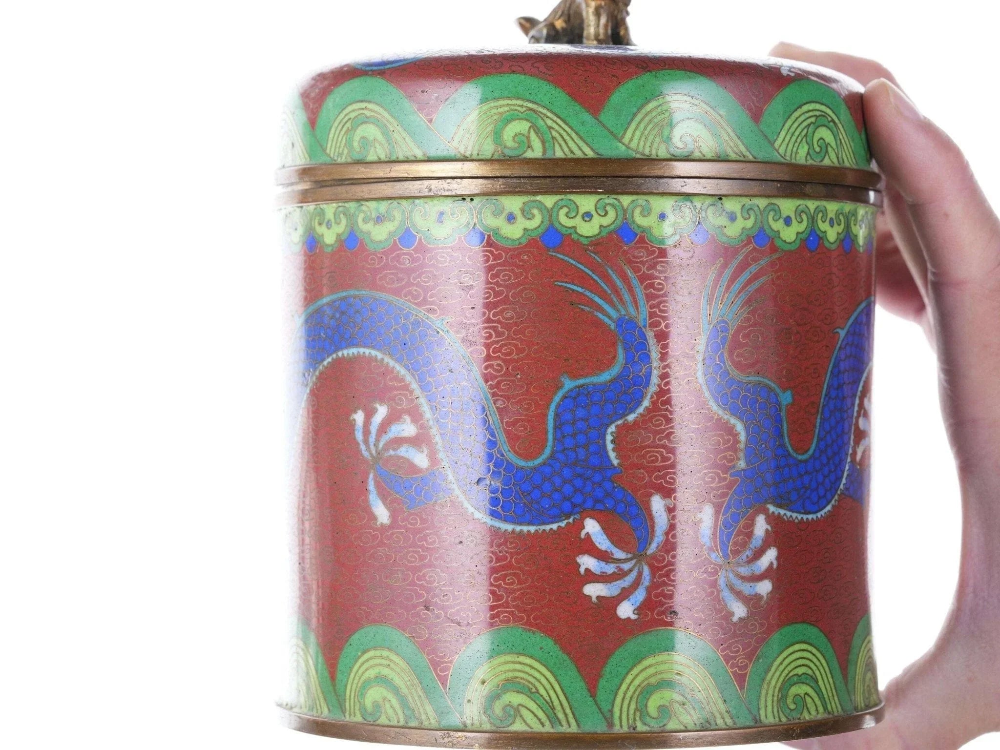 Chinese Republic Period cloisonne humidor with bronze foo lion handle