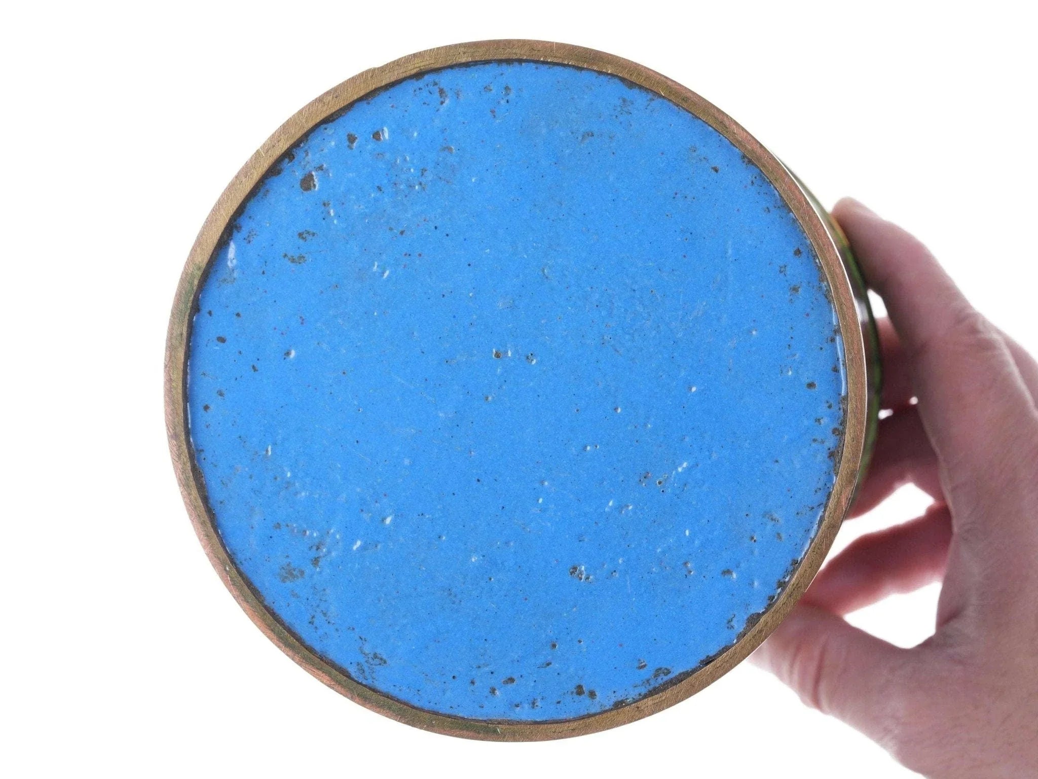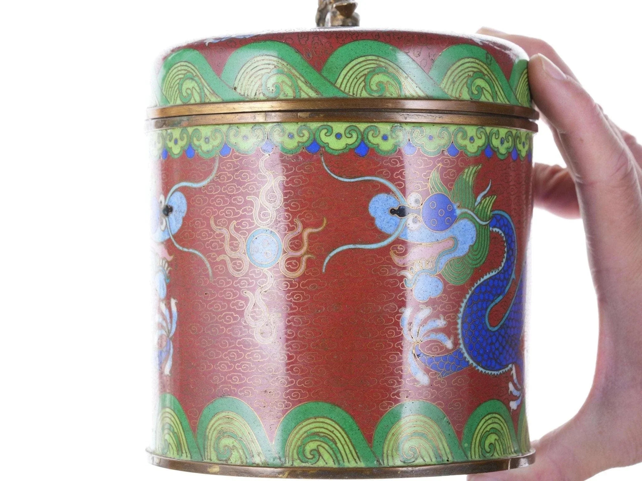 Chinese Republic Period cloisonne humidor with bronze foo lion handle. 7.5" tall<br>x 5 5/8" wide with no detectable damage.<br><br>tw147