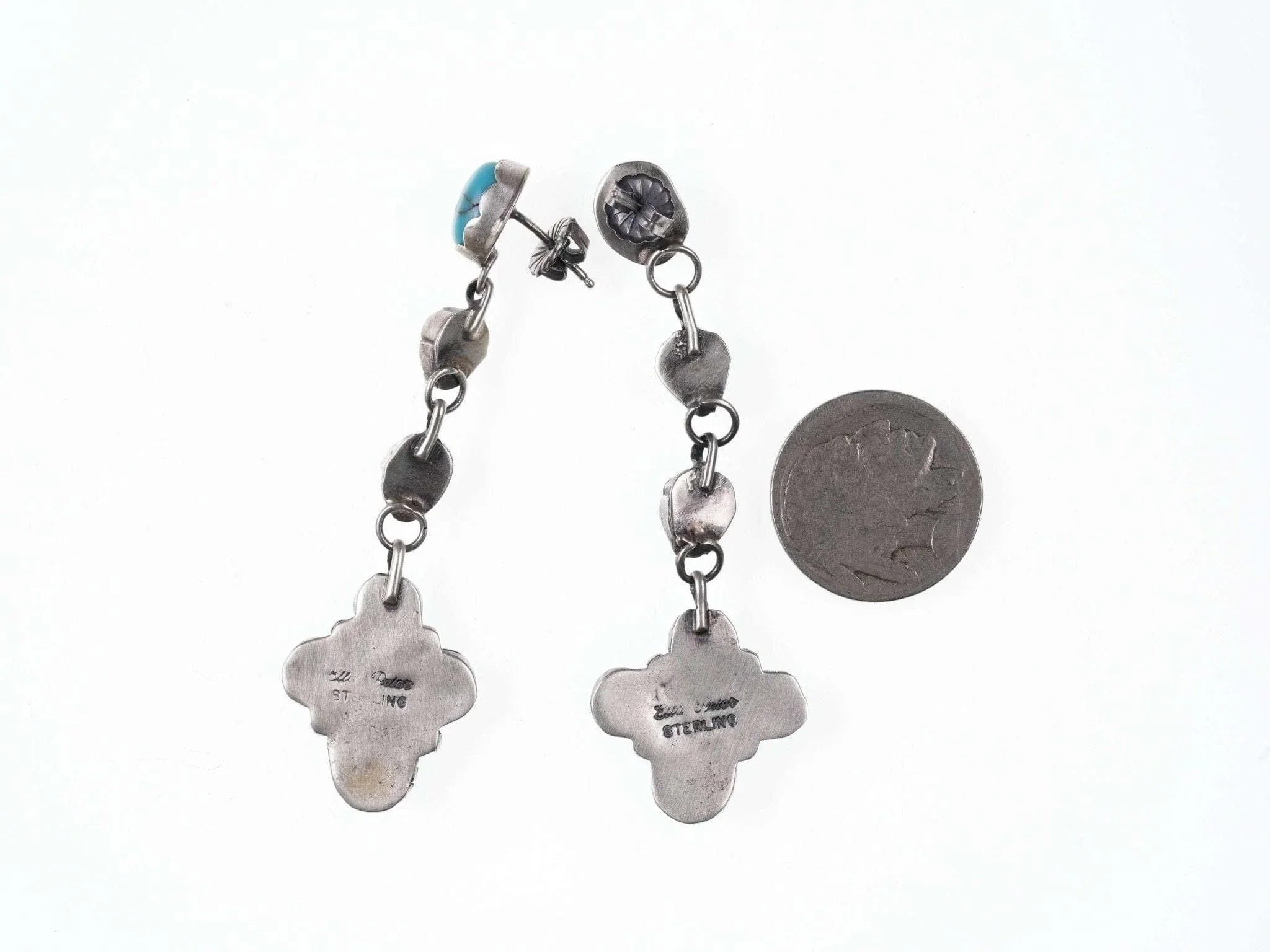 Ella Peter Navajo Sterling Egyptian Turquoise earrings. No damage or detectable<br>wear 2 5/8" long x .75" wide 11.9 grams total.<br><br>Ella Peter, Navajo silversmith was born April 2, 1943 in the Tsa-ya-toh area in<br>New Mexico on the Navajo reservation. At a very young age, she learned the art<br>of making jewelry and weaving baskets from her father. She has been making<br>jewelry for over 45 years and is a master silversmith. Ella currently resides in<br>Mentmore, New Mexico.