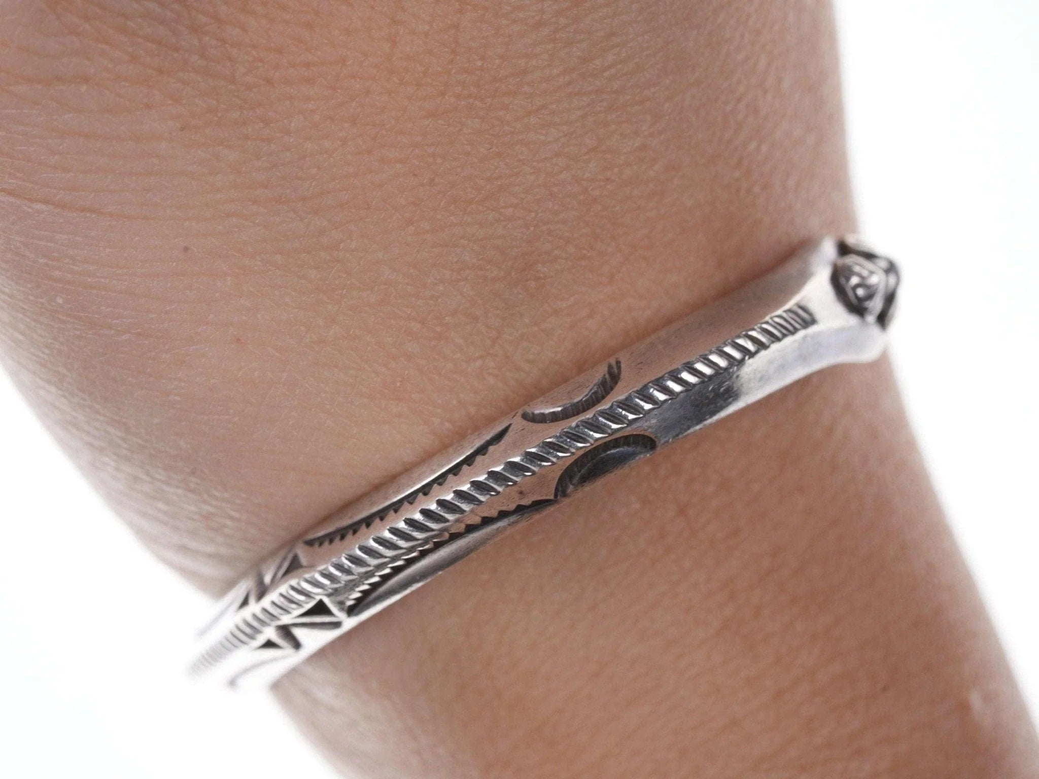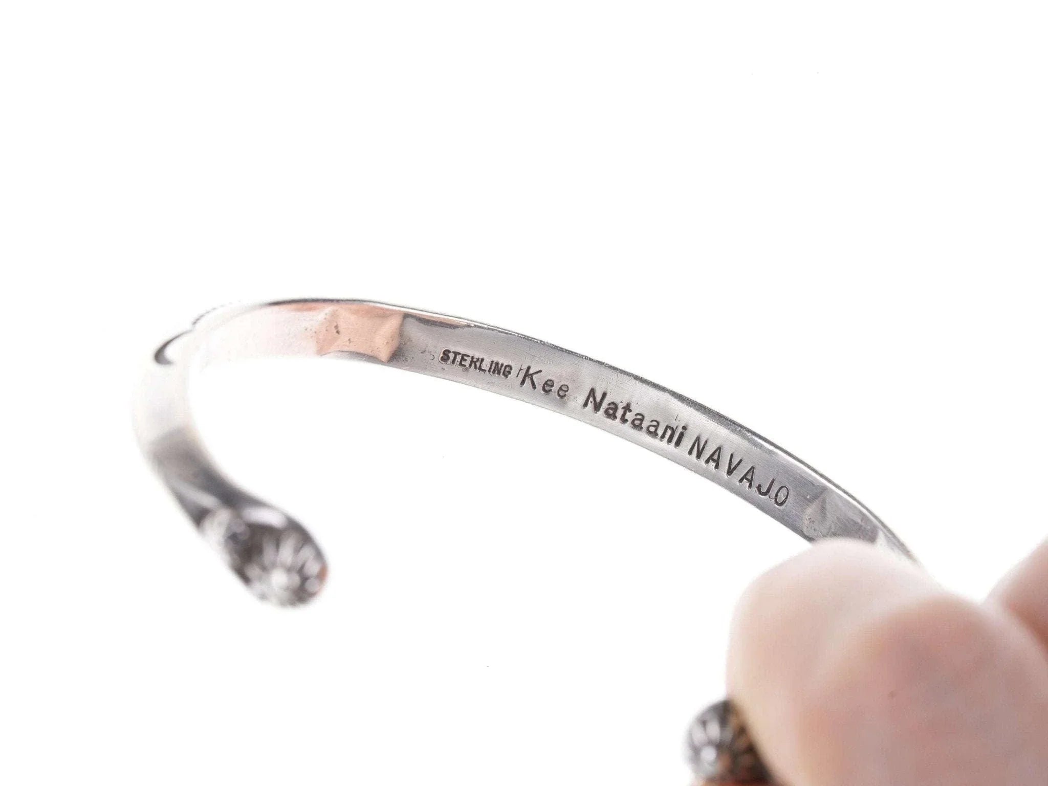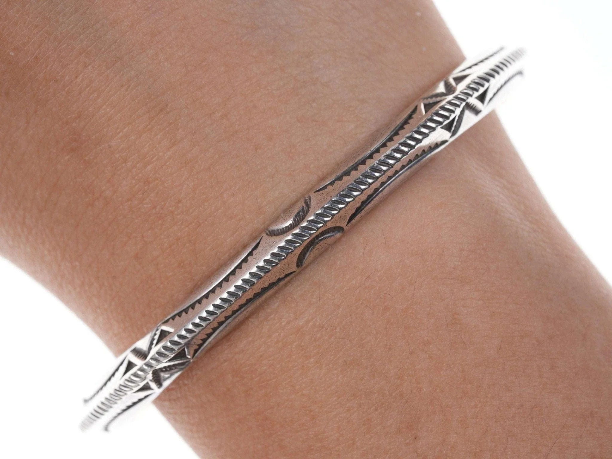 Kee Nataani Navajo Hand stamped sterling cuff bracelet. Fits up to a 6.5" wrist<br>23.2 grams.<br><br>Karl "Kee" Nataani believes that becoming a silversmith must have been in his<br>blood: His maternal grandmother was from the Peshlaki family, "peshlaki" being<br>the Navajo word for silver. His impeccable craftsmanship, developed through<br>decades of practice, is testament to the thought. He lives and works within the<br>Navajo Nation in Arizona where he and his wife also tend an assembly of farm<br>animals that range from cattle to chickens to a llama.<br><br>All precious metals are tested and guaranteed, any Native American jewelry<br>referred to as Silver or Sterling is guaranteed to be a minimum of 90% (coin)<br>silver and possibly higher content.