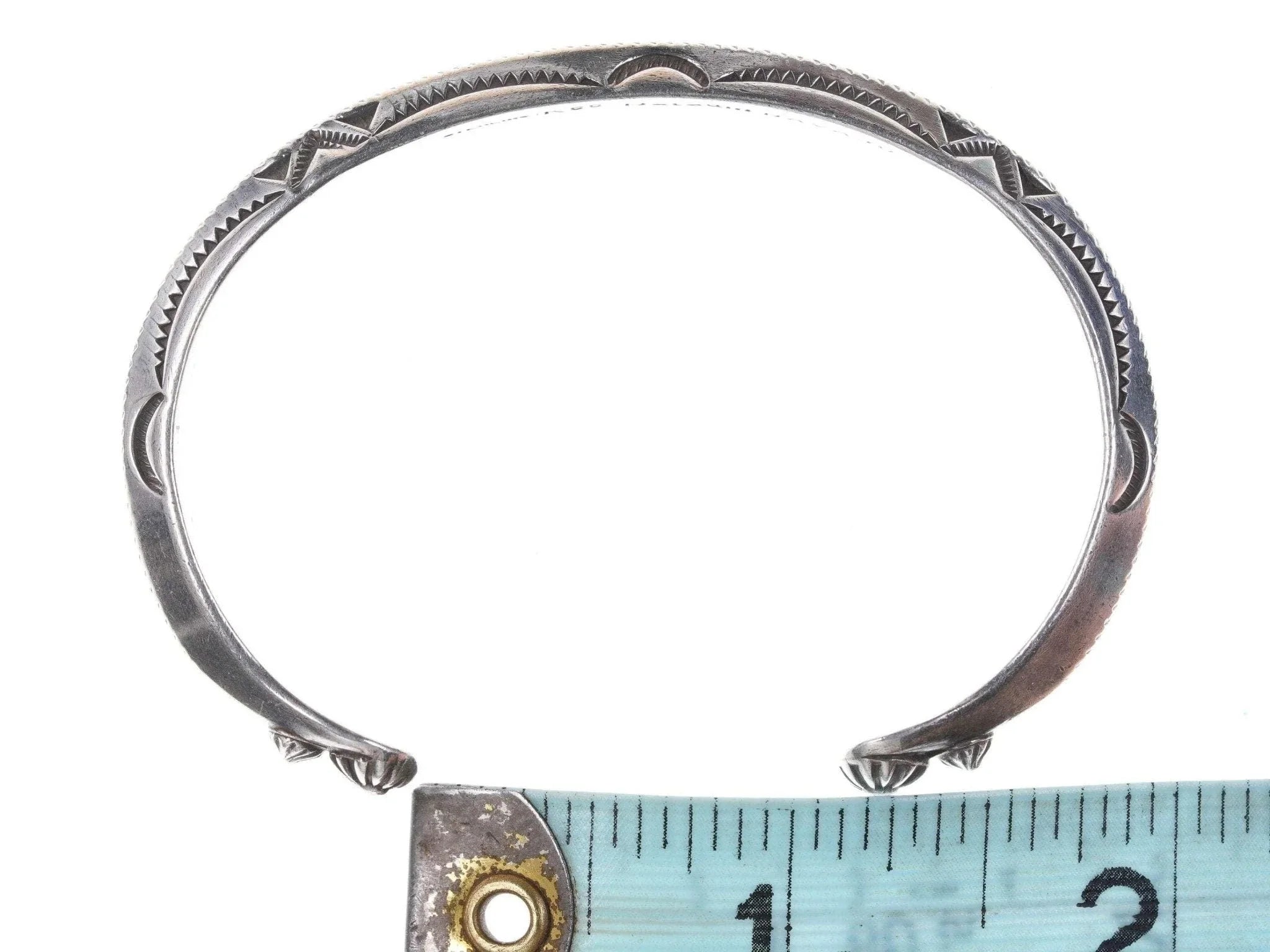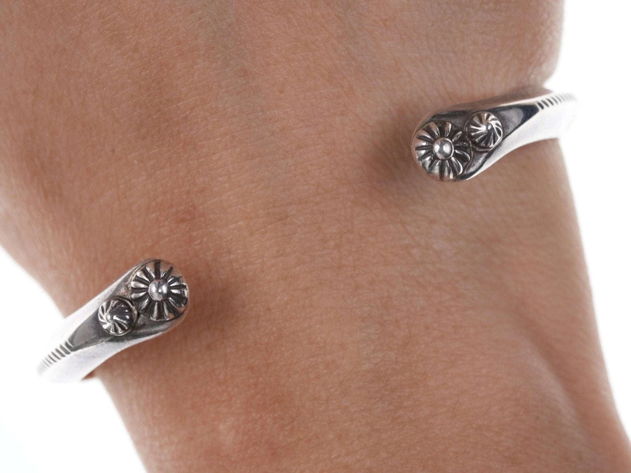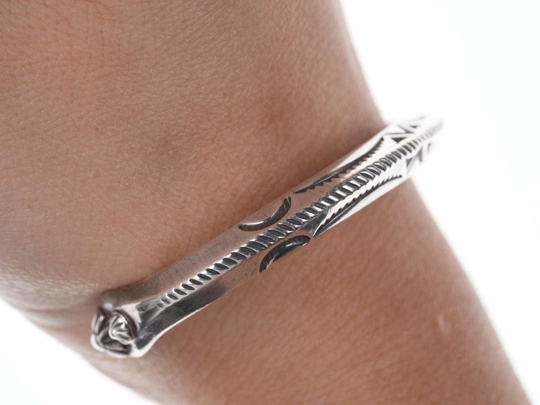 Kee Nataani Navajo Hand stamped sterling cuff bracelet. Fits up to a 6.5" wrist<br>23.2 grams.<br><br>Karl "Kee" Nataani believes that becoming a silversmith must have been in his<br>blood: His maternal grandmother was from the Peshlaki family, "peshlaki" being<br>the Navajo word for silver. His impeccable craftsmanship, developed through<br>decades of practice, is testament to the thought. He lives and works within the<br>Navajo Nation in Arizona where he and his wife also tend an assembly of farm<br>animals that range from cattle to chickens to a llama.<br><br>All precious metals are tested and guaranteed, any Native American jewelry<br>referred to as Silver or Sterling is guaranteed to be a minimum of 90% (coin)<br>silver and possibly higher content.