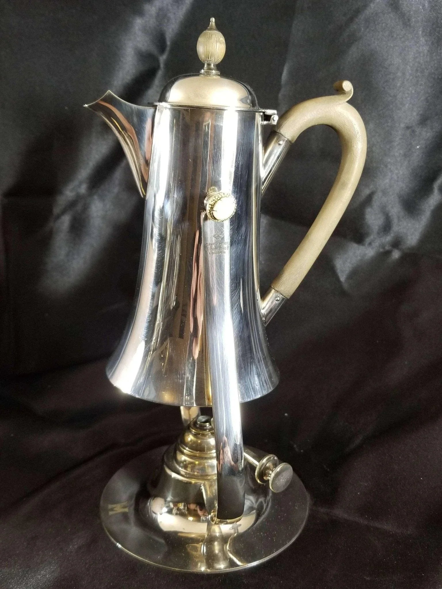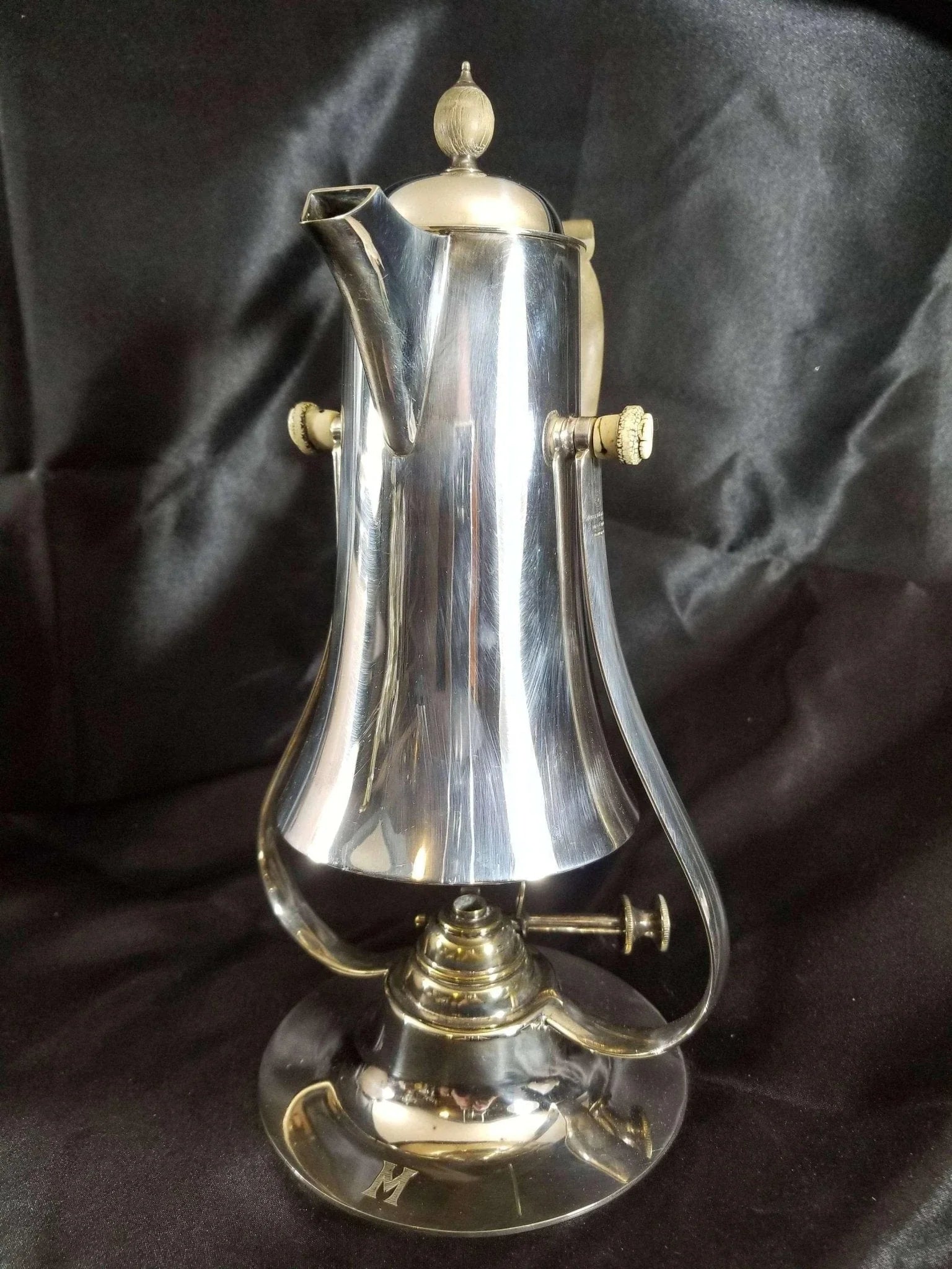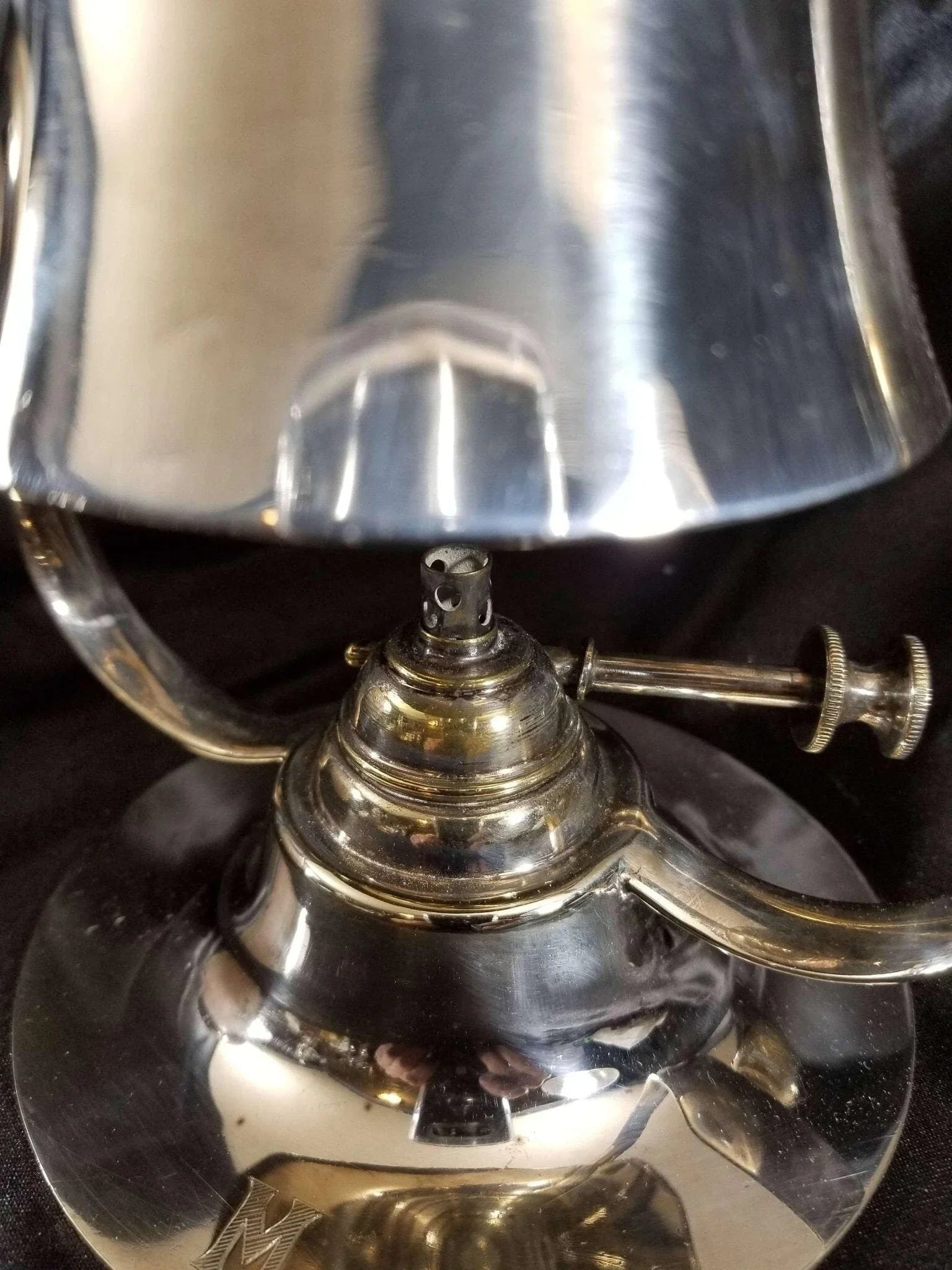 I'm not 100% sure this is a Dresser design as I could find no records on an<br>identical piece.<br><br>Measures 11" tall total, base is 5 1/8" wide. burner mechanism is functional.<br>Knob turns and wick goes up. There may have been a cap that covered the burner<br>when not in use. M monogram on Base. Rd no. 600494 stamped in center on base,<br>which dates it to 1912. Patent stamped on burner knob. Minor wear to Silverplate<br>underneath bear<br>Base and on burner/knob.<br><br>Hukin and Heath, a silver and Silverplate company was established by Jonathan<br>Wilson Hukin and Thomas Heath c.1855. A strong relationship was developed with<br>Dr Christopher dress as the head designer from 1877 until c.1881. Dressers'<br>designs were launched at the opening of the firm's showrooms on Charterhouse<br>street in August 1879. Some of Dresser's designs were manufactured until after<br>1900.<br>Tw10