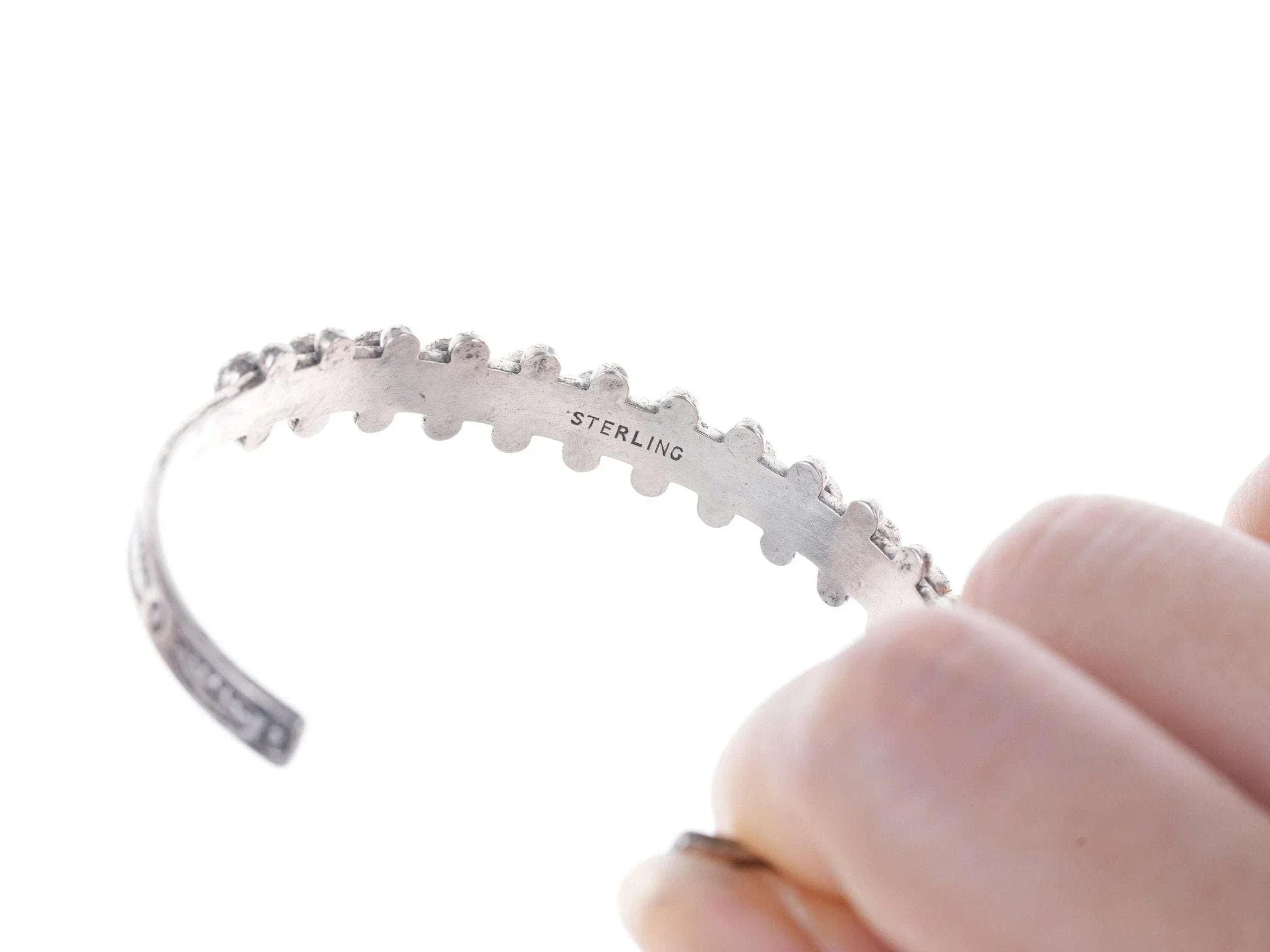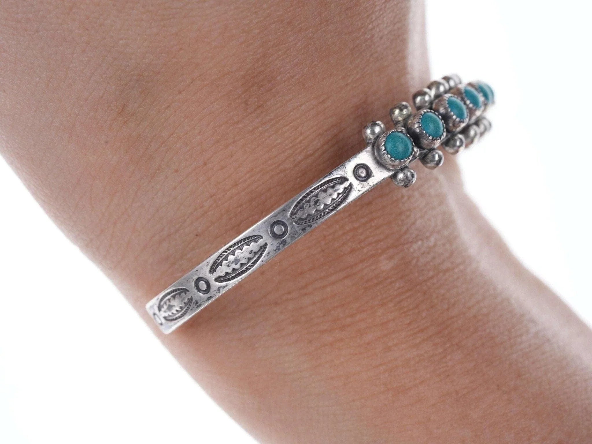 c1950's Native American stamped sterling snake eye turquoise cuff bracelet.<br><br>All precious metals are tested and guaranteed, any Native American jewelry<br>referred to as Silver or Sterling is guaranteed to be a minimum of 90% (coin)<br>silver and possibly higher content. Most cuff bracelets are shown photographed<br>on a 6" woman's wrist and will include a photo showing the inside circumference<br>where the metal tip meets the number on the tape measure.