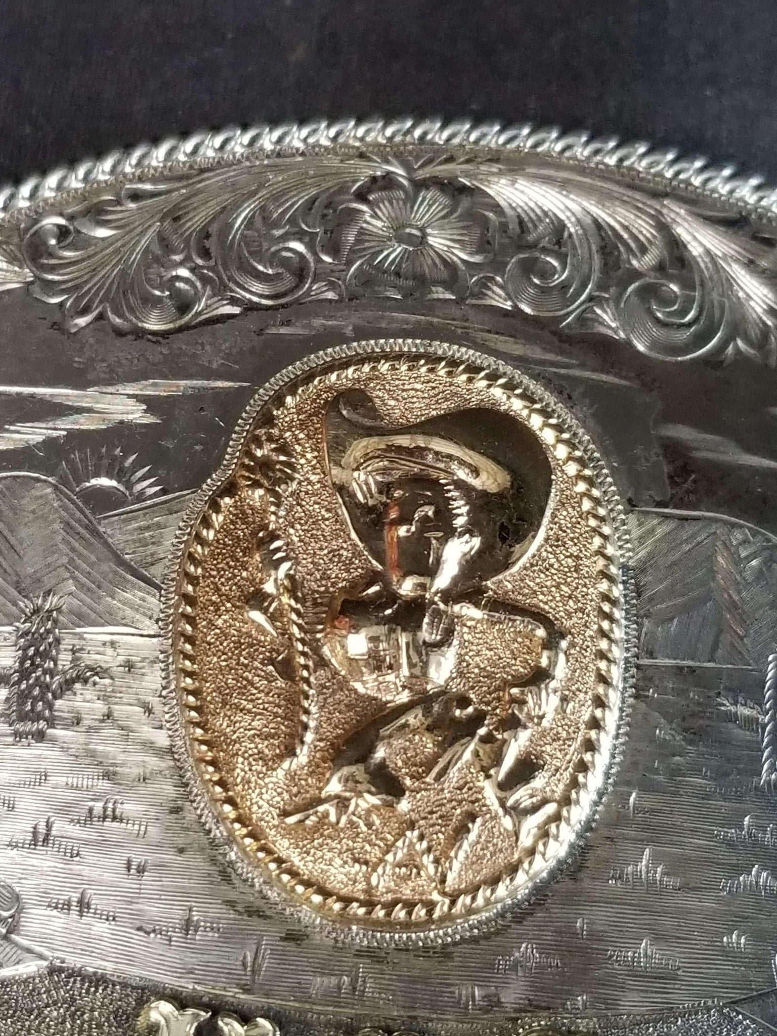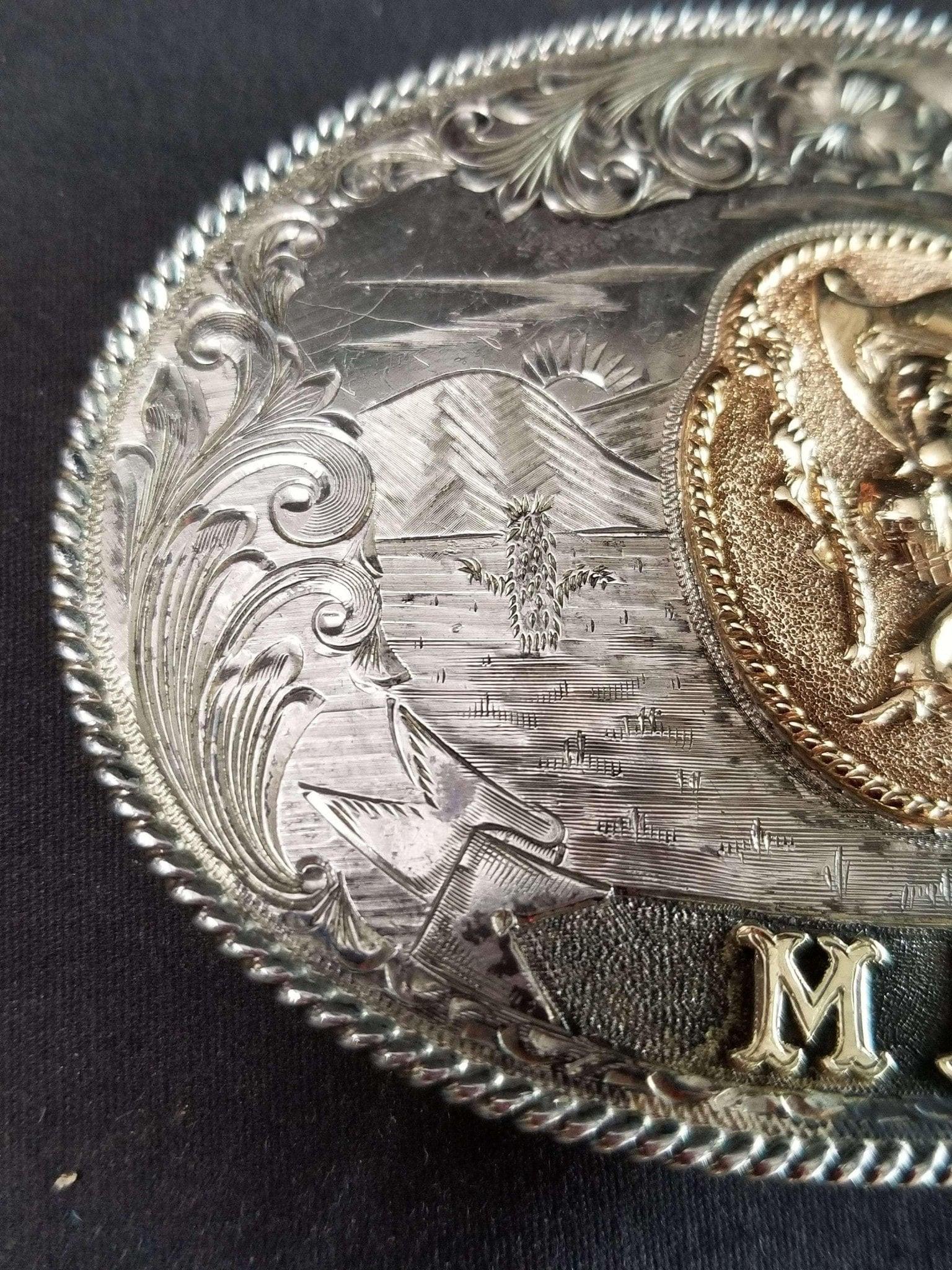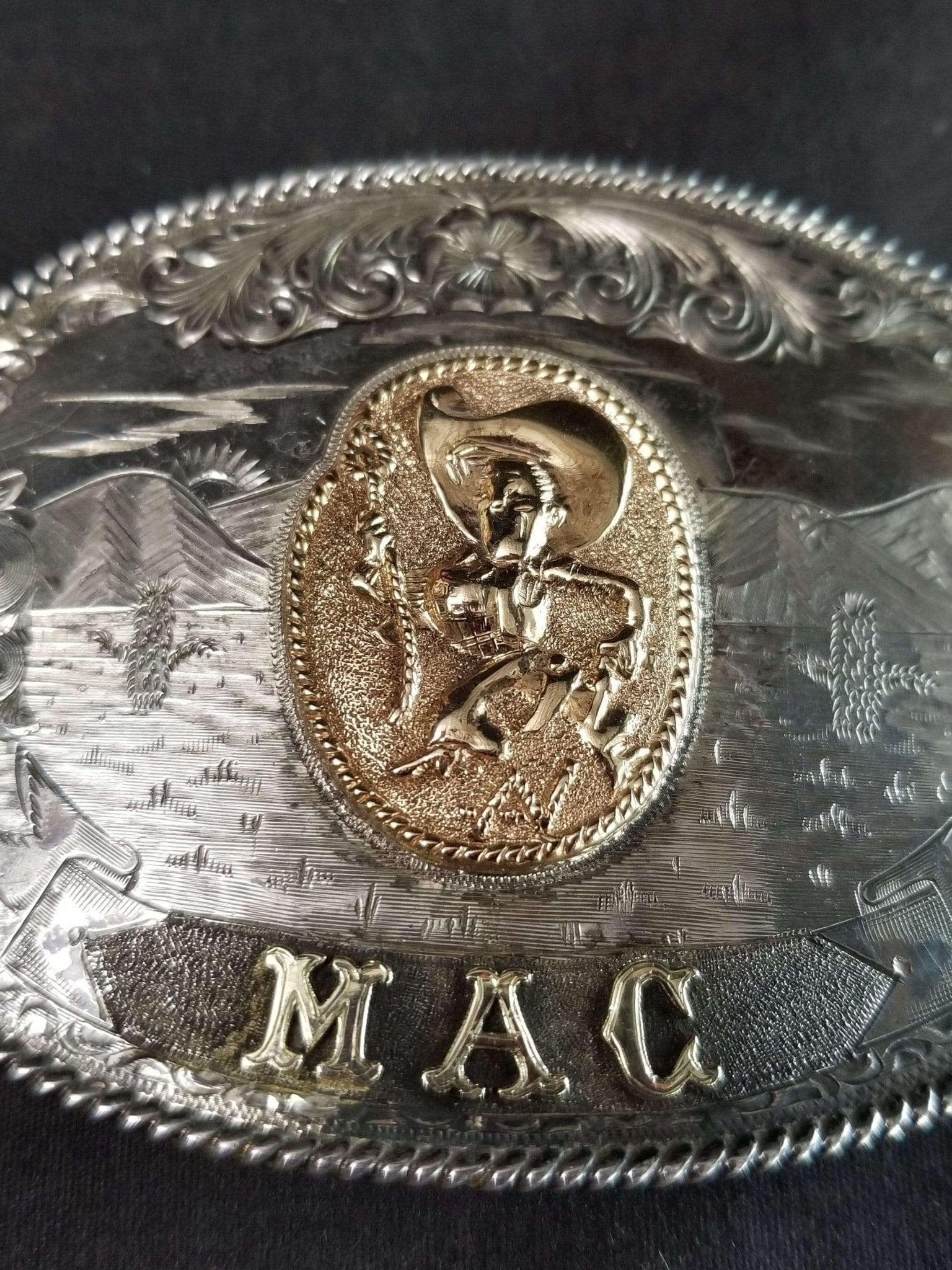 McCabe Belt Buckle Sterling & 10k Gold Cowboy with Lasso Cacti Mountains Custom<br>One of A Kind MAC Likely Presentation Piece 1.5" belt. 95.5 grams, big chunk of<br>gold. Measures 3 11/16" x 2 11/16".