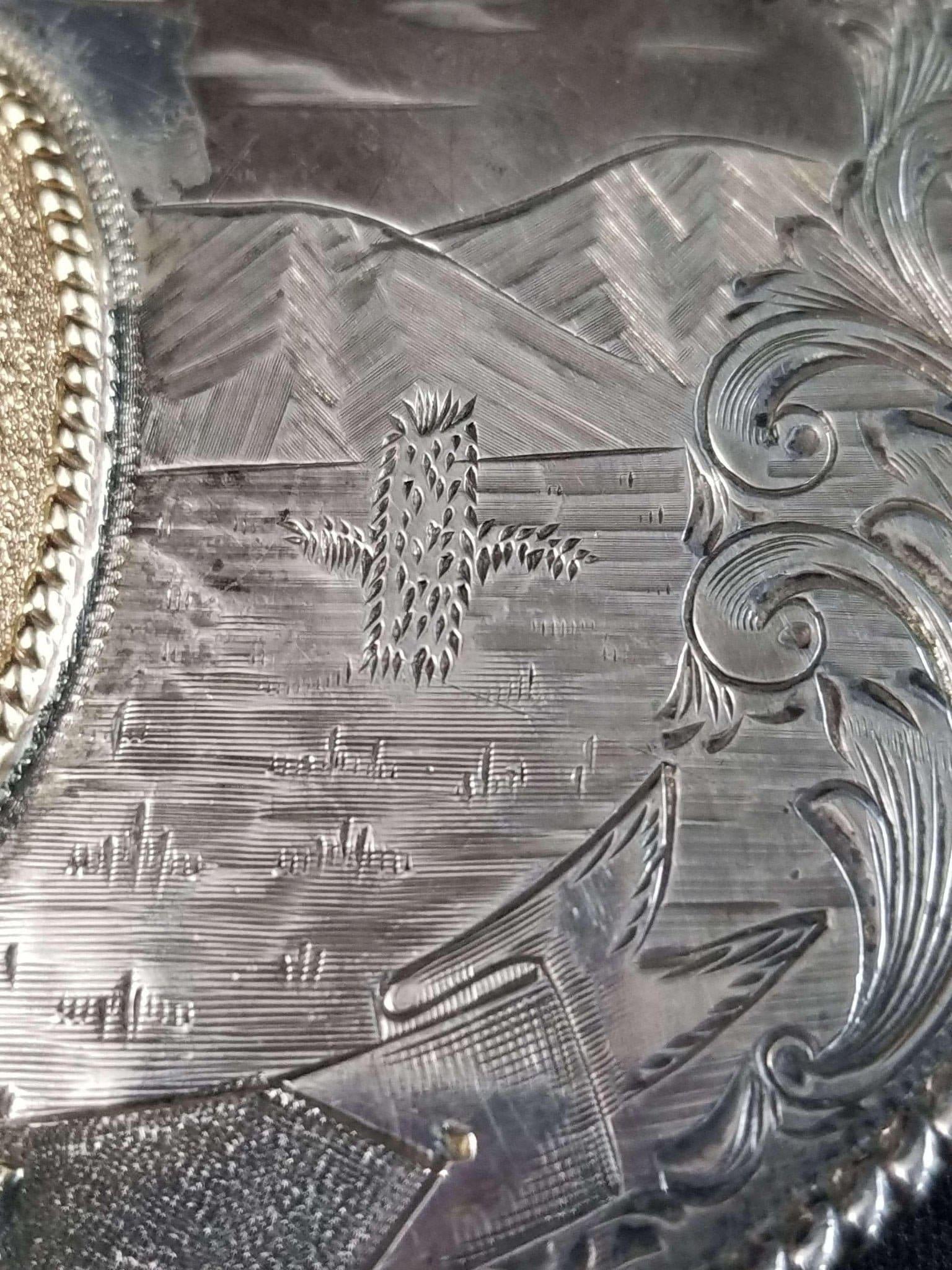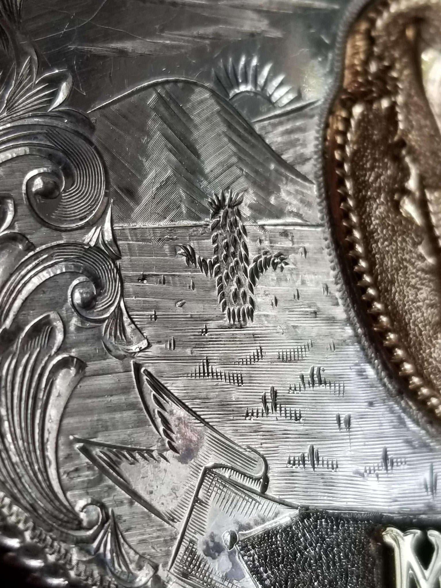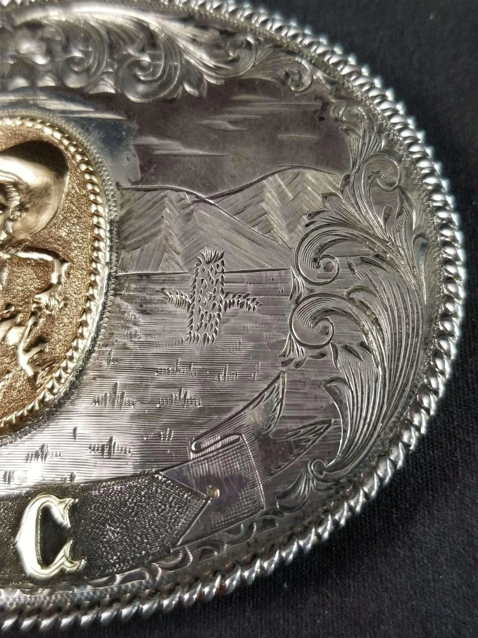 McCabe Belt Buckle Sterling & 10k Gold Cowboy with Lasso Cacti Mountains Custom<br>One of A Kind MAC Likely Presentation Piece 1.5" belt. 95.5 grams, big chunk of<br>gold. Measures 3 11/16" x 2 11/16".