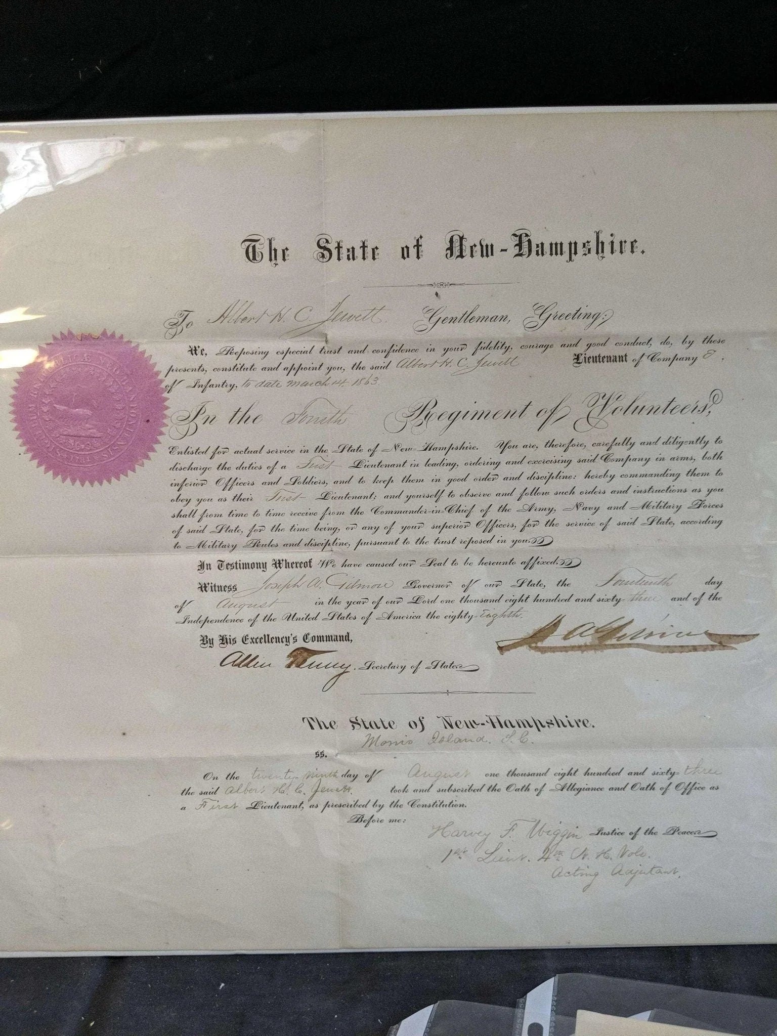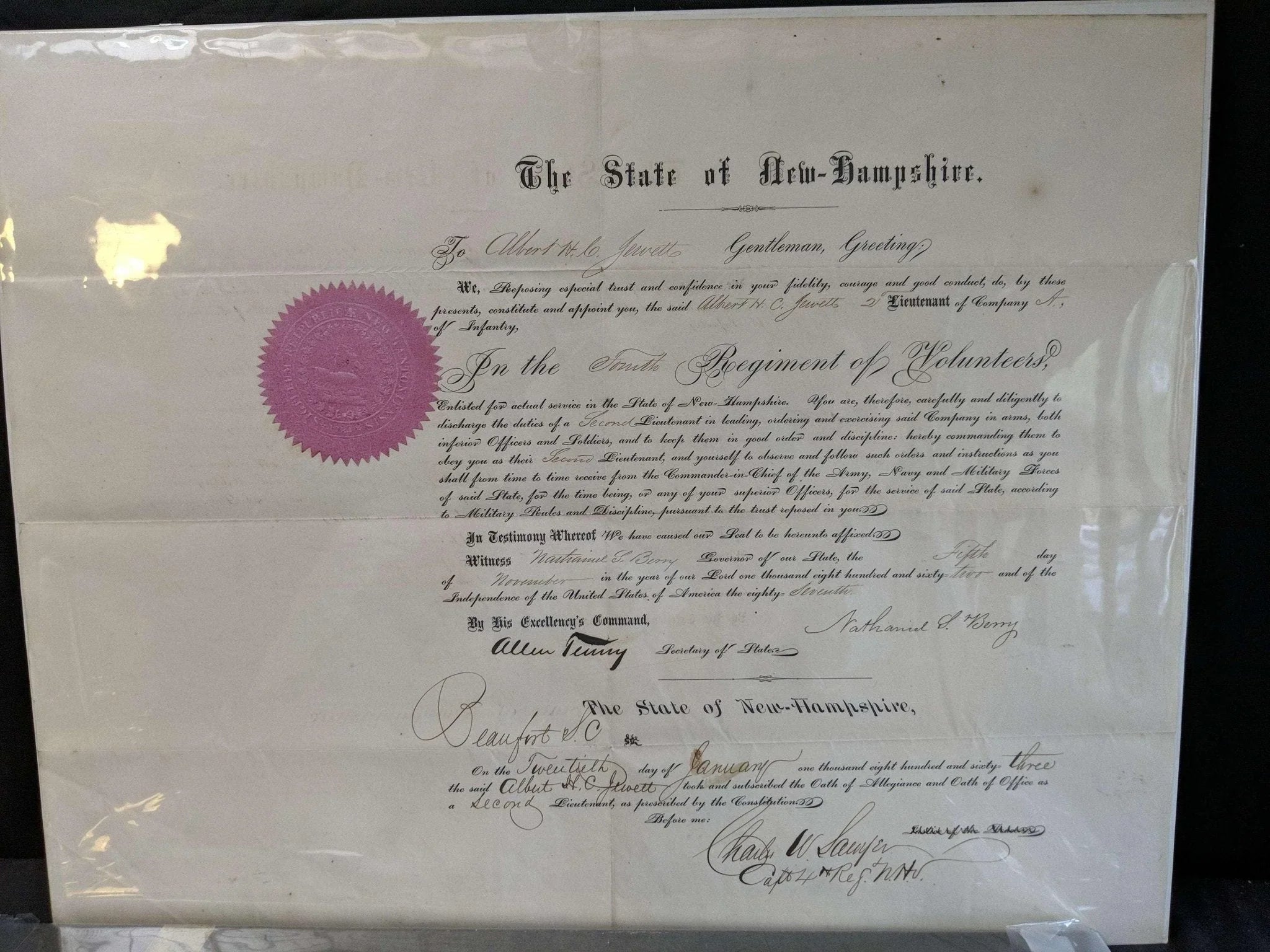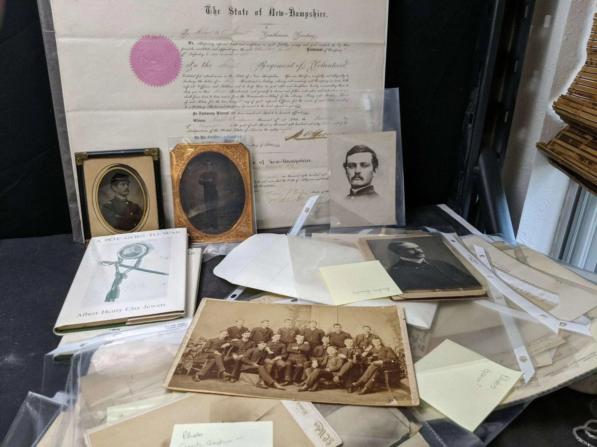 Id'd Civil War Photos Memoir, Documents, New Hampshire Autographed Biography<br>from Daughter Very Extensive<br><br>lot) Family archive of Albert Henry Clay Jewett (New Hampshire, Washington,<br>D.C.,1841-1898), discharged as First Lieutenant, Fourth Regiment of Volunteers,<br>State of New Hampshire, Army of the Potomac, later employed at the U.S.<br>Department of Interior, Bureau of Pensions, Washington, D.C.: (1) half plate<br>tintype of Jewett standing, uniform includes officer epaulettes; (1) quarter<br>plate tintype of Jewett from waist up, his uniform includes kepi and officer<br>epaulettes; (1) albumen head shot of Jewett, the collar of his uniform is<br>visible; (1) certificate appointing Jewett a Second Lieutenant effective<br>November 5, 1862 signed by Nathaniel S. Berry, Governor of New Hampshire with<br>the state seal; (1) certificate appointing Jewett a First Lieutenant effective<br>August 14, 1863 signed by Joseph A Gilmore, Governor of New Hampshire with the<br>state seal: (2) books, "A Boy Goes to War" by Albert Henry Clay Jewett,<br>copyright Grace J. Austin, 1944 (Grace, his daughter) one signed at the at the<br>interior by Grace, the book being a autobiographical sketch of Jewett's war<br>experience, the front piece and dust cover a photo picture of Jewett and his<br>sword; (1) 1892 letter from the State of New Hampshire, Adjutant-General's<br>office reciting the Revolutionary War record of Jewett's grandfather' (1)<br>tintype, 1/16 plate size likeness of a woman believed to be Jewett's wife or<br>lady friend, marked in ink "Picture rec'd in service about 1862 or 1863 from<br>T(J?)erry; documents related to his Bureau of Pensions employment; together with<br>large group of family letters relating to Jewett, for shipping largest item: 17"<br>x 14", total: 5.35lbs<br><br>There's many letters and photos from Frank M Austin to the daughter Grace who<br>published the book of memoirs AHC Jewett wrote. Really so much stuff, not all<br>civil war, but all connected to the family.
