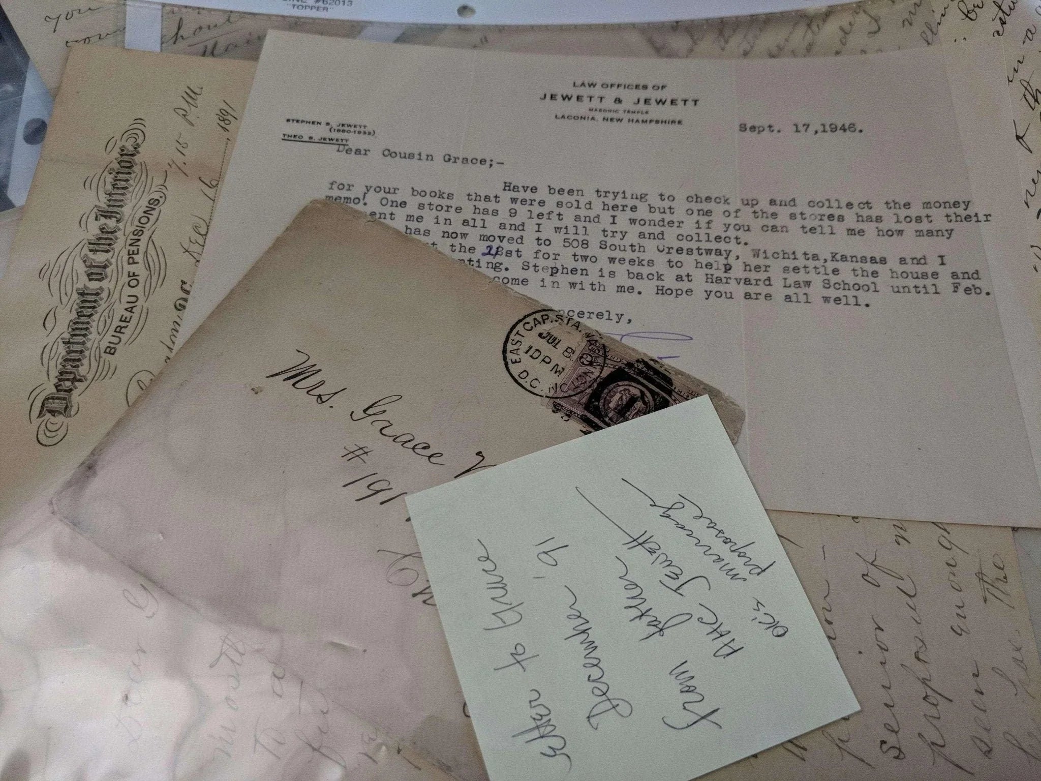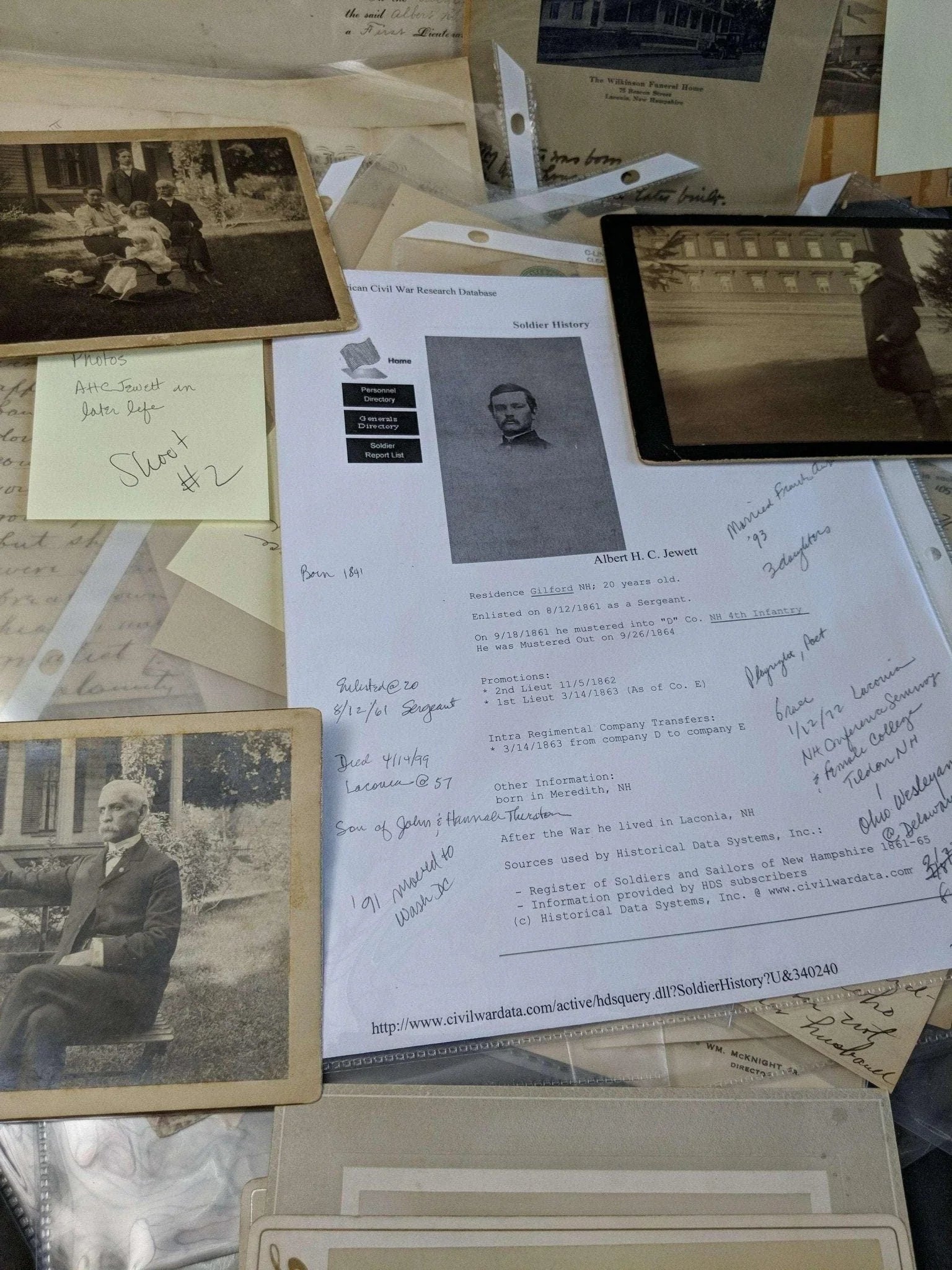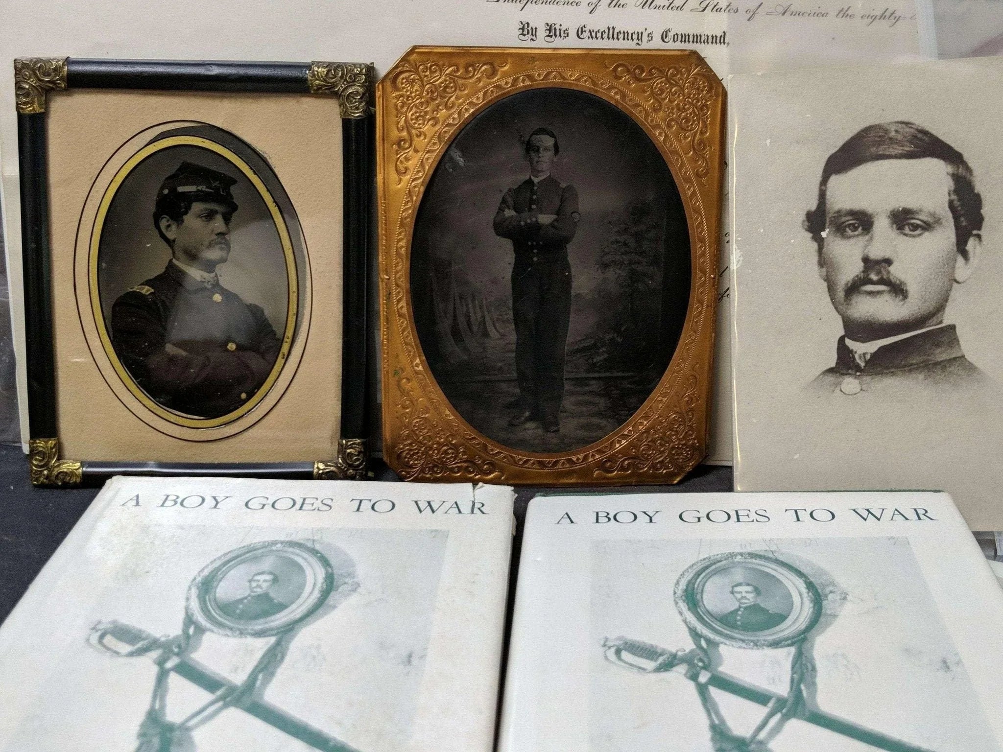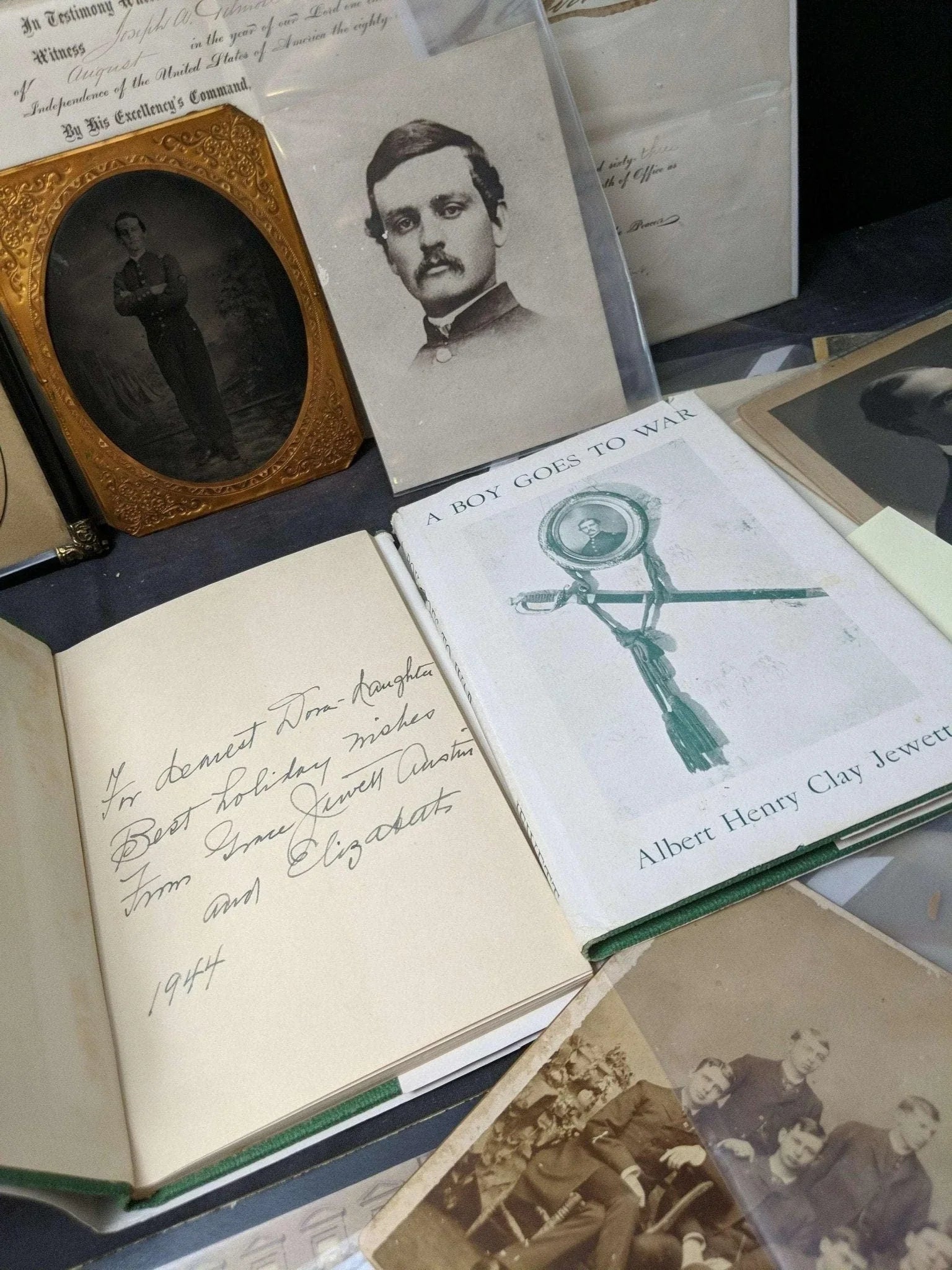 Id'd Civil War Photos Memoir, Documents, New Hampshire Autographed Biography<br>from Daughter Very Extensive<br><br>lot) Family archive of Albert Henry Clay Jewett (New Hampshire, Washington,<br>D.C.,1841-1898), discharged as First Lieutenant, Fourth Regiment of Volunteers,<br>State of New Hampshire, Army of the Potomac, later employed at the U.S.<br>Department of Interior, Bureau of Pensions, Washington, D.C.: (1) half plate<br>tintype of Jewett standing, uniform includes officer epaulettes; (1) quarter<br>plate tintype of Jewett from waist up, his uniform includes kepi and officer<br>epaulettes; (1) albumen head shot of Jewett, the collar of his uniform is<br>visible; (1) certificate appointing Jewett a Second Lieutenant effective<br>November 5, 1862 signed by Nathaniel S. Berry, Governor of New Hampshire with<br>the state seal; (1) certificate appointing Jewett a First Lieutenant effective<br>August 14, 1863 signed by Joseph A Gilmore, Governor of New Hampshire with the<br>state seal: (2) books, "A Boy Goes to War" by Albert Henry Clay Jewett,<br>copyright Grace J. Austin, 1944 (Grace, his daughter) one signed at the at the<br>interior by Grace, the book being a autobiographical sketch of Jewett's war<br>experience, the front piece and dust cover a photo picture of Jewett and his<br>sword; (1) 1892 letter from the State of New Hampshire, Adjutant-General's<br>office reciting the Revolutionary War record of Jewett's grandfather' (1)<br>tintype, 1/16 plate size likeness of a woman believed to be Jewett's wife or<br>lady friend, marked in ink "Picture rec'd in service about 1862 or 1863 from<br>T(J?)erry; documents related to his Bureau of Pensions employment; together with<br>large group of family letters relating to Jewett, for shipping largest item: 17"<br>x 14", total: 5.35lbs<br><br>There's many letters and photos from Frank M Austin to the daughter Grace who<br>published the book of memoirs AHC Jewett wrote. Really so much stuff, not all<br>civil war, but all connected to the family.