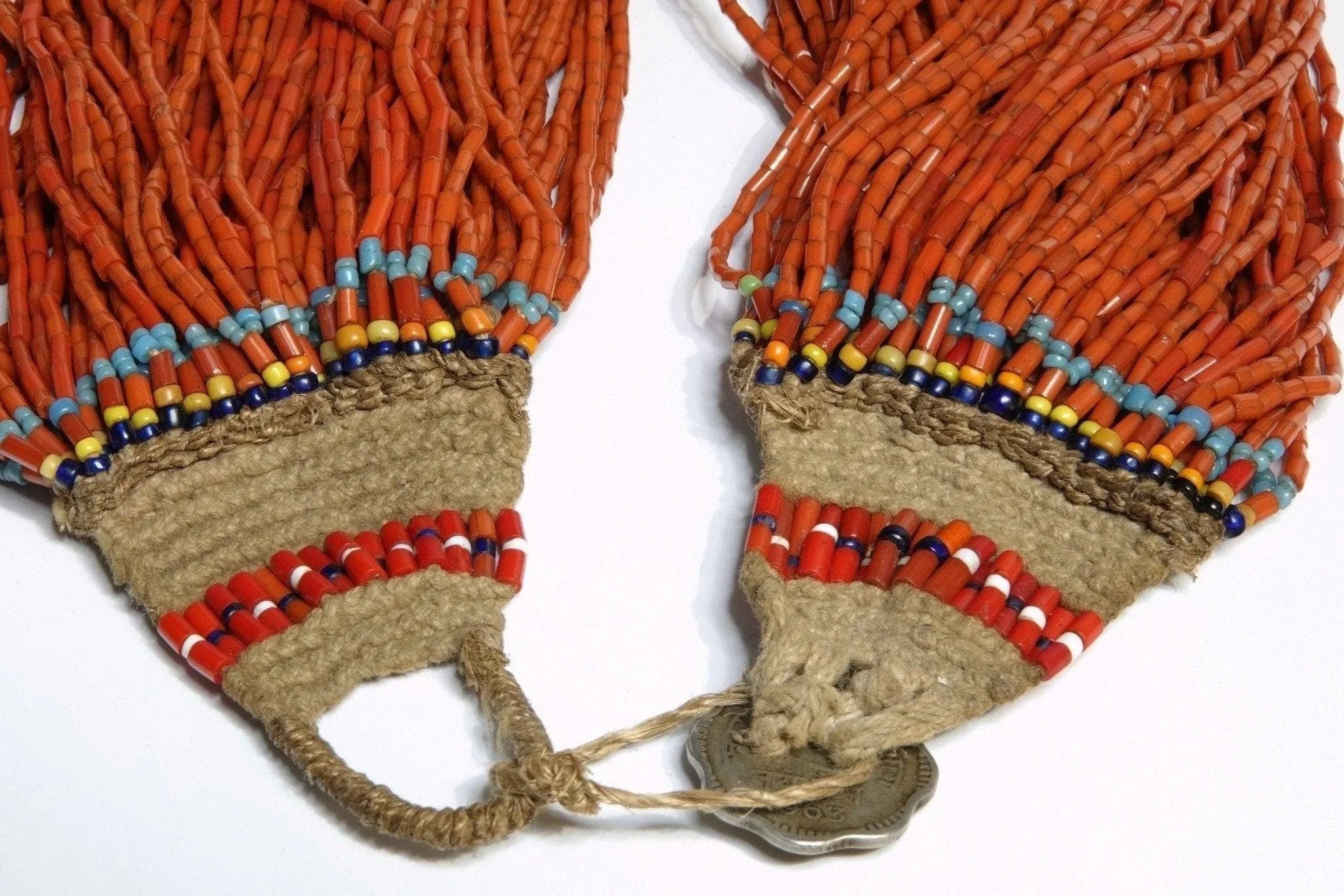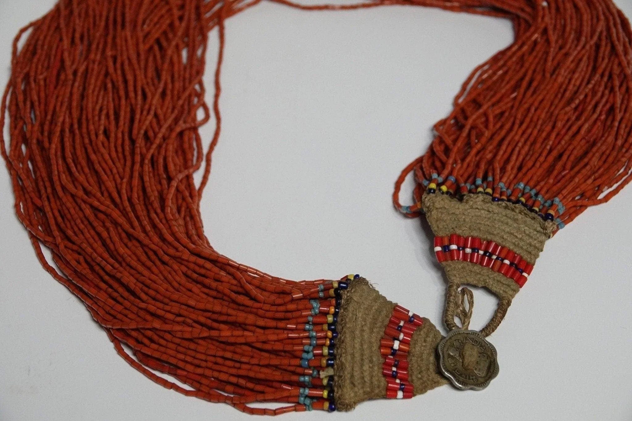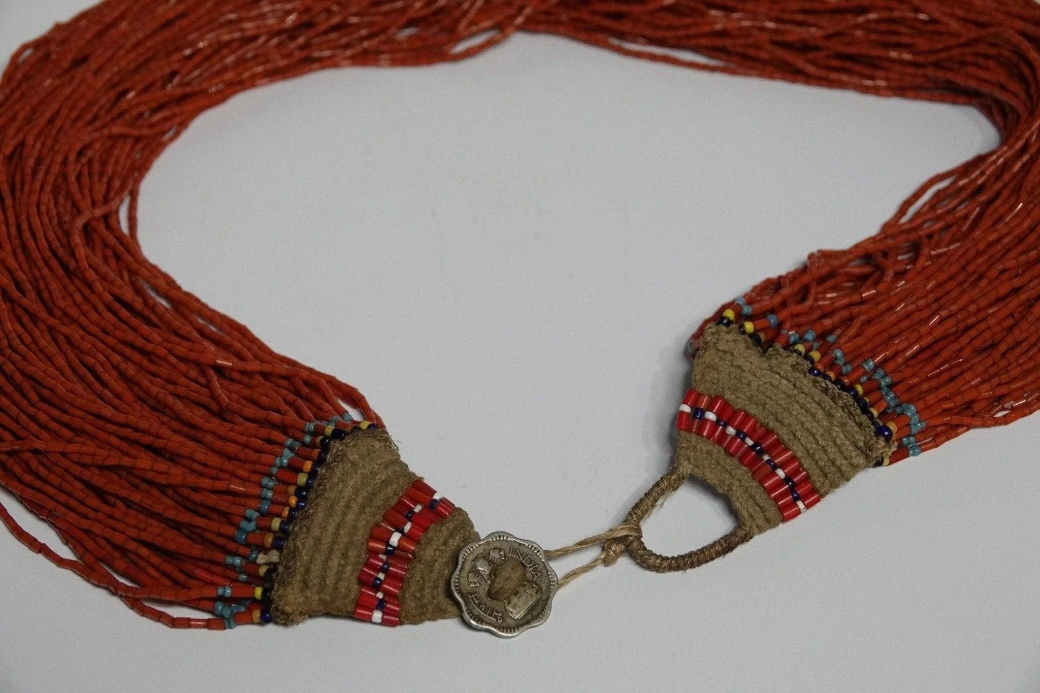 1960's Tribal India Coral and Hemp Beaded Multistrand Necklace with 1963 Coin Cl