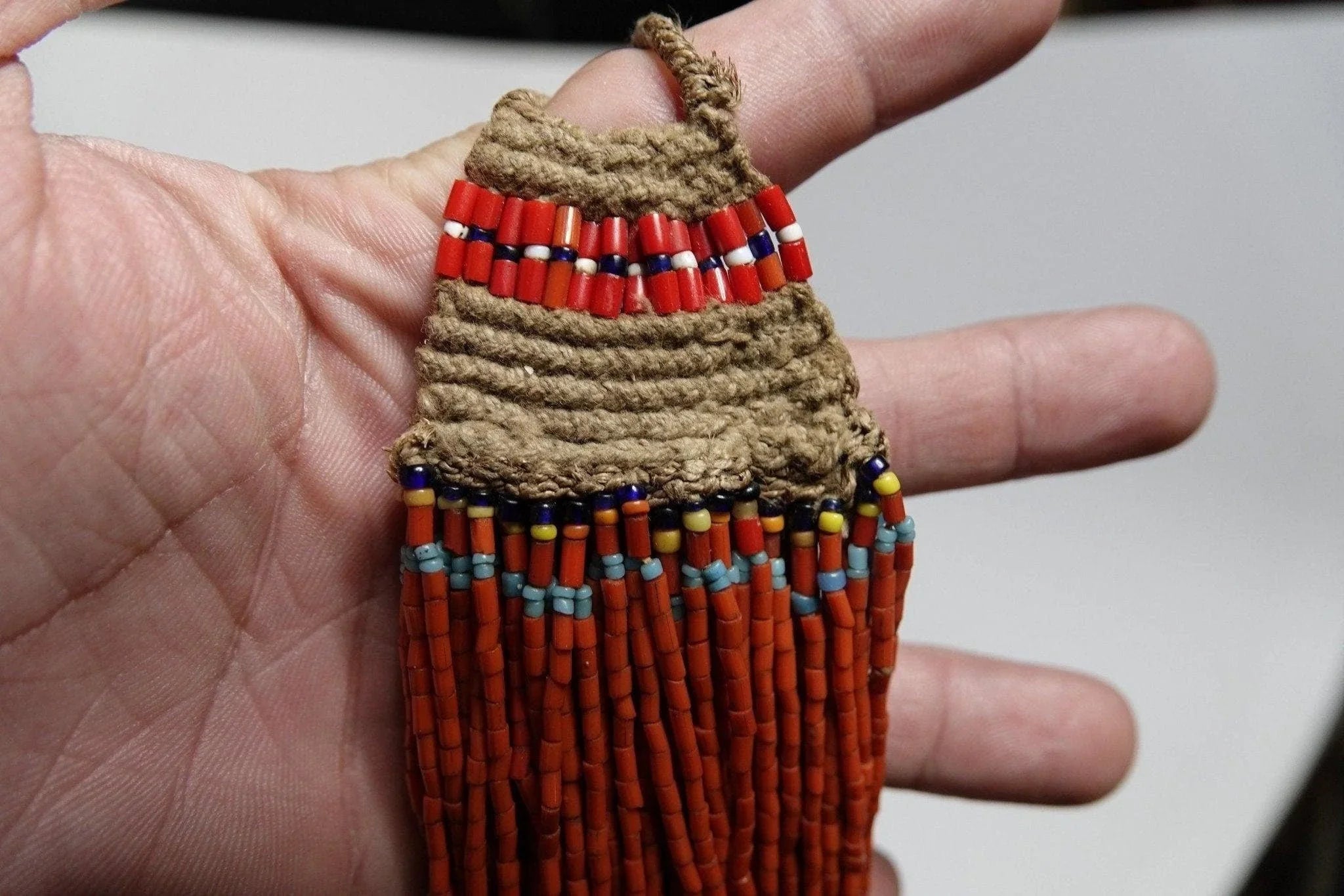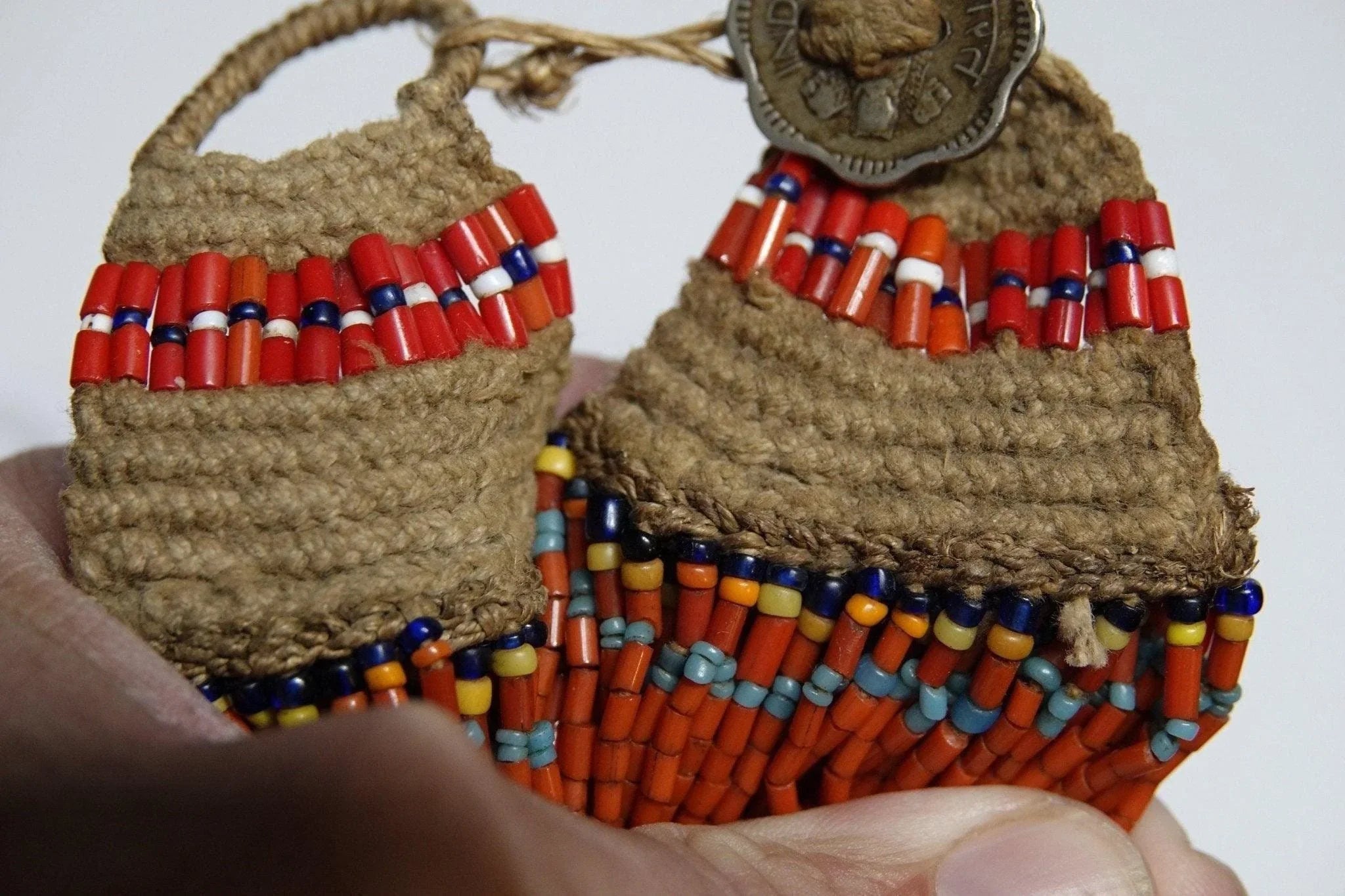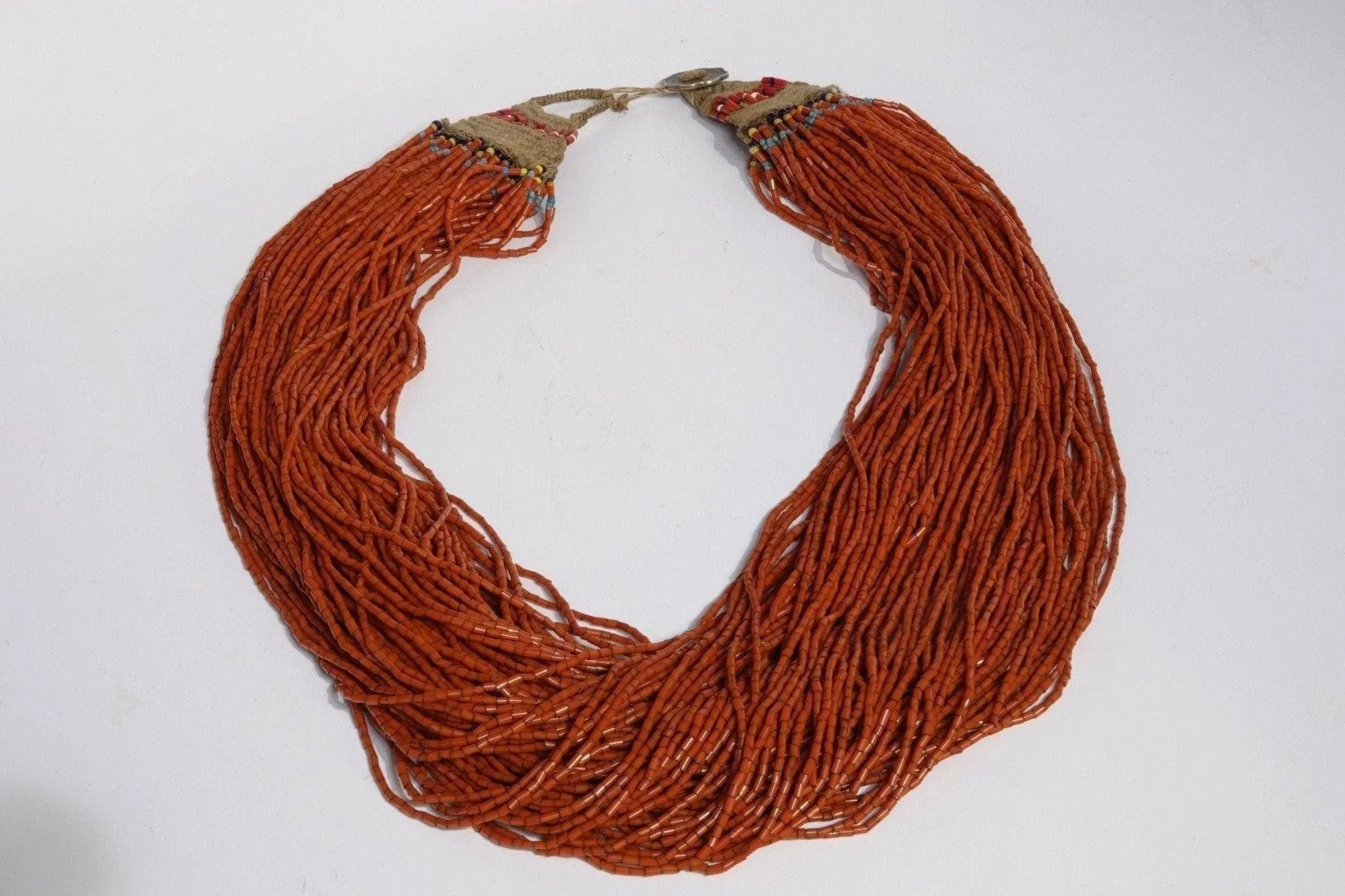 1960's Tribal India Coral and Hemp Beaded Multistrand Necklace with 1963 Coin Cl