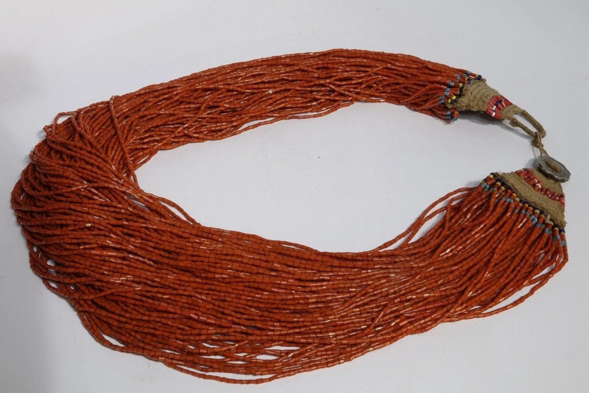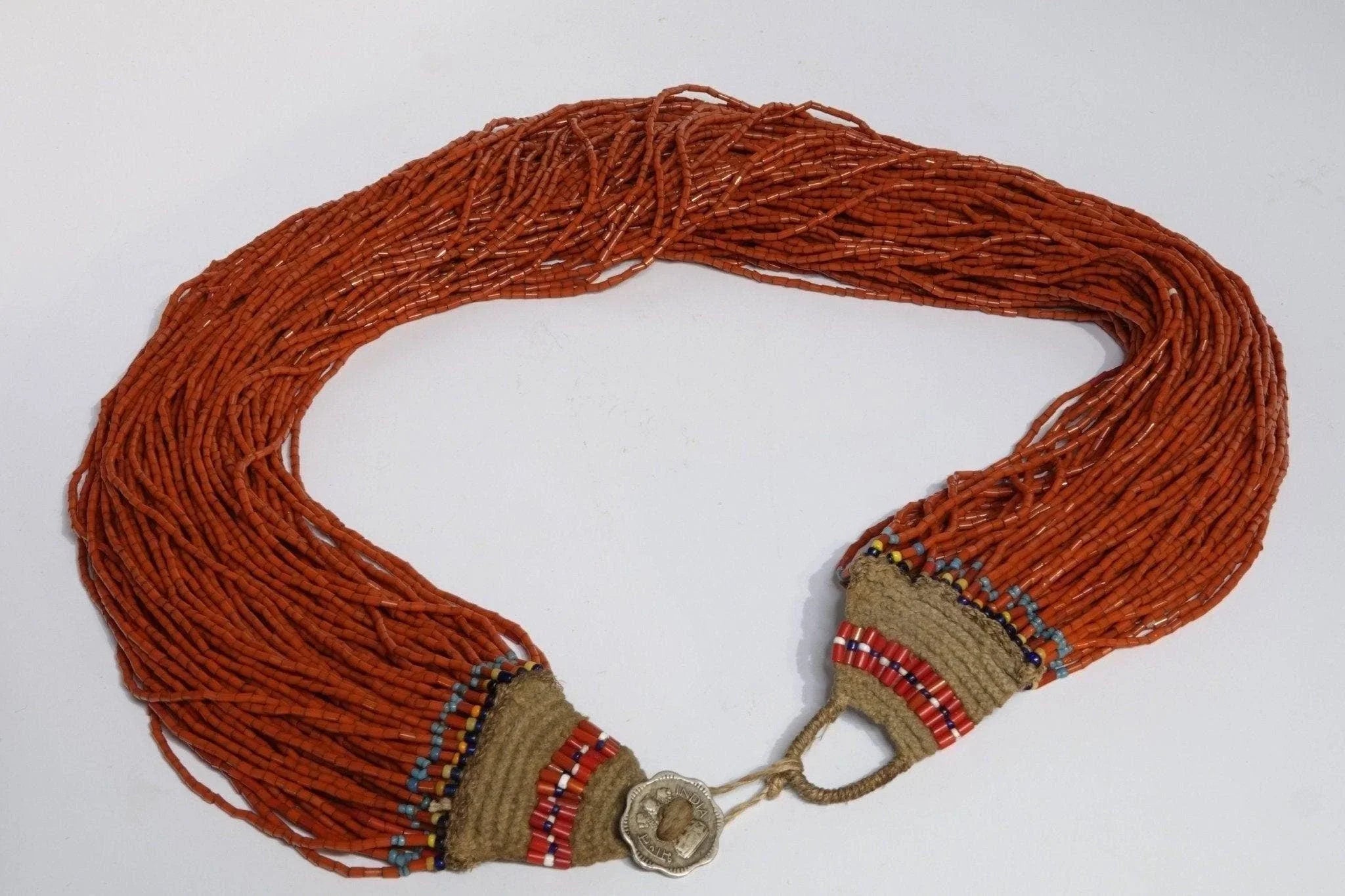 1960's Tribal India Coral and Hemp Beaded Multistrand Necklace with 1963 Coin<br>Clasp. Incredible piece with untold hours of work 27" long