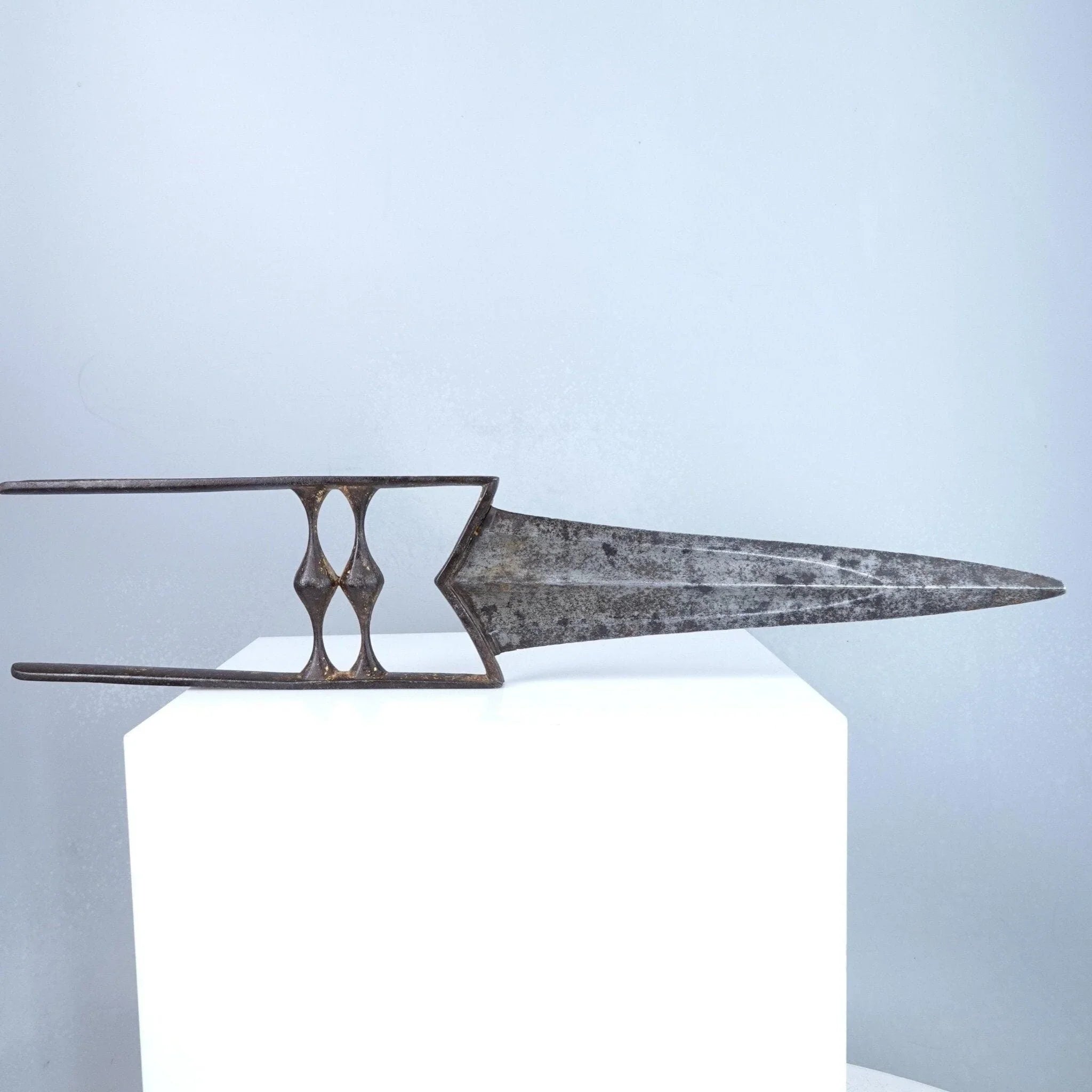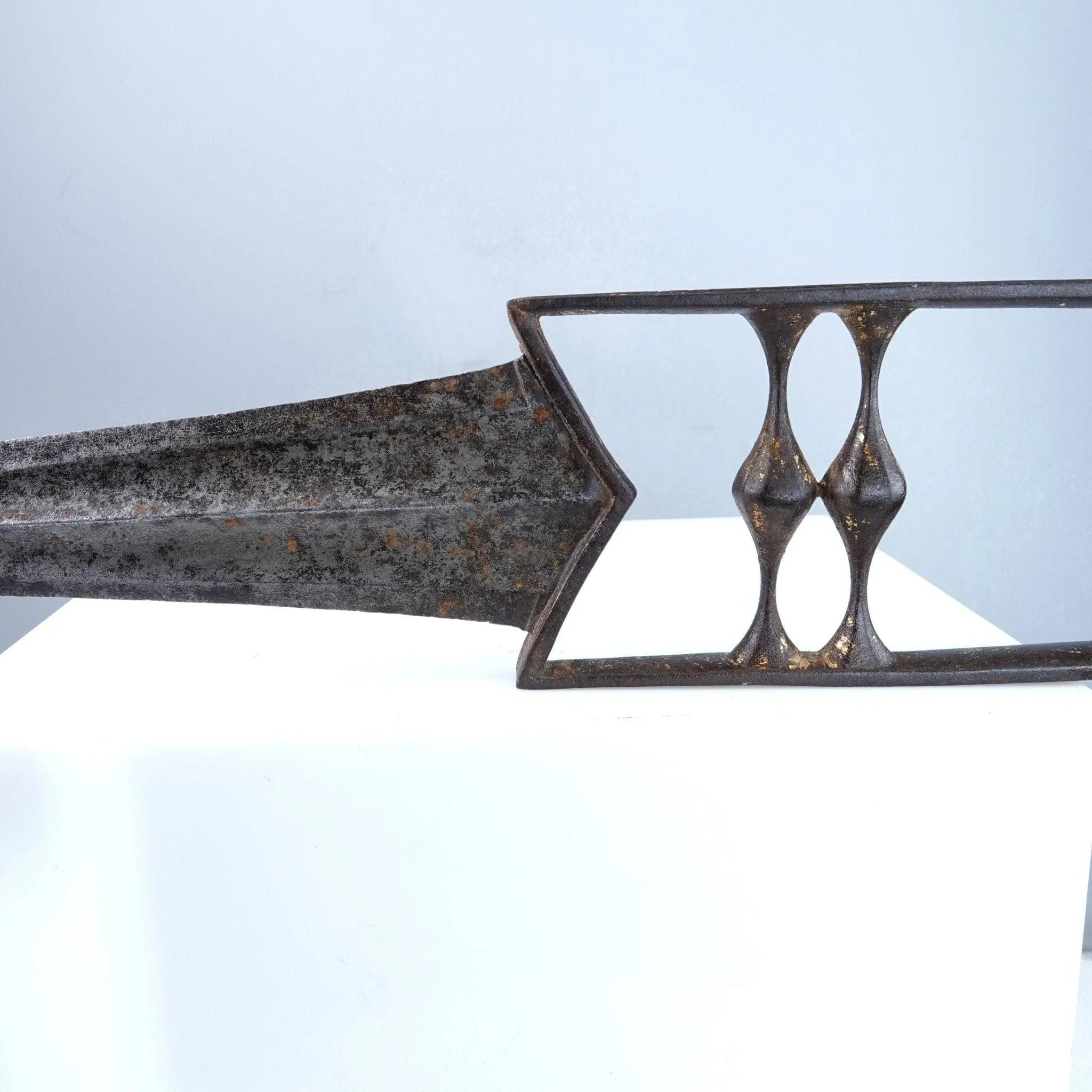 18th Century Indian Katar Tiger Knife. Great early knife 18th century with<br>incredible patina, one piece construction high carbon steel. 16 1/8" long x<br>3.25" wide at widest point. Some significant wear to gold gilt decoration as<br>expected, tip has ben blunted, blade is fairly sharp.<br>tw53