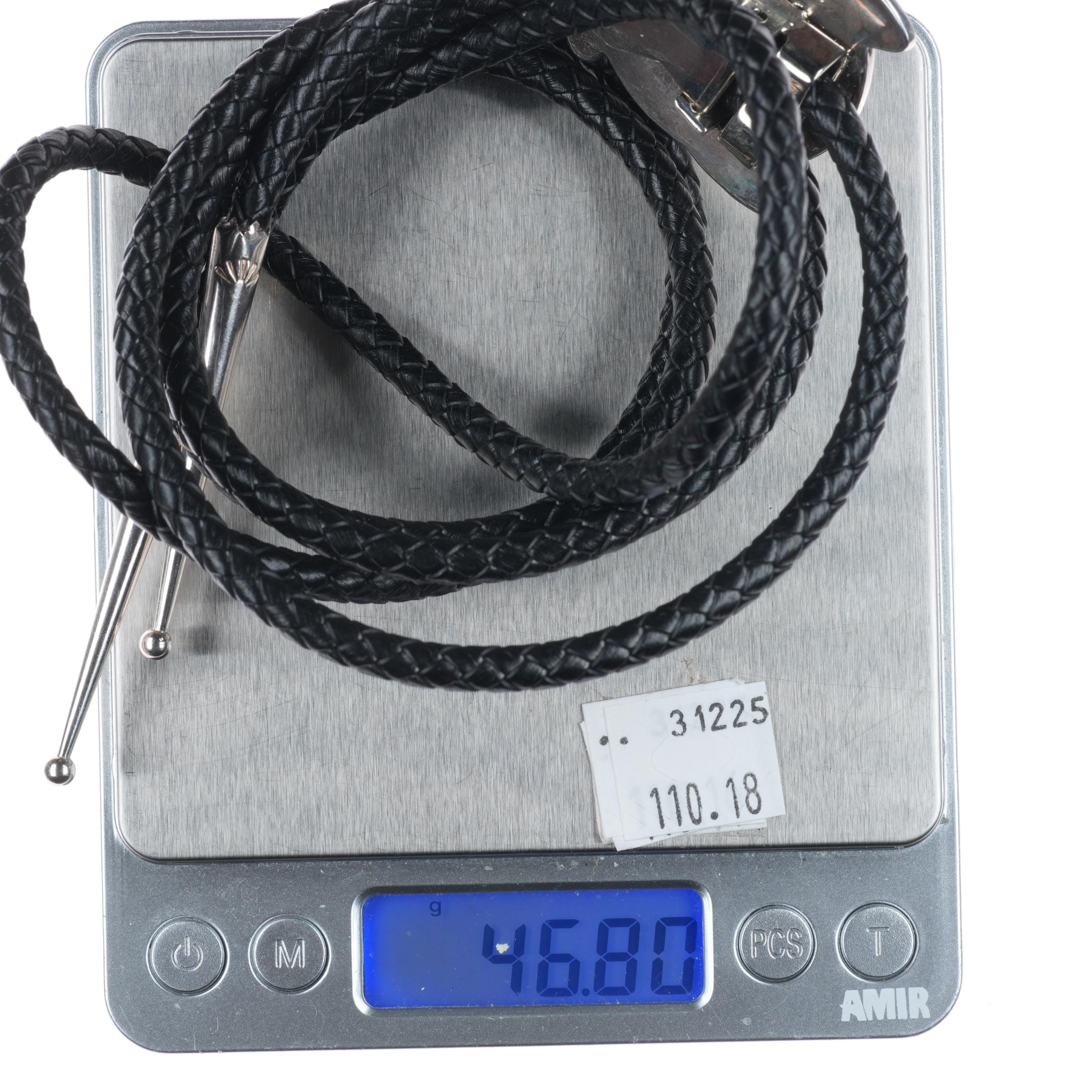 H.M. Coonsis Zuni sterling silver turquoise/coral inlay knifewing bolo tie. Tested and guaranteed solid sterling silver slide and tips. Weight and measurements in pictures. 52" long. Circa last quarter of the 20th century.