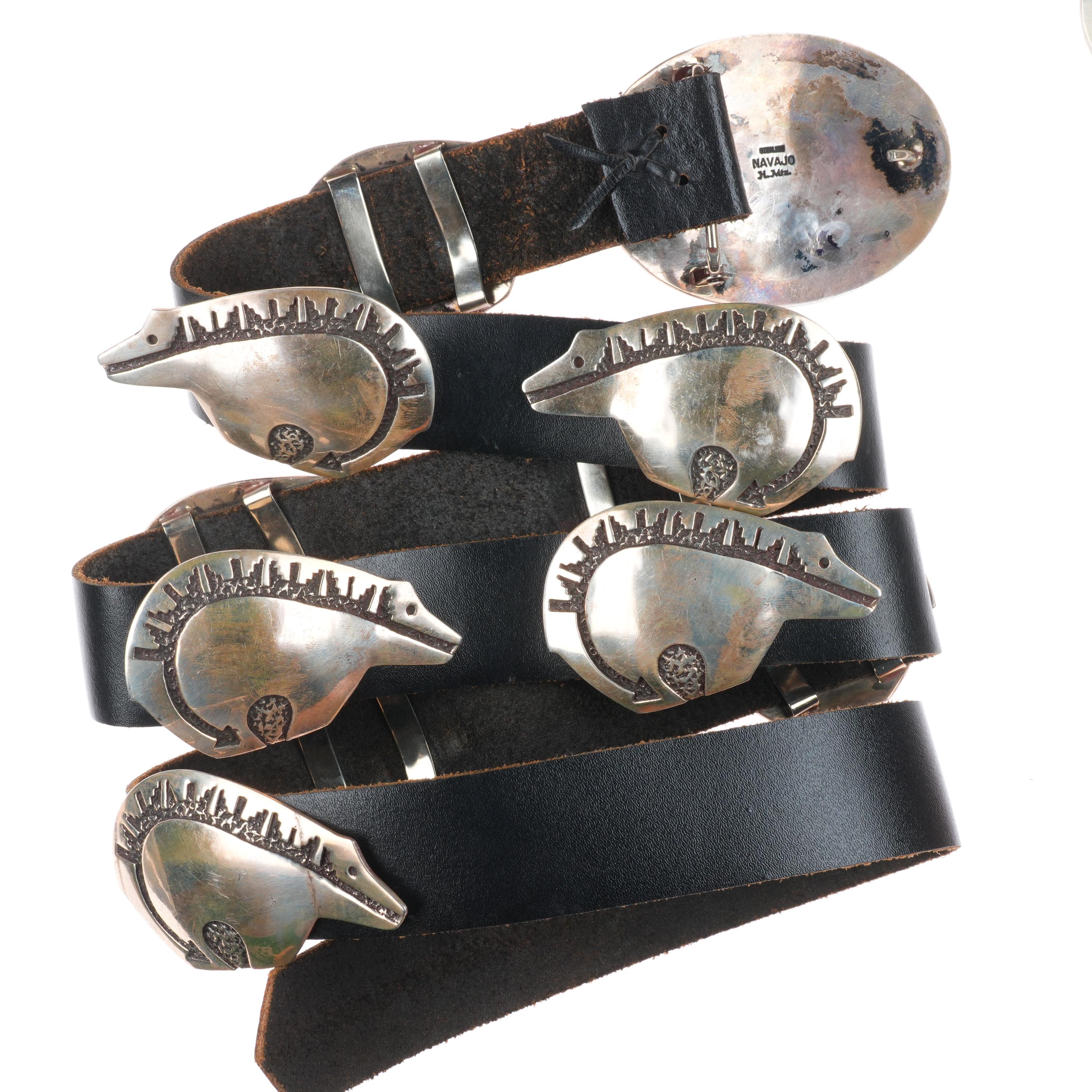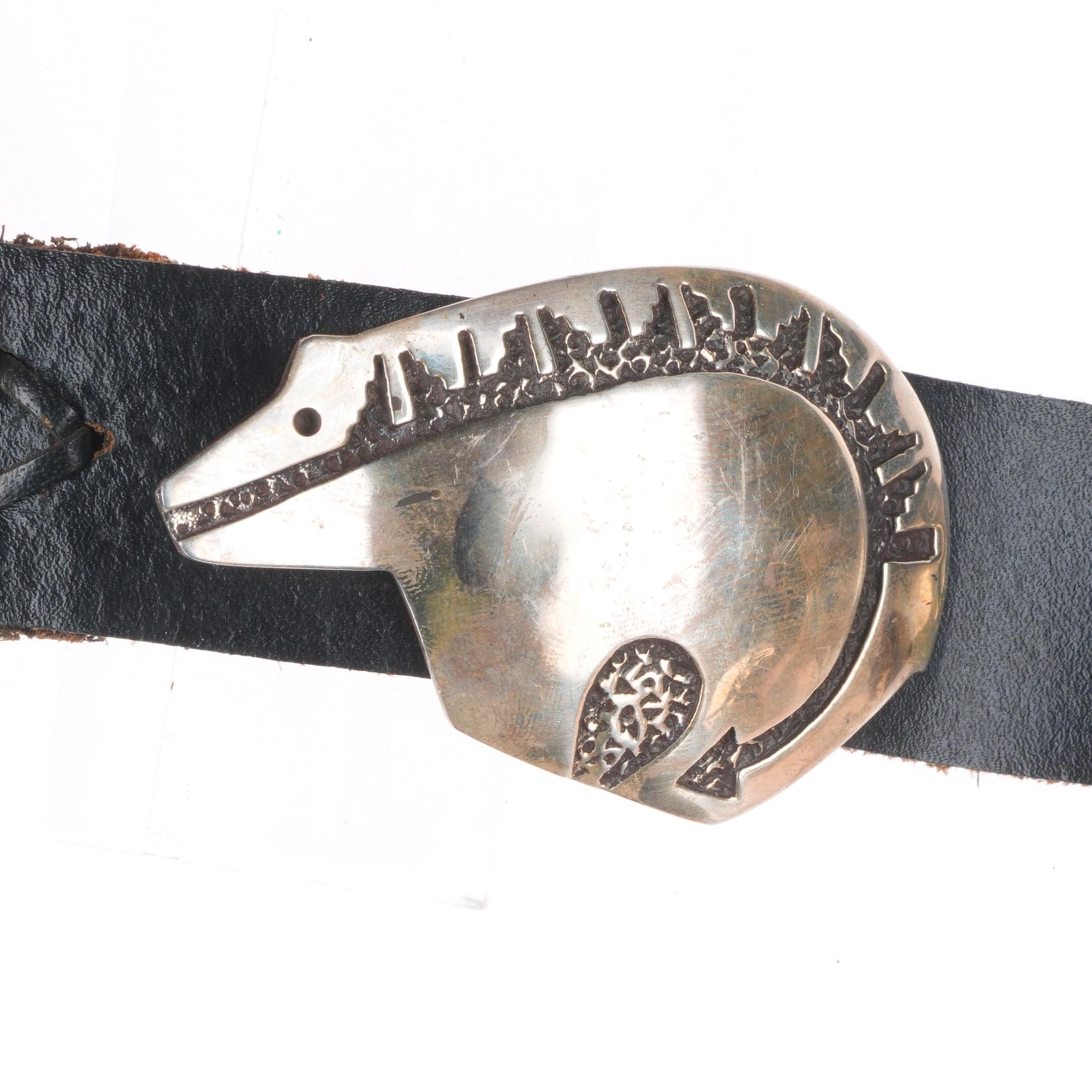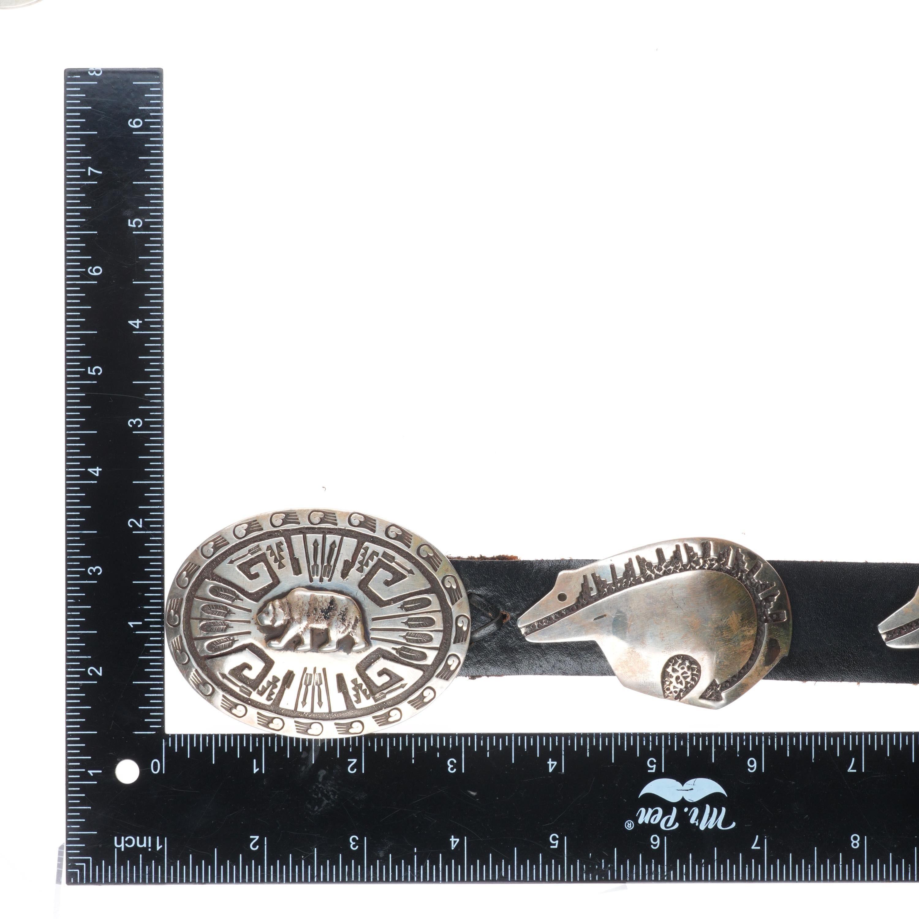 Harry Martinez Navajo sterling silver bear form concho belt. Tested and guaranteed solid sterling silver with weight and measurements in pictures. Fully functional. Fits up to a 49" waist but can be hooked shorter, great condition, circa last quarter of the 20th century. I do not believe there are any holes, so unworn. I can put holes where you like upon request. 10 conchos and 1 buckle