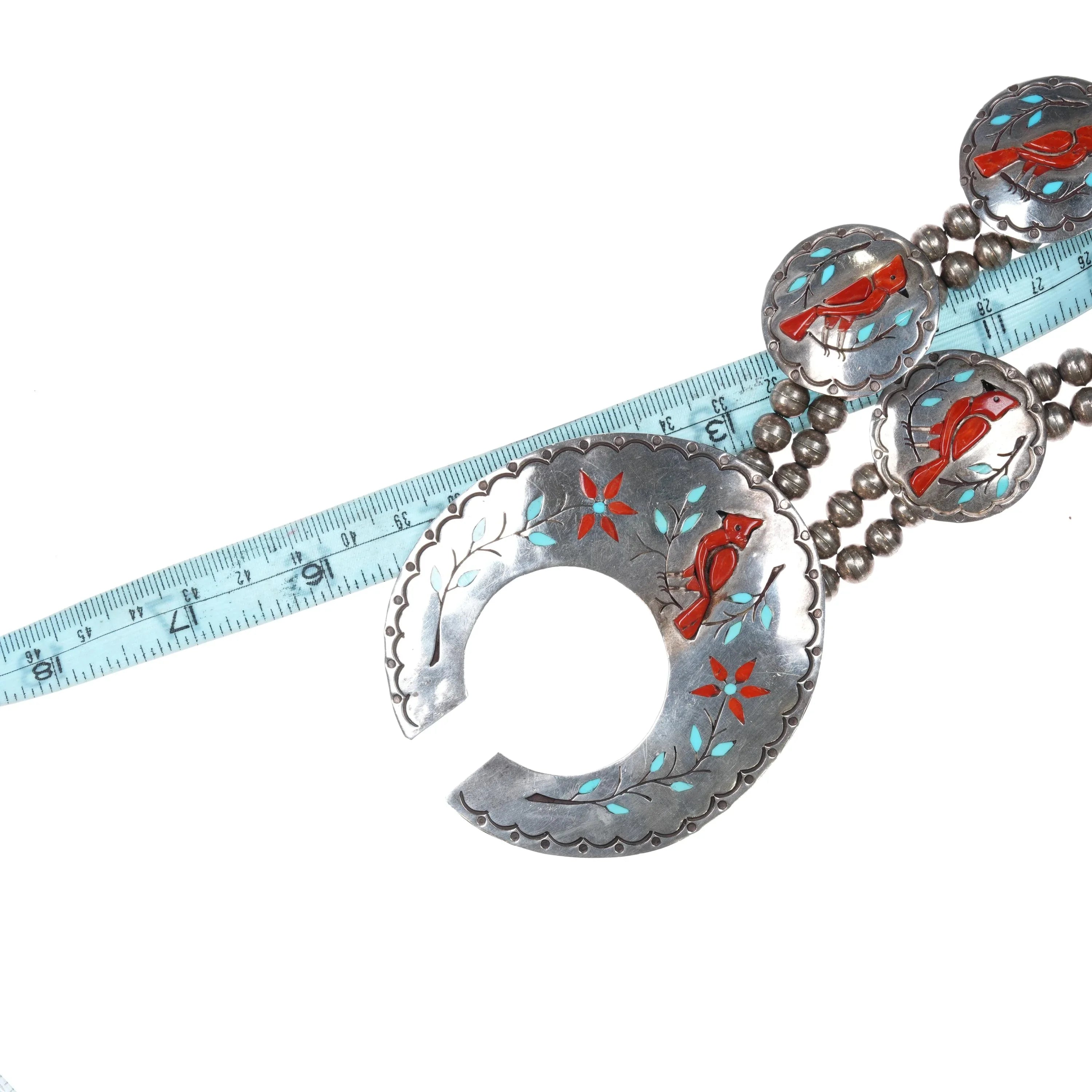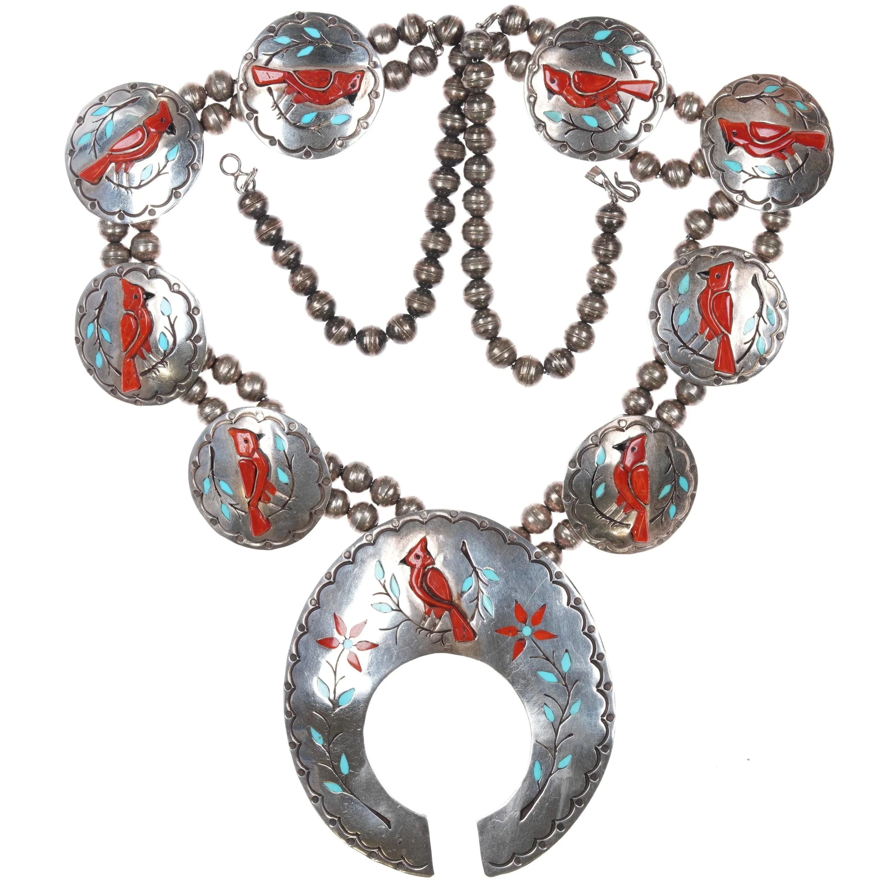 Harry Spencer Navajo sterling silver cardinal squash blossom necklace Redbirds
