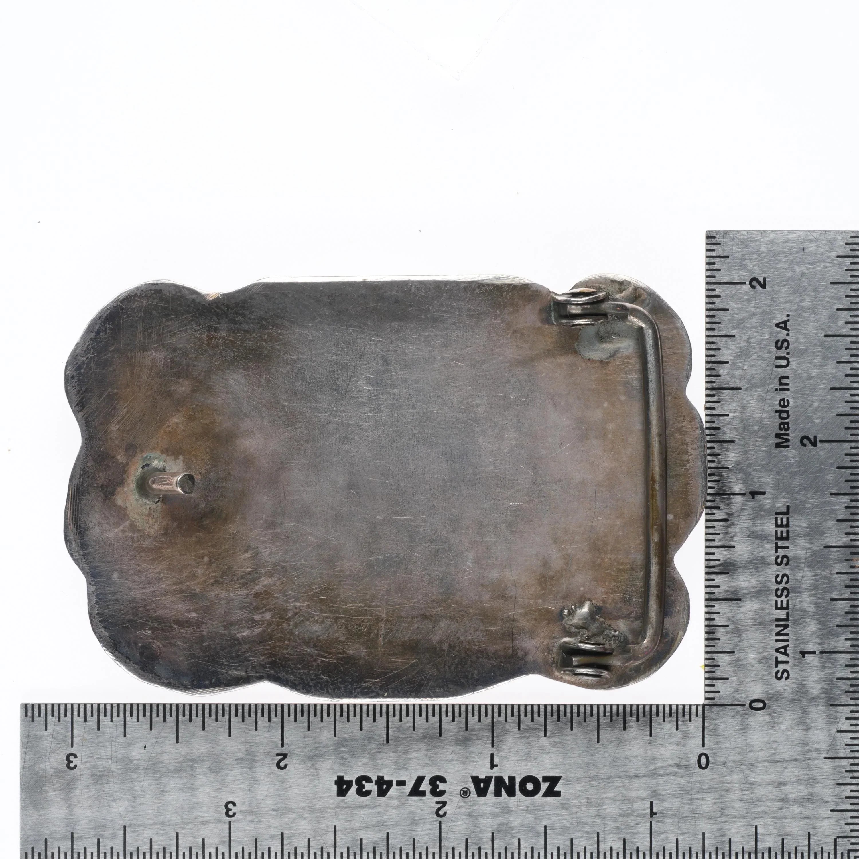 Heavy Vintage Navajo Kingman turquoise sterling belt buckle silver dollar. Fits up to a 1.5" belt. Tested and guaranteed solid sterling silver with weight and measurements in pictures. Fully functional, stones are secure. All items will likely have some expected wear, the older they are the more wear they should have. Circa third quarter of the 20th century. Unmarked, which is common with Native American jewelry of this era.