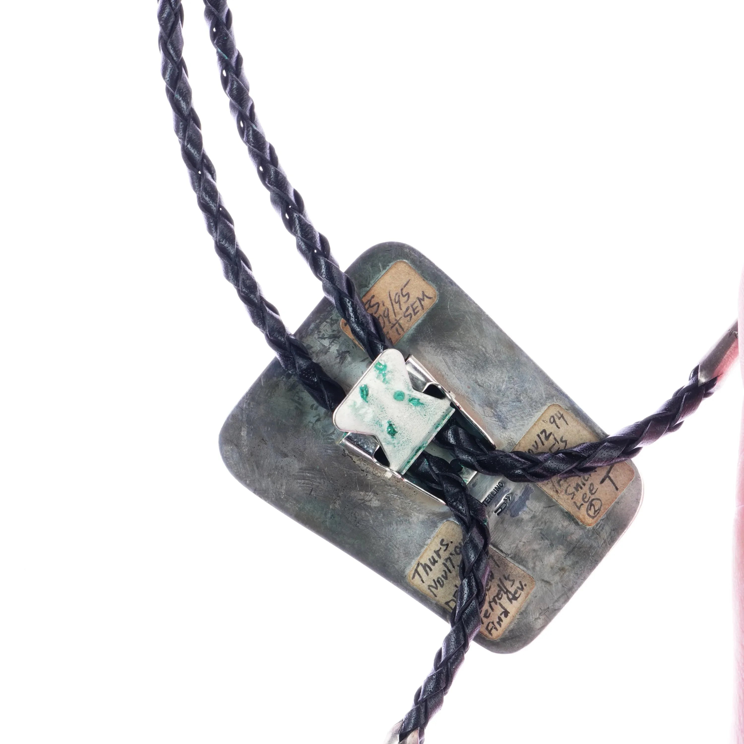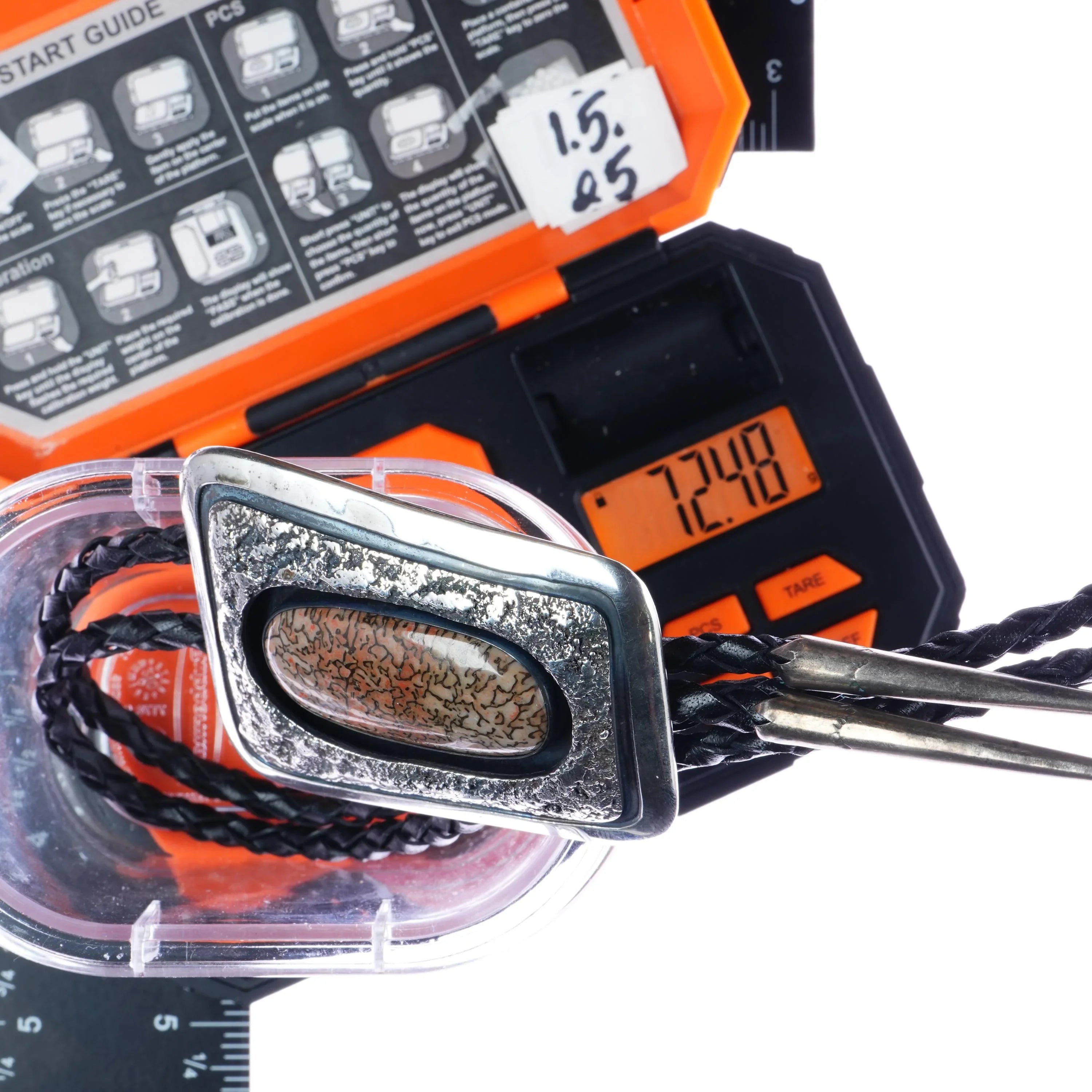 Herman Hoskie Navajo Sterling petrified Palmwood bolo tie. Solid sterling, weight and measurements in pics (scale tared out with containter, weight shown is just the bolo). No damage, sterling tips and bolo slide. Hallmarked as shown. Exremely high quality. From huge collection so well preserved, 40" total length.