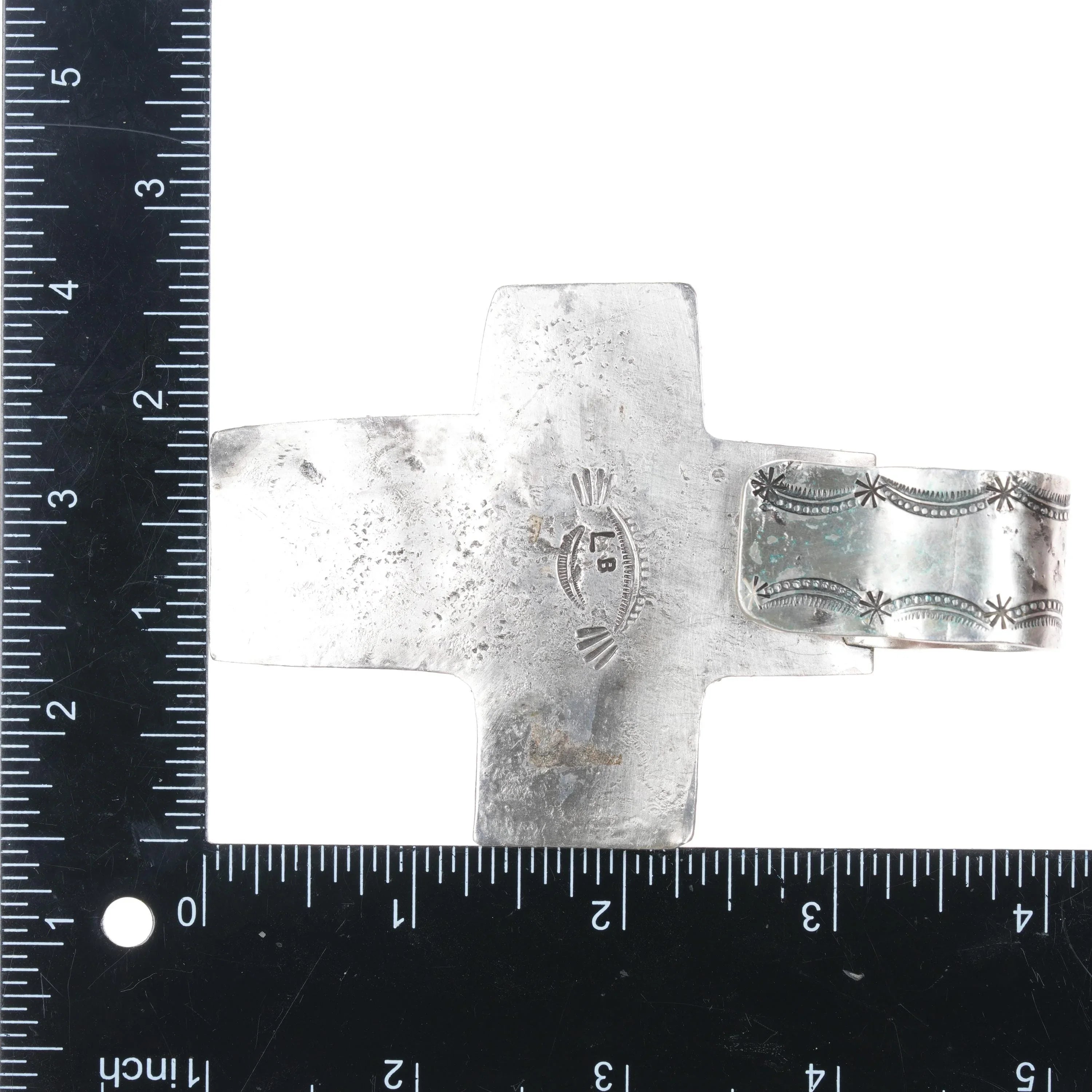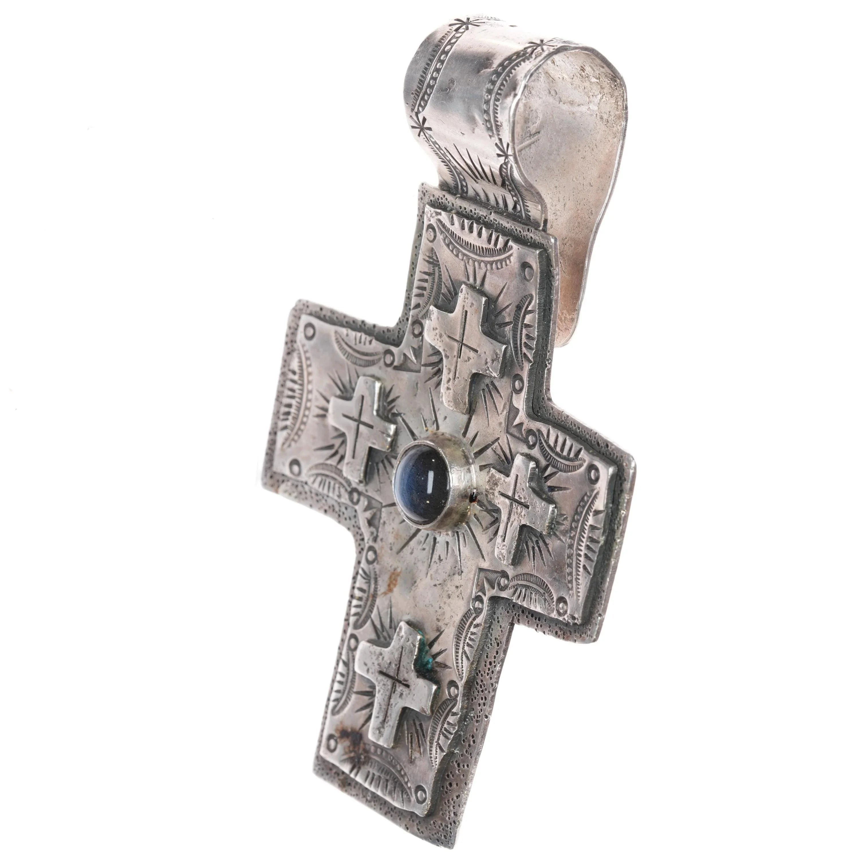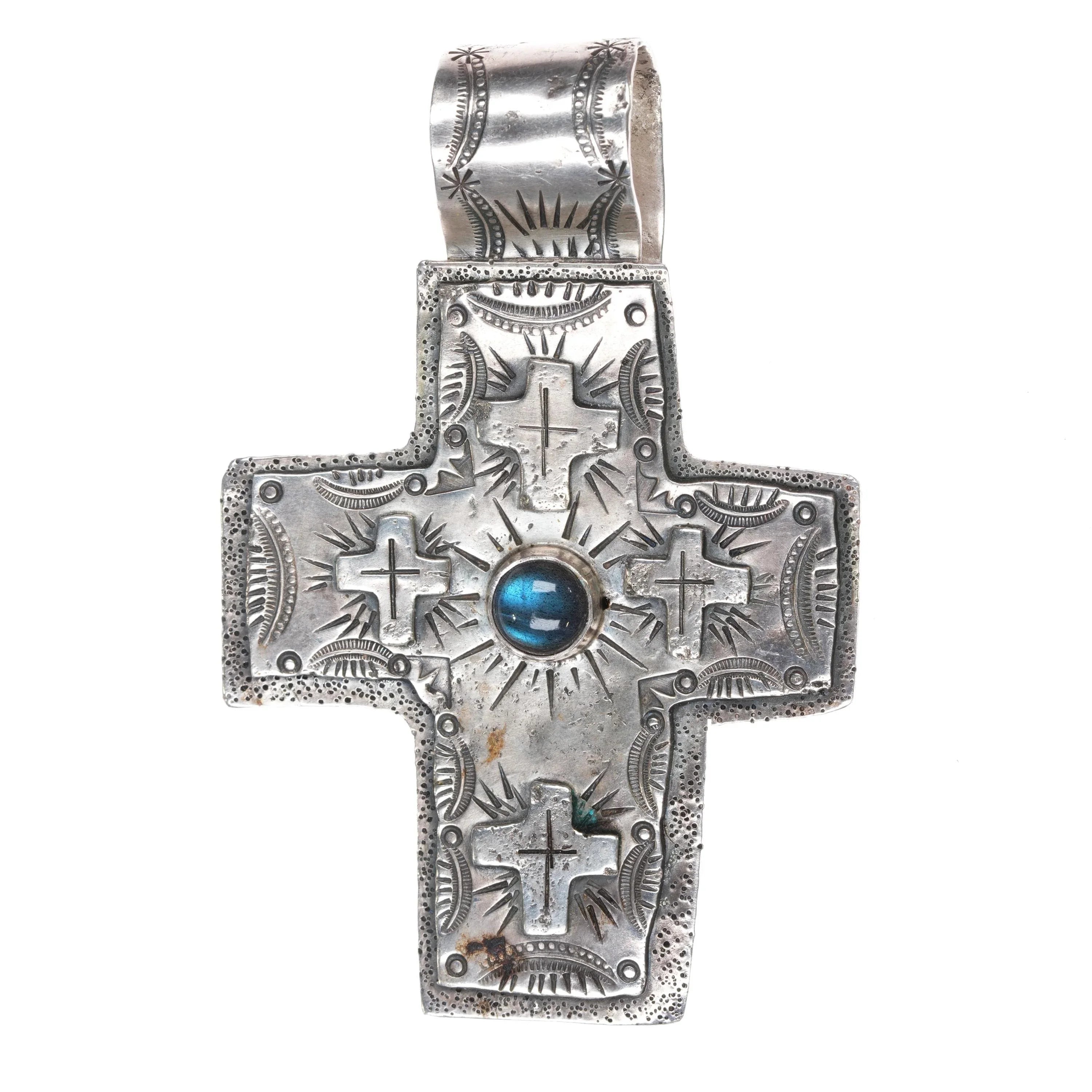 Huge 90‘s LB Southwestern hand stamped sterling silver labradorite cross pendant. Weight and measurements in pics, all solid sterling. NO issues. Very high quality piece from an extremely high quality collection put together in the 90‘s. I didn‘t have time to try to idenify much of it as there just is no time, but the pieces I did recognize were all from very high end mostly Santa Fe, New Mexico artists. It was all collected on trips to Santa Fe in the 90‘s.