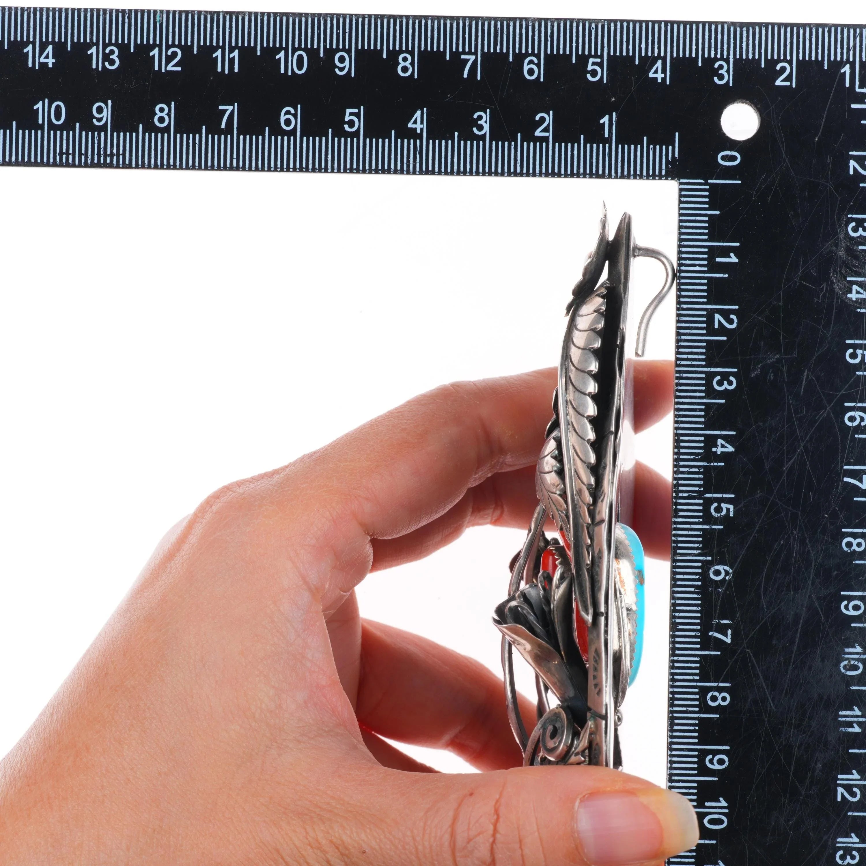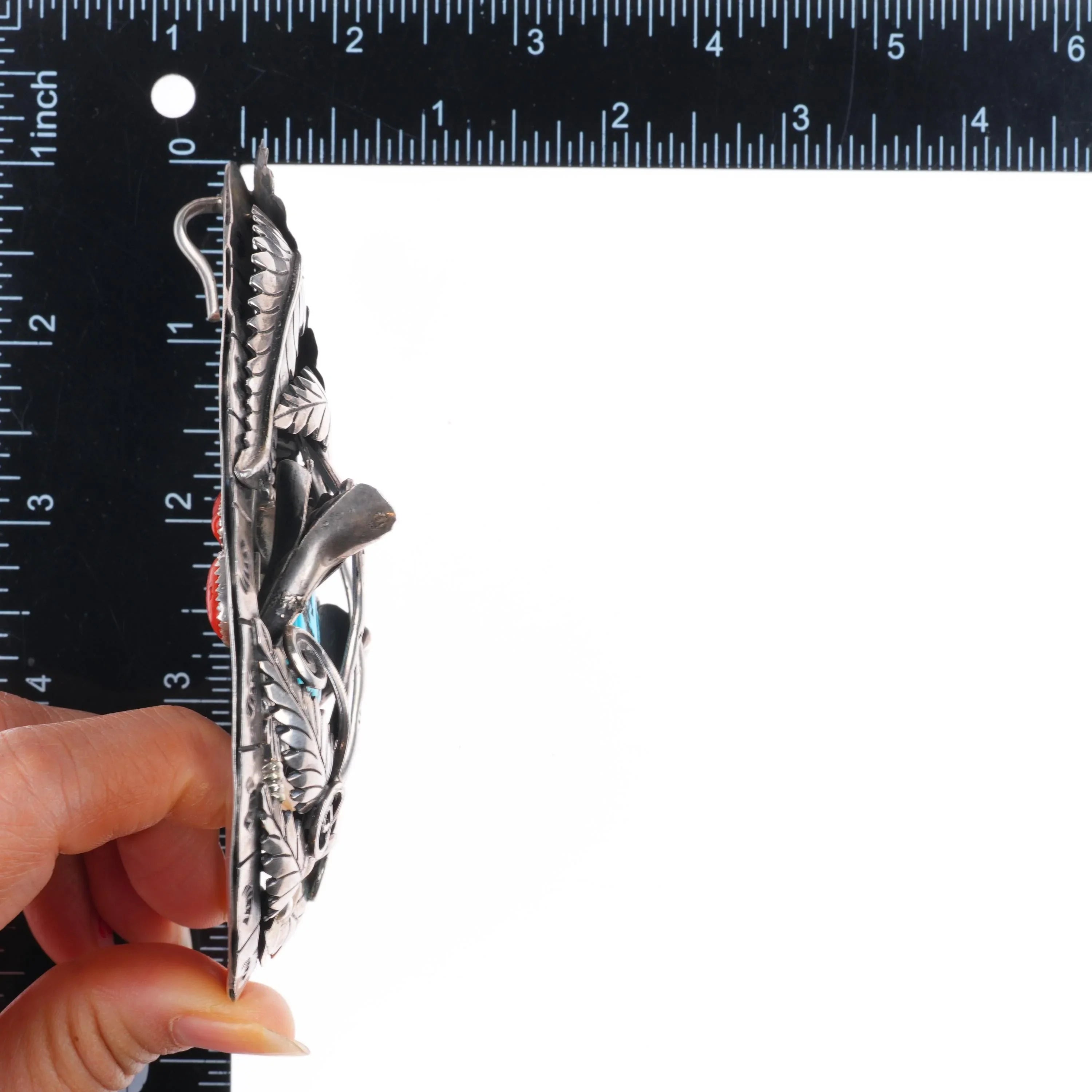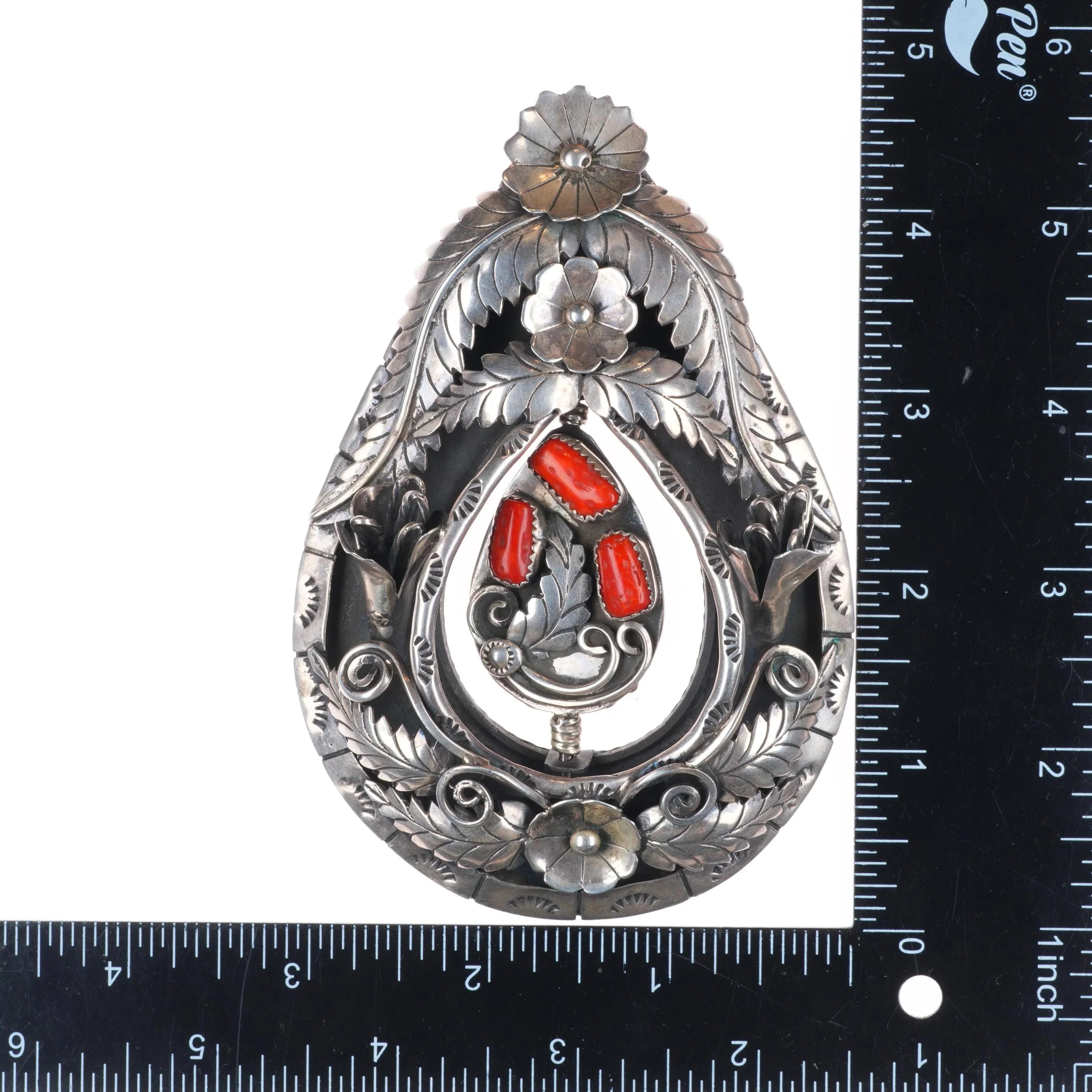 Huge 1970s Jerry Roan reversible spinner coral/turquoise sterling silver pendant. Solid sterling silver tested and guaranteed with weight and measurements in the pictures. No issues, circa third quarter of the 20th century. 60‘s to early 70‘s.