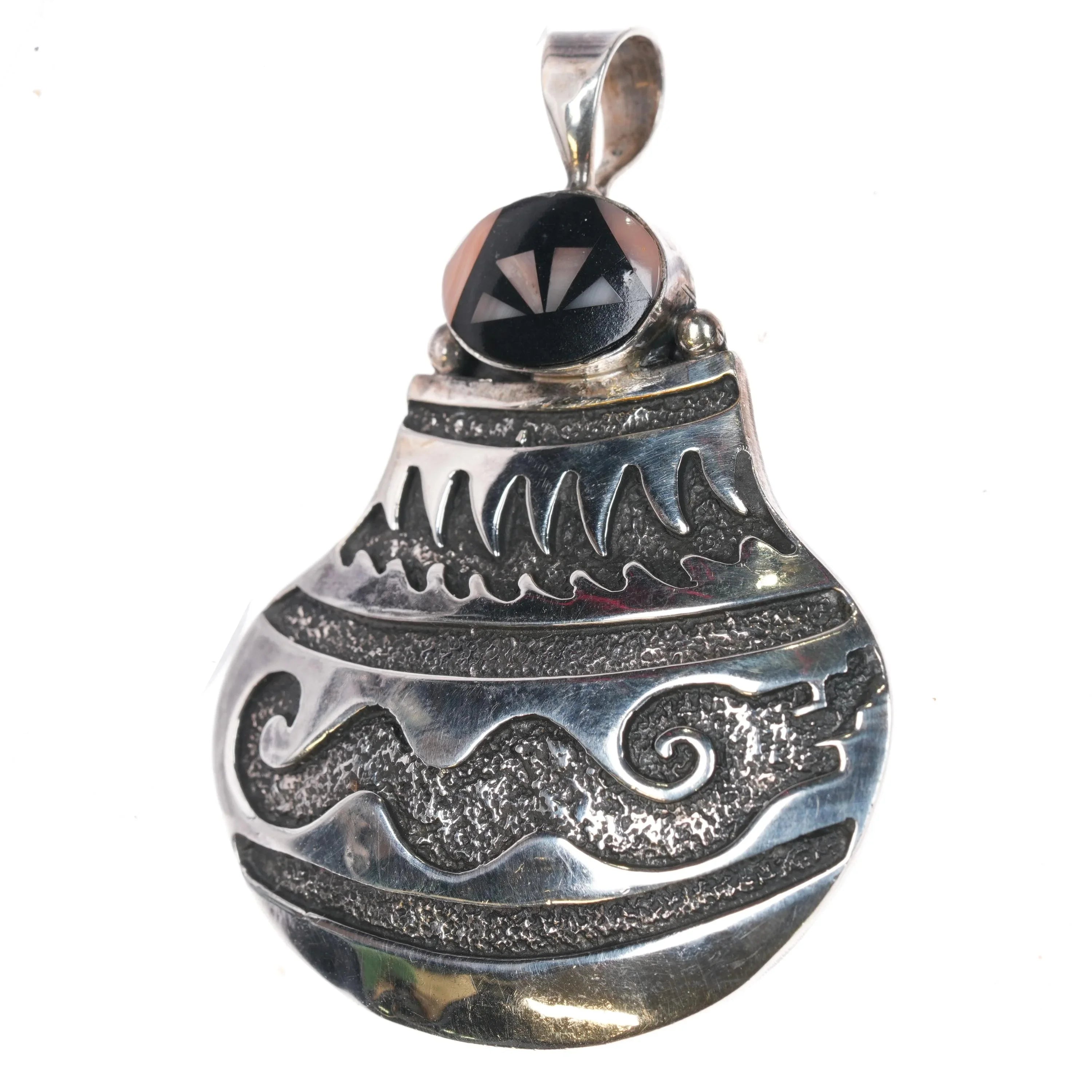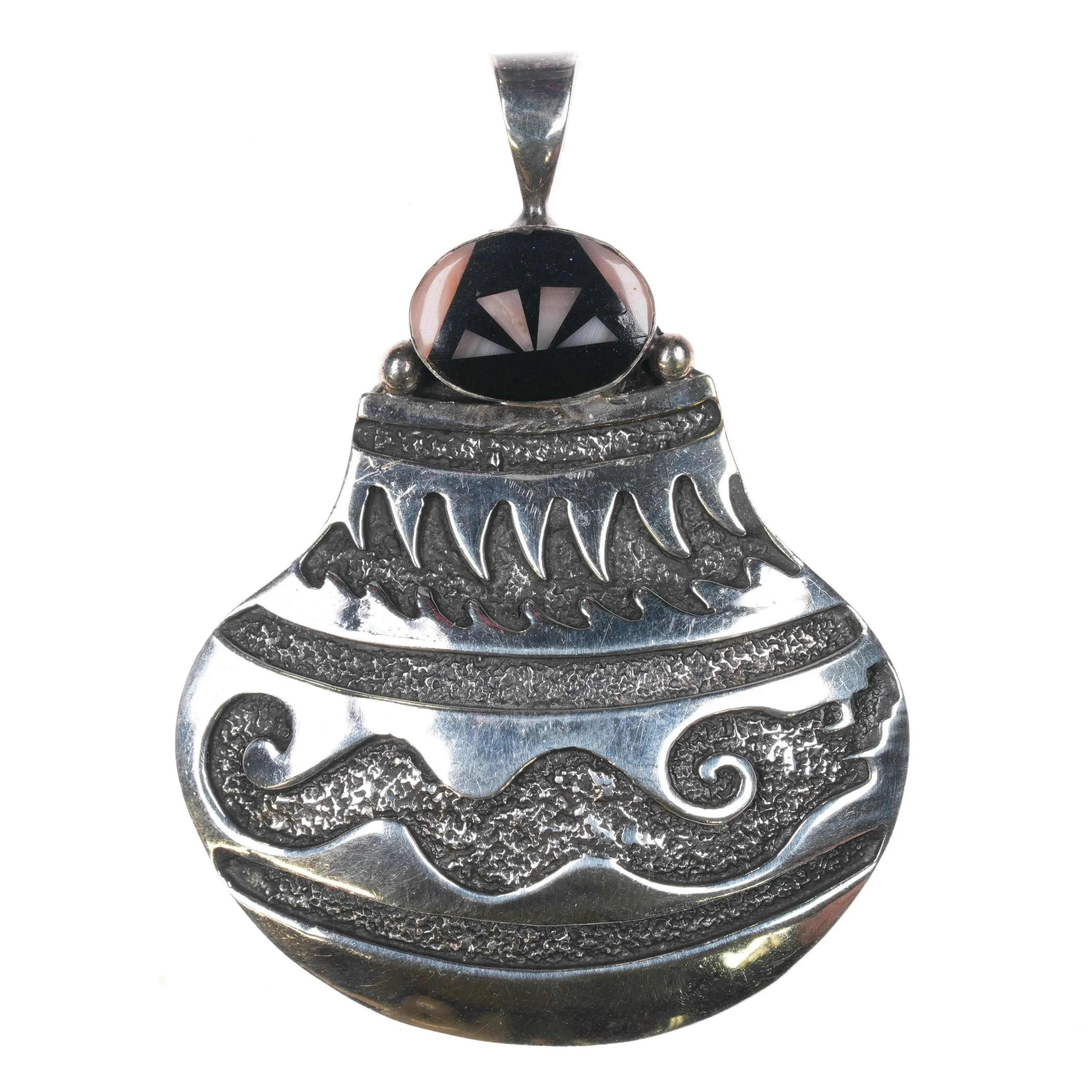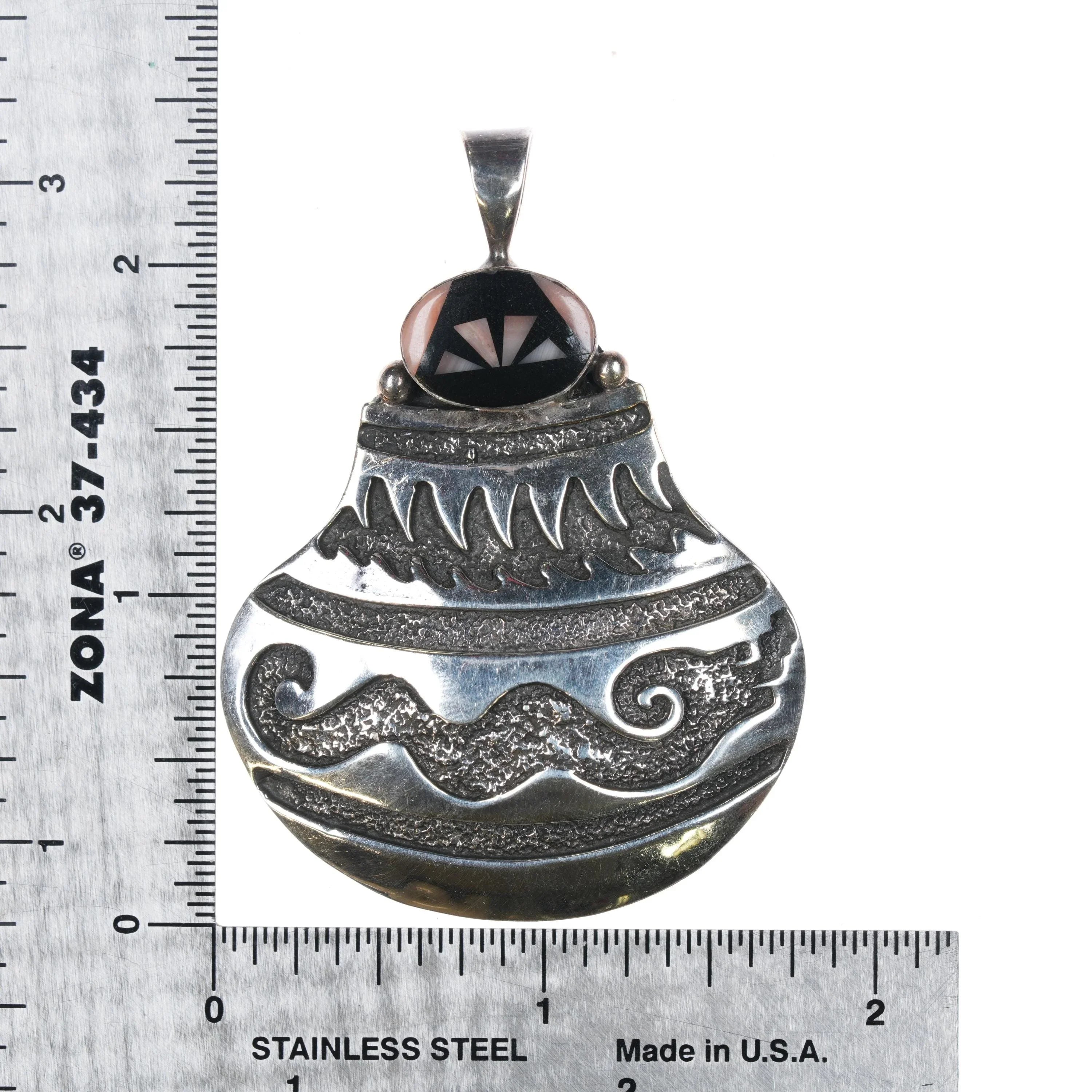 Irv Monte Navajo Sterling silver olla pendant w/jet/coral intarsia inlay