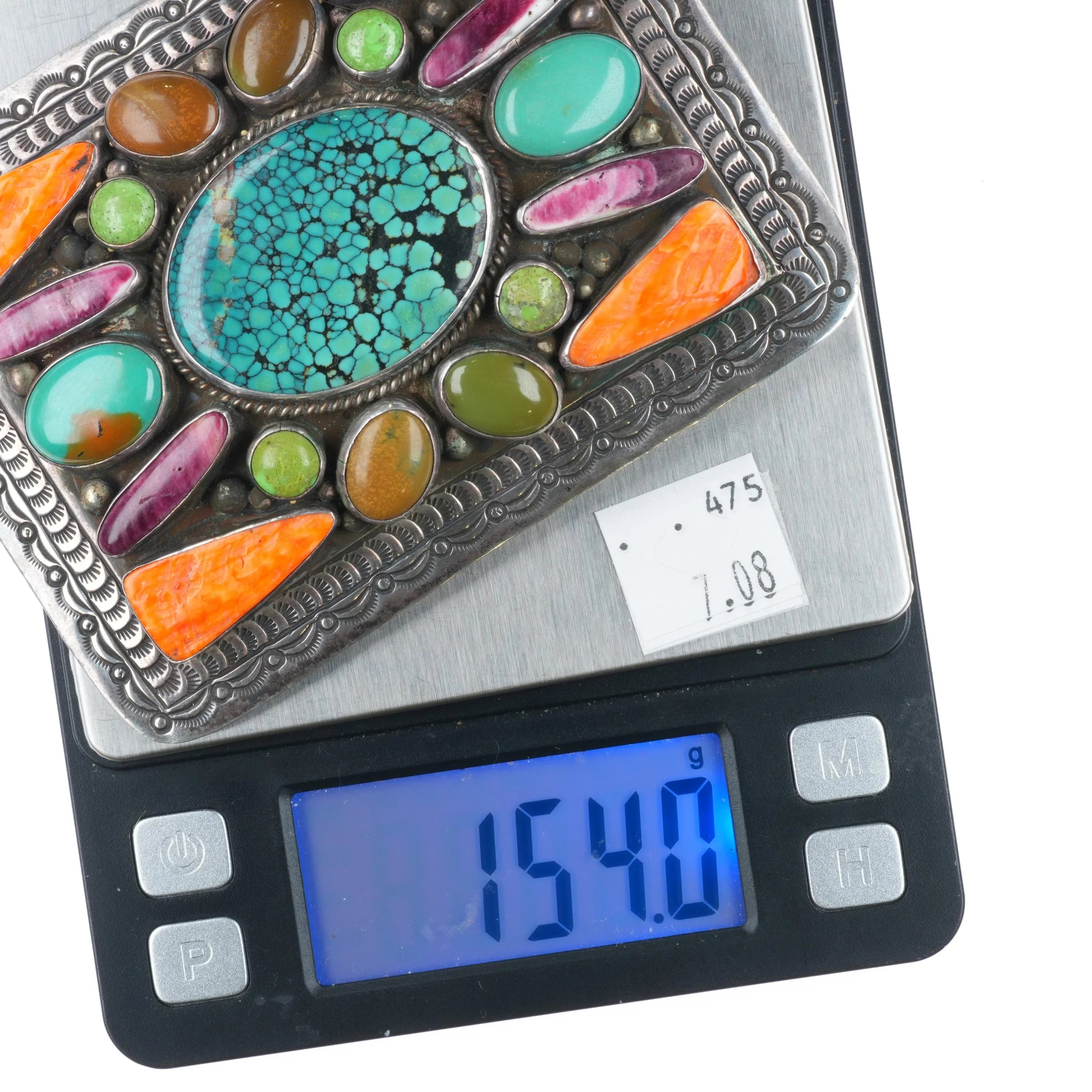 Large Roy Buck Navajo sterling silver multi-stone turquoise/shell belt buckle. Fits up to a 1.5" belt. Tested and guaranteed solid sterling silver with weight and measurements in pictures. Fully functional, stones are secure. All items will likely have some expected wear, the older they are the more wear they should have. Circa third quarter of the 20th century.