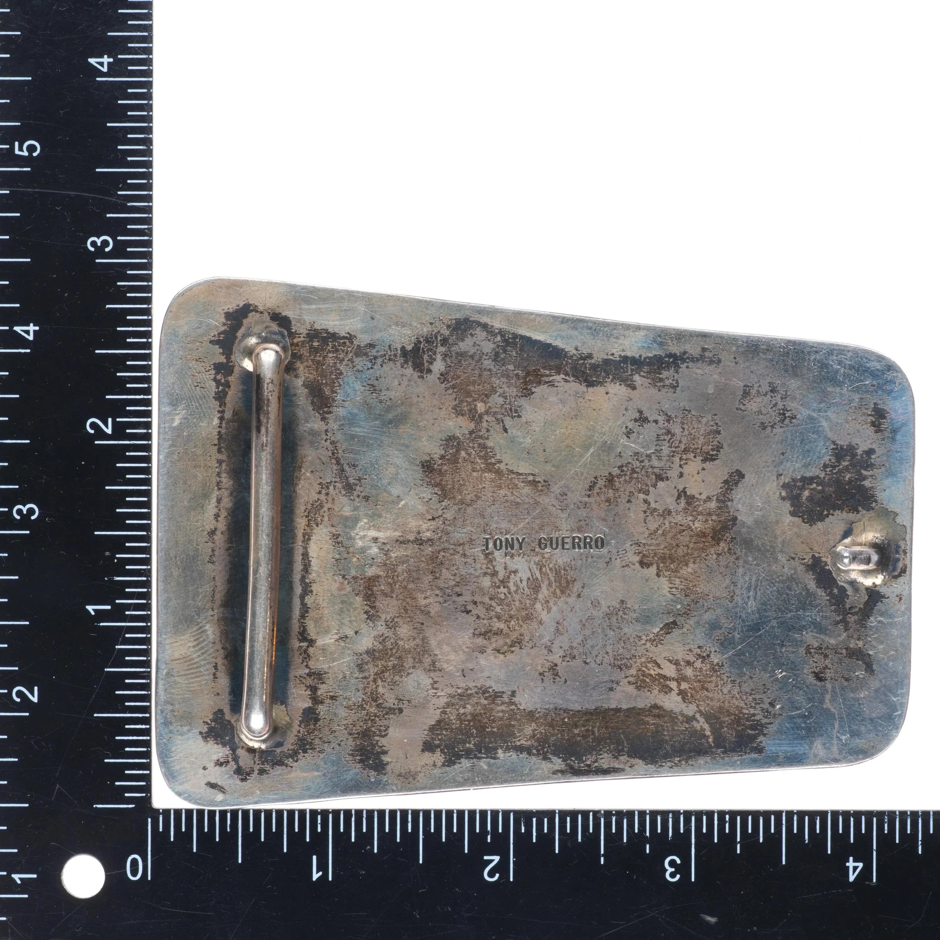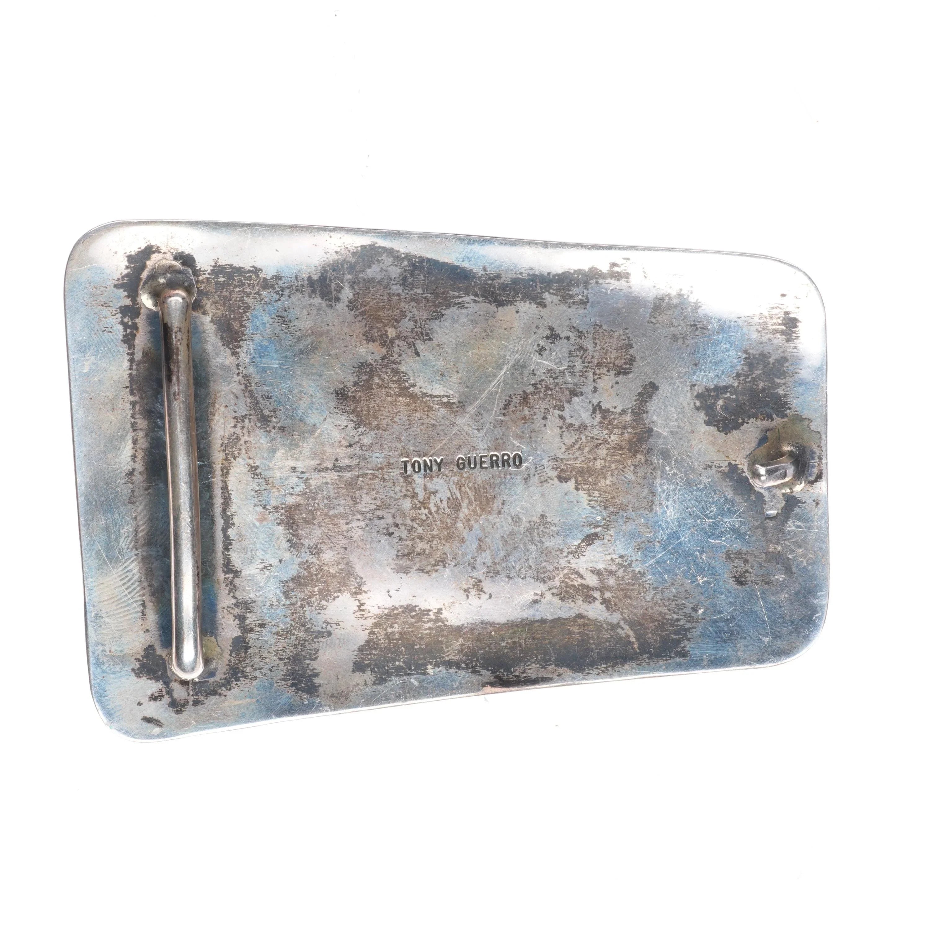 Large Tony Guerro Navajo sterling silver One dollar coin belt buckle. Fits up to a 2" belt, fully functional with age appropriate wear. Please look at pictures. Tested and guaranteed solid sterling silver. I believe the coin is gold plated silver. It appears to be encased in plastic to preserve the coin.