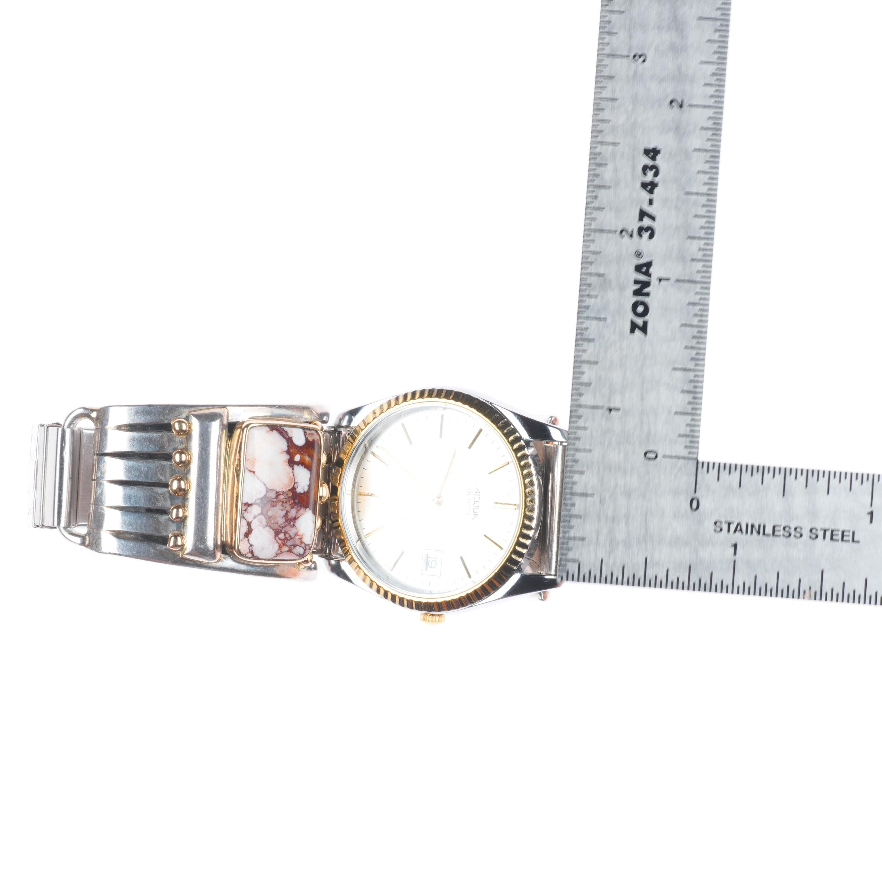 Orville Tsinnie Navajo sterling silver 14k gold Wild Horse watch tips. Selling the watch tips shown with weight and measurement in pictures. Fits a 6.6" wrist without the band stretching, watch untested...guaranteed to at least need a battery. Selling the ultra-rare/desirable watch tips, the rest is free. Measurements in photos. Solid 14k gold accent beads at the top and bottom of the bezels, solid 14k gold bezels.