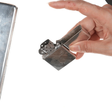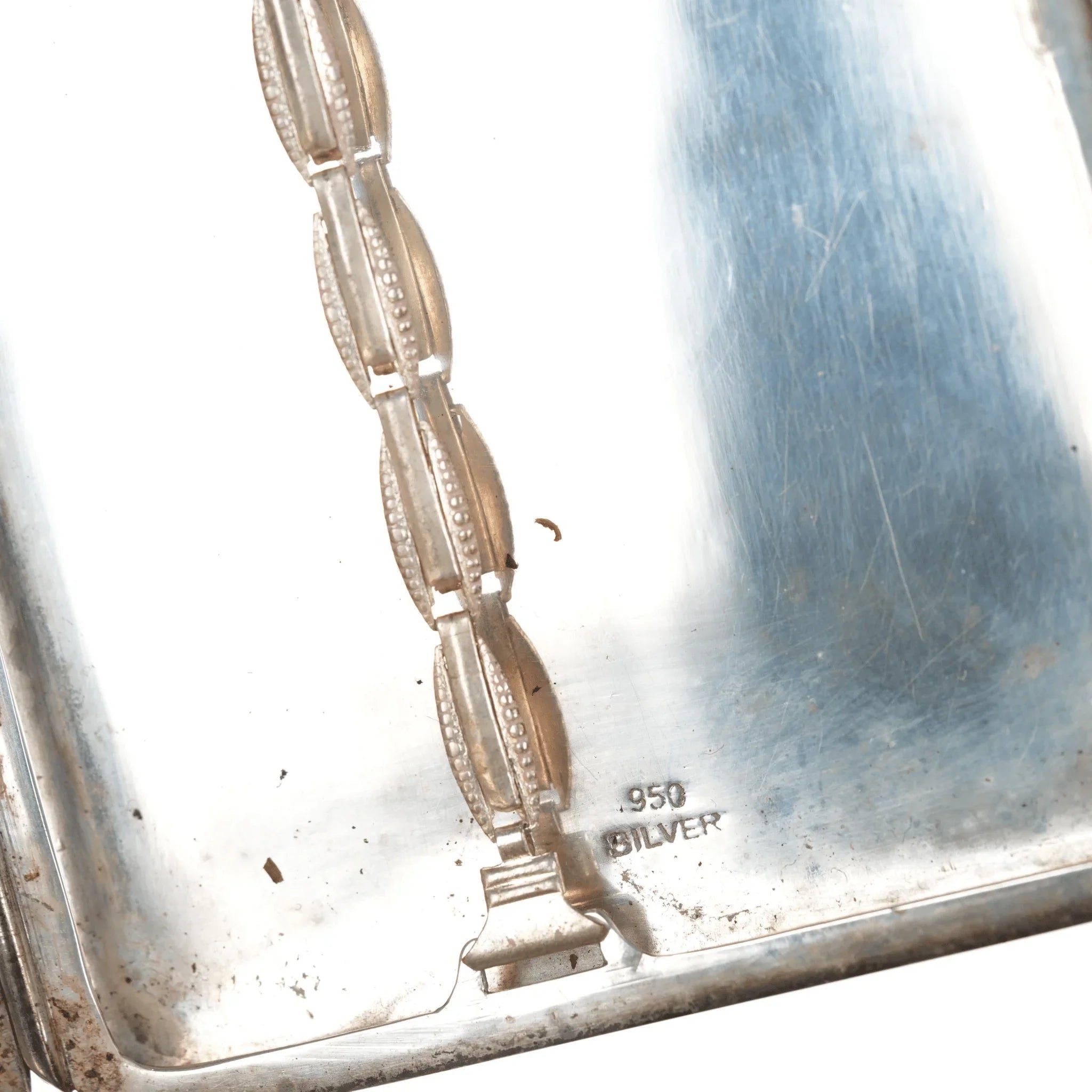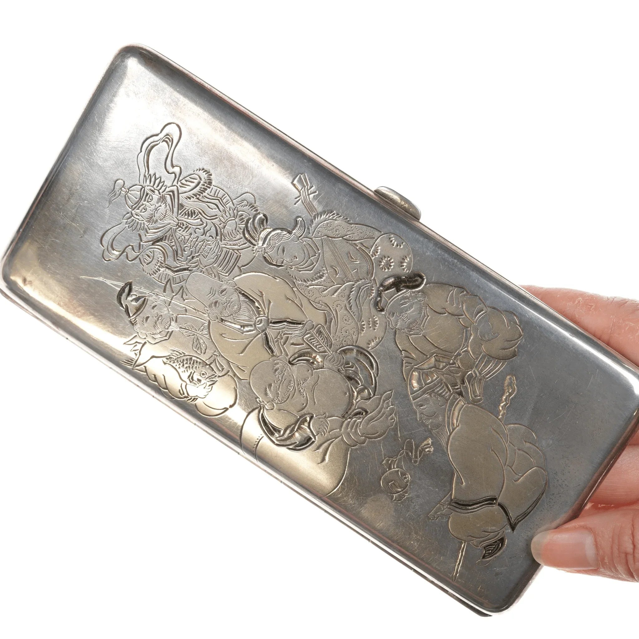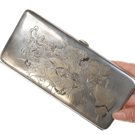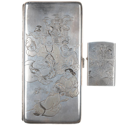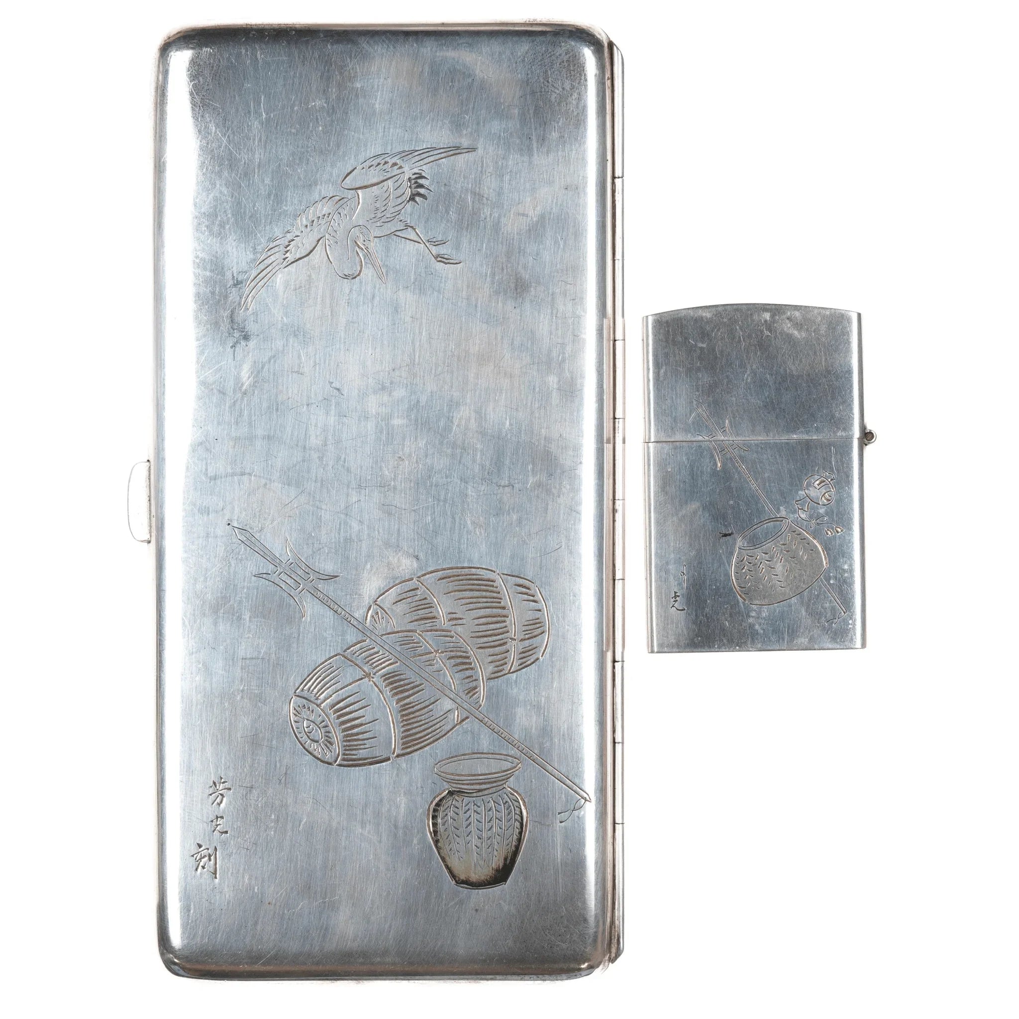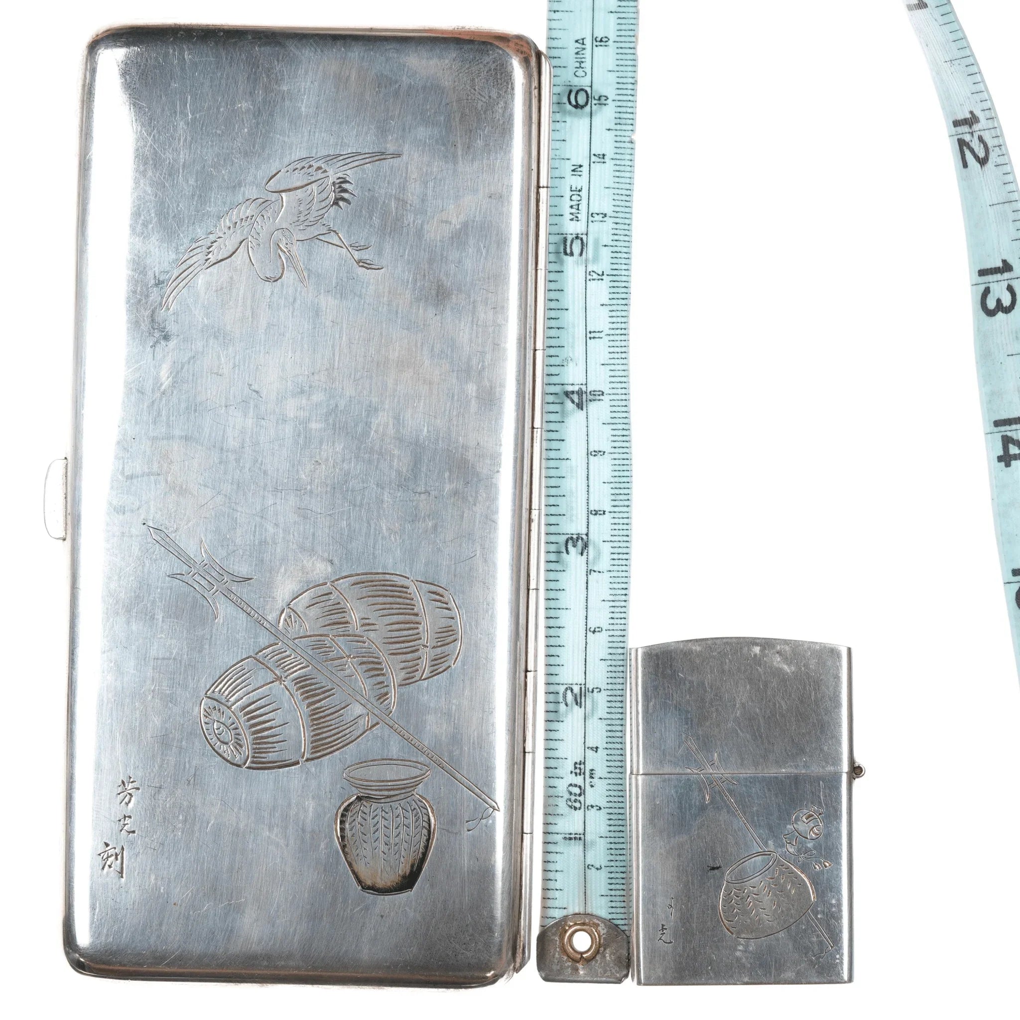 Signed Japanese 950 silver jumbo cigarette case and lighter. Amazing quality, all hand done, signed by the artist on the backs as shown. Lighter has nice snap and no wobble or play in top, strong spring. Lighter needs flint. Cigarette case with no significant dents or dings, snaps shut and stays shut.