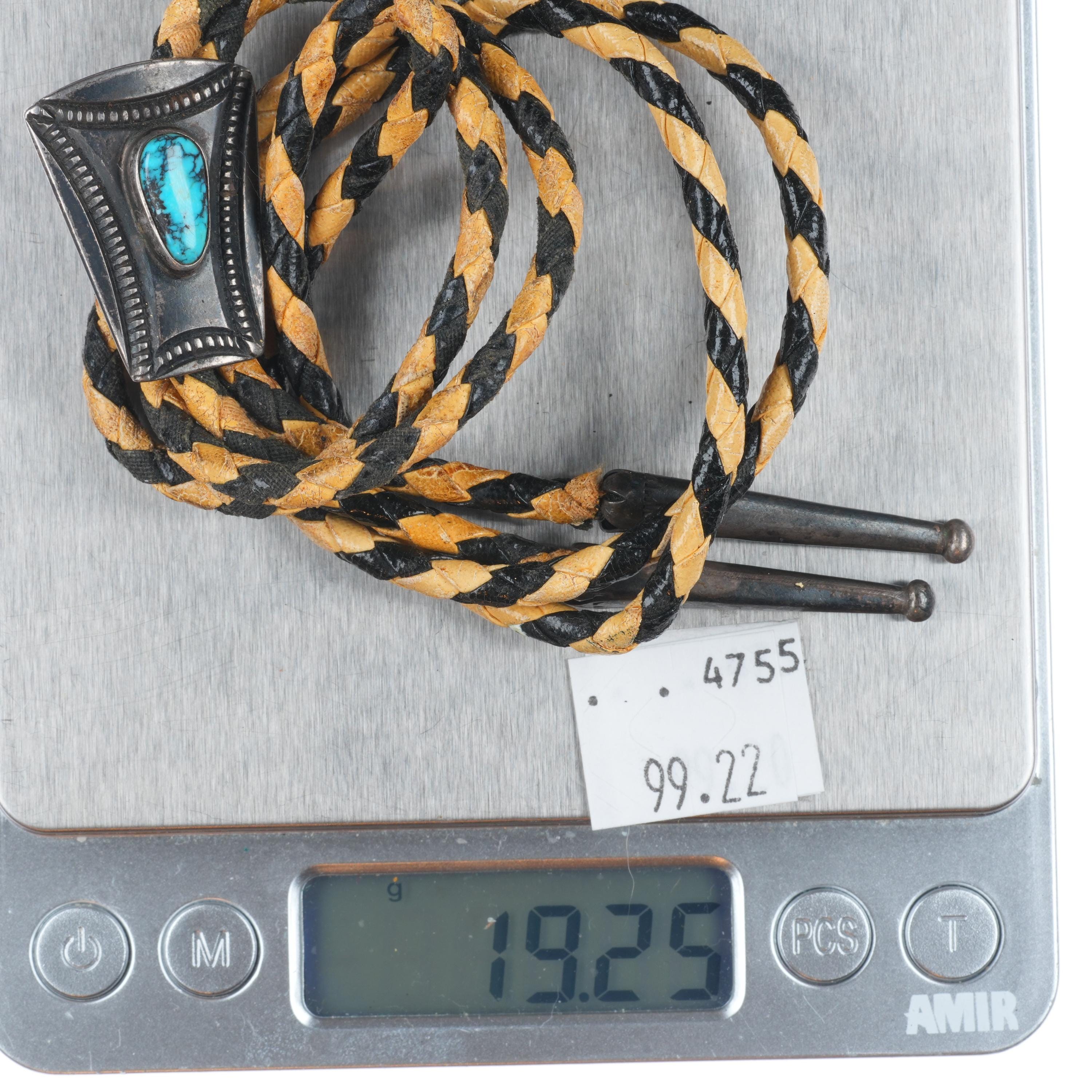 small 40‘s-50‘s Navajo vintage sterling silver bolo tie w/ nice turquoise. Tested and guaranteed solid sterling silver slide and tips. Weight and measurements in pictures. 38" long with no issues. Tray is tared out, so weight shown is just the bolo of course.