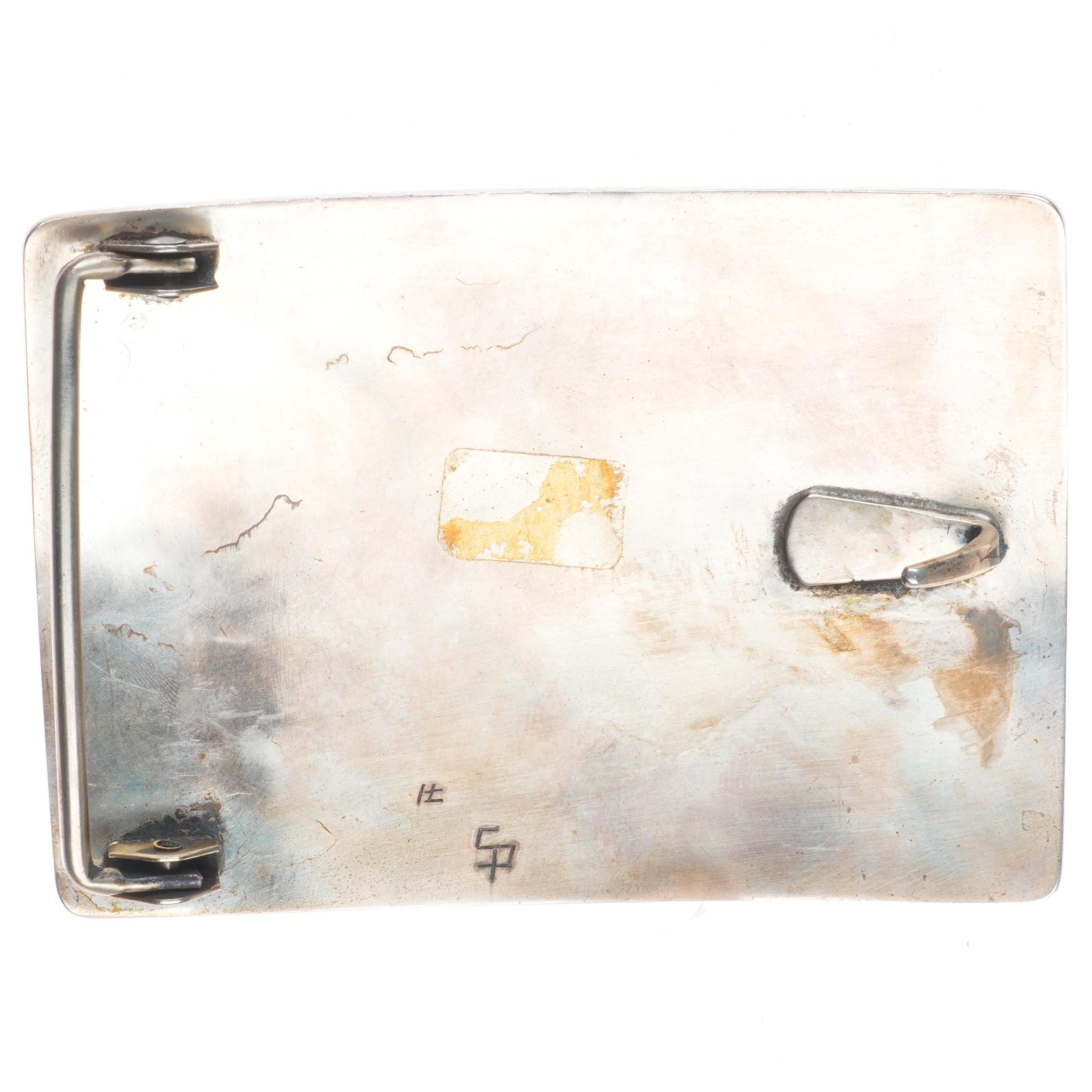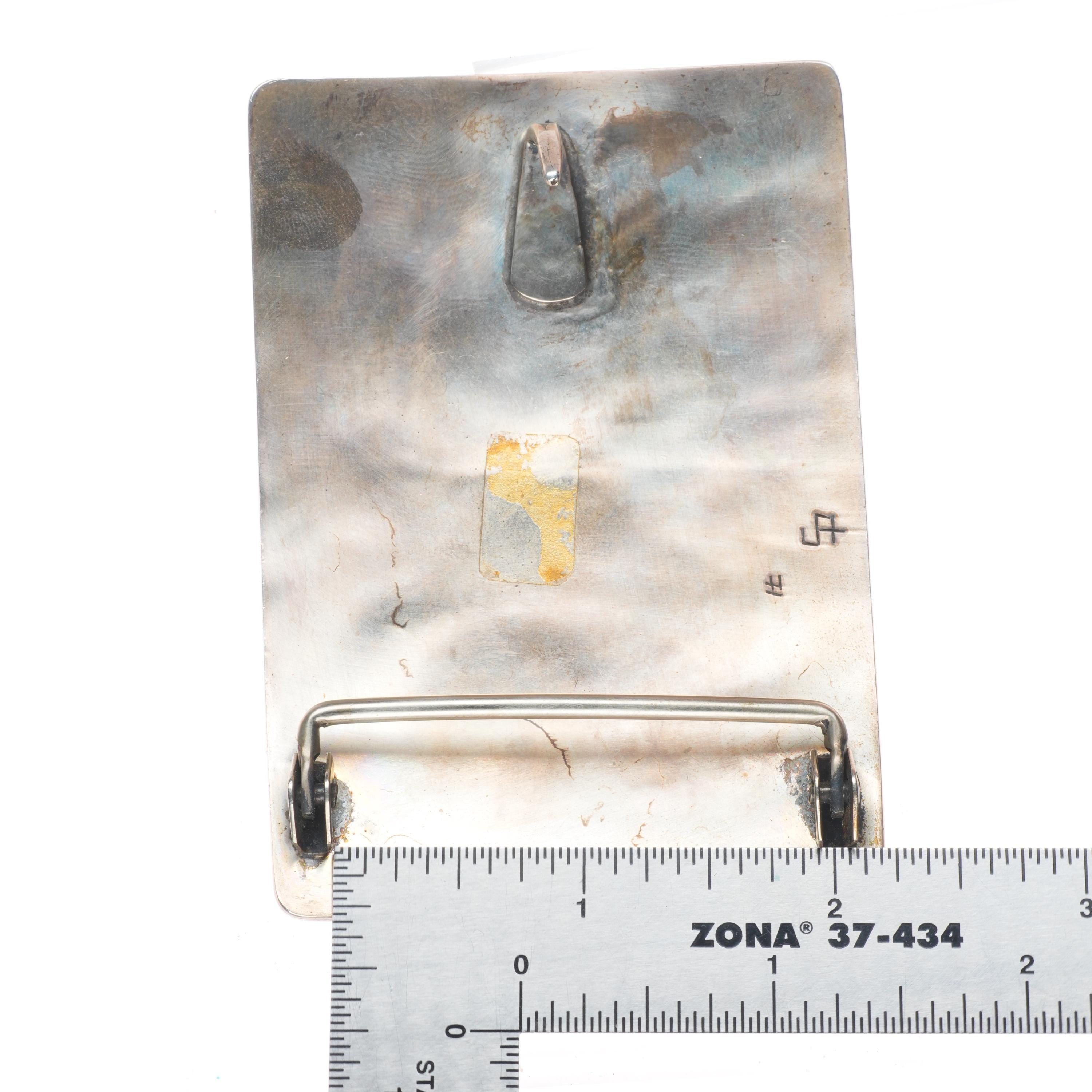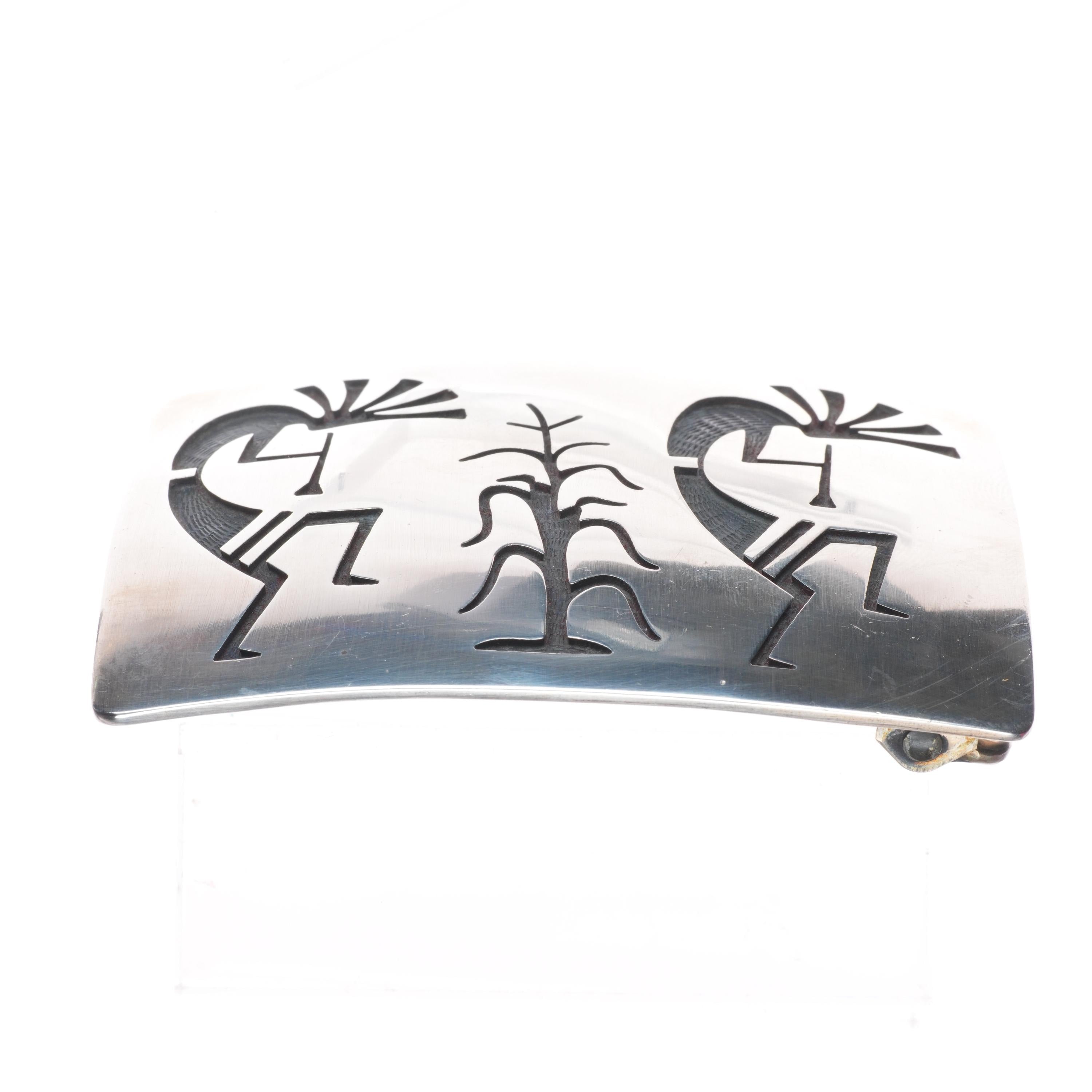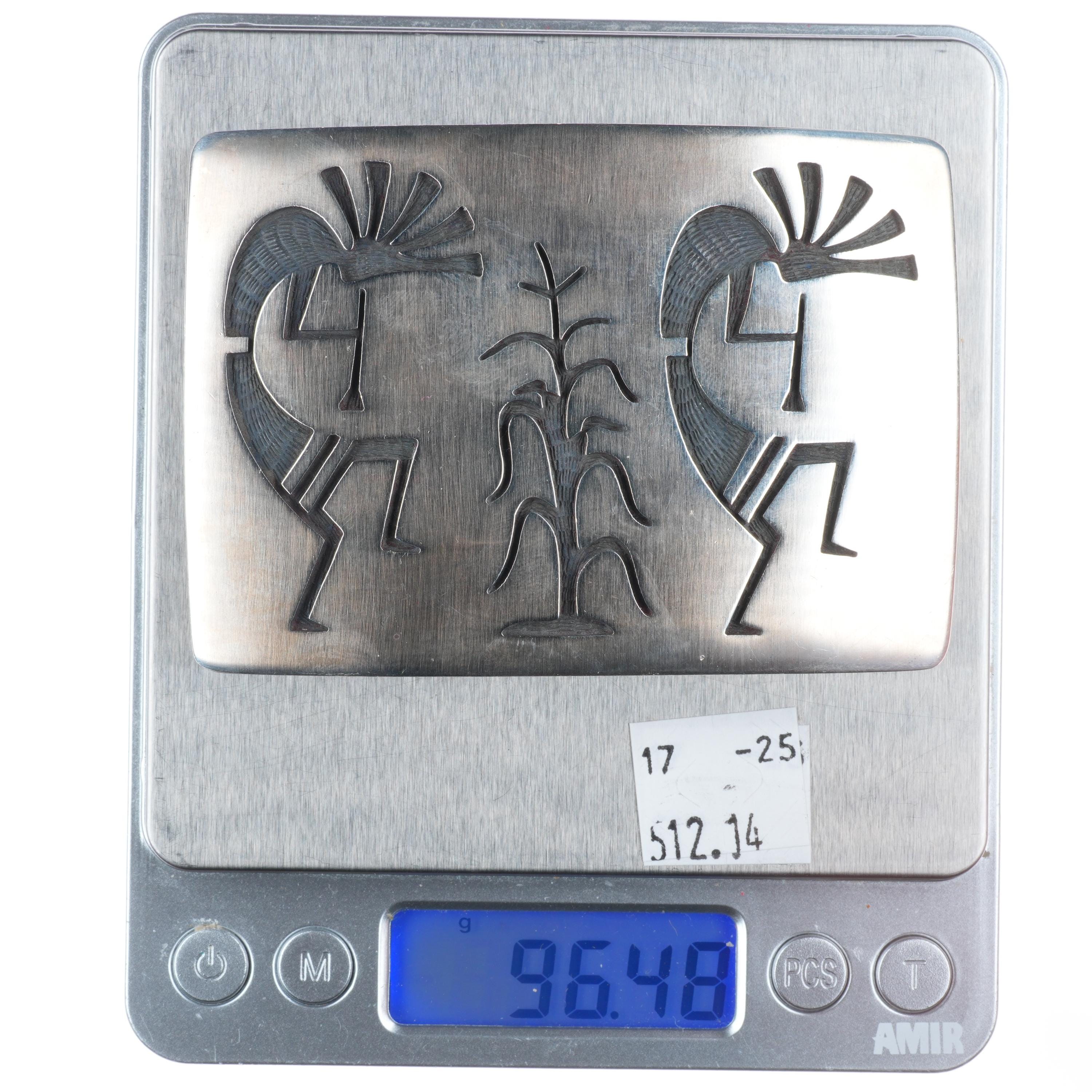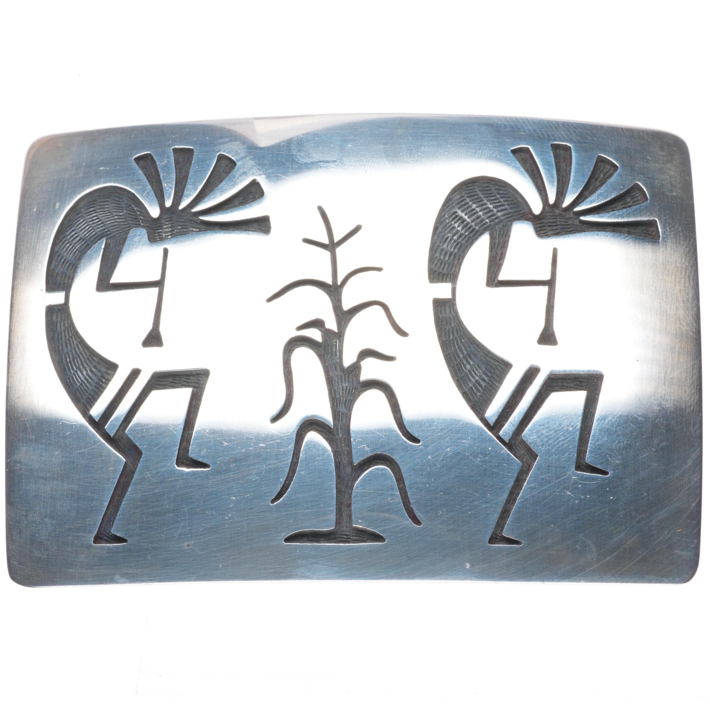 Steven Pooyouma Kuvaya Hopi overlay Kokopelli/corn sterling silver belt buckle. Tested and guaranteed solid sterling silver with weight and measurements in pictures. Fully functional. All items will likely have some age appropriate/expected wear, the older they are the more wear they should have. Circa last quarter of the 20th century.. 3.5" x 2.5", fits a 2" belt.
