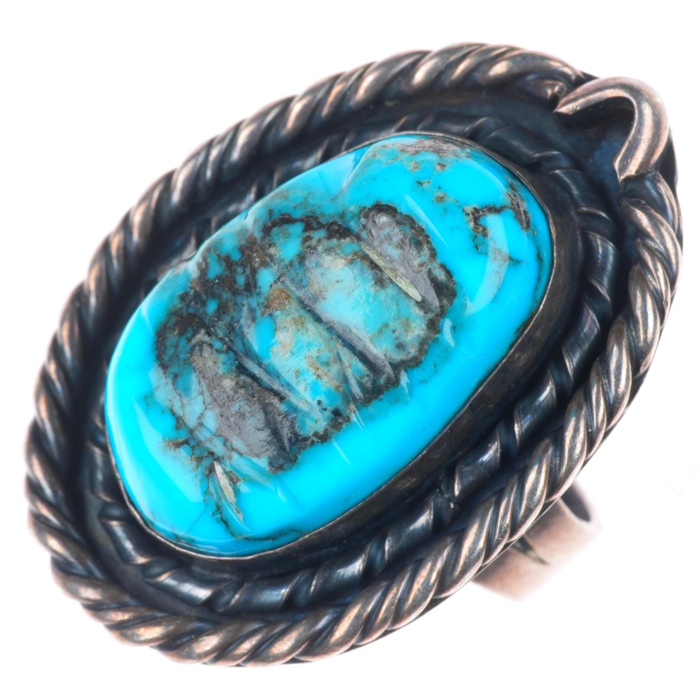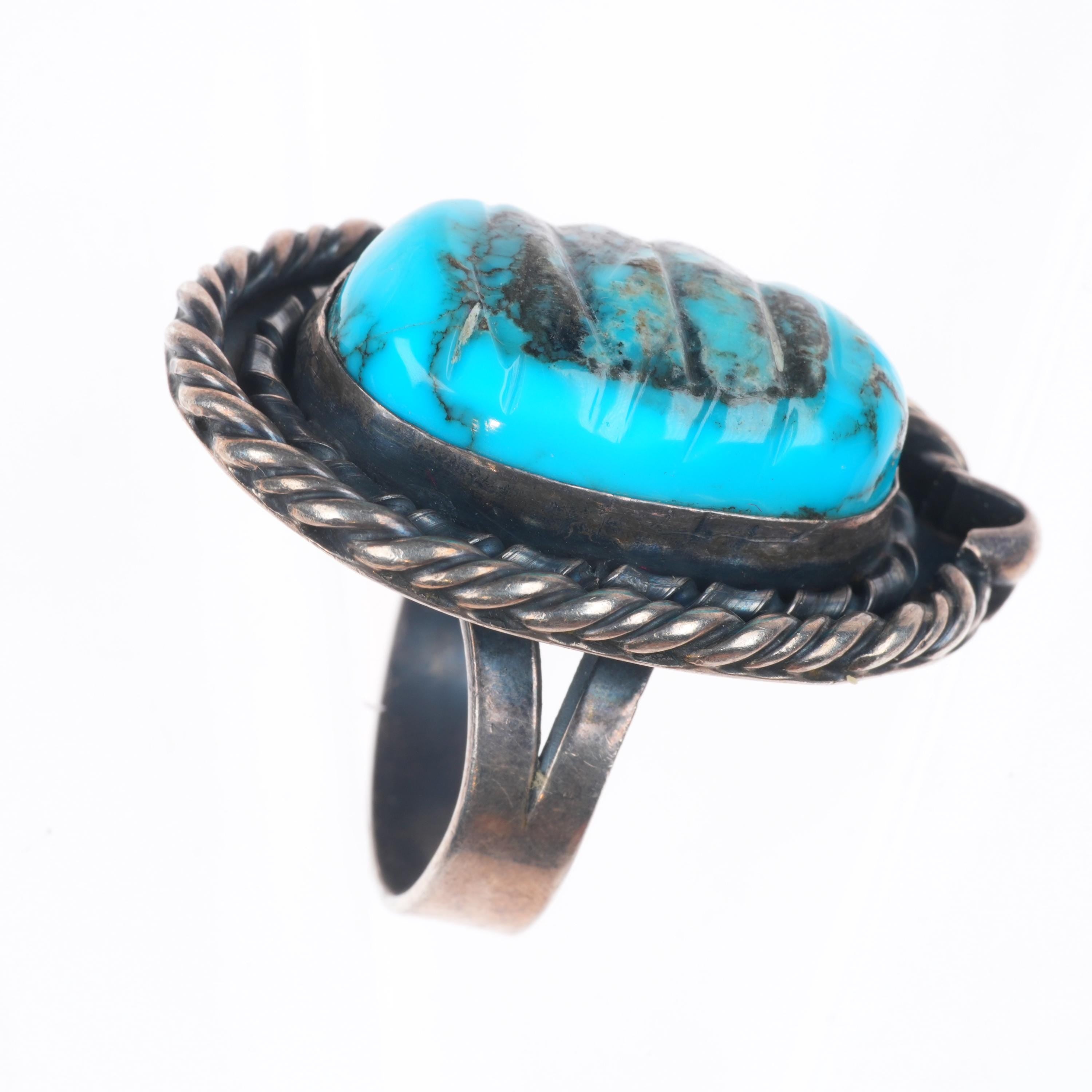 sz11 vintage Navajo carved turquoise sterling silver ring with nice matrix